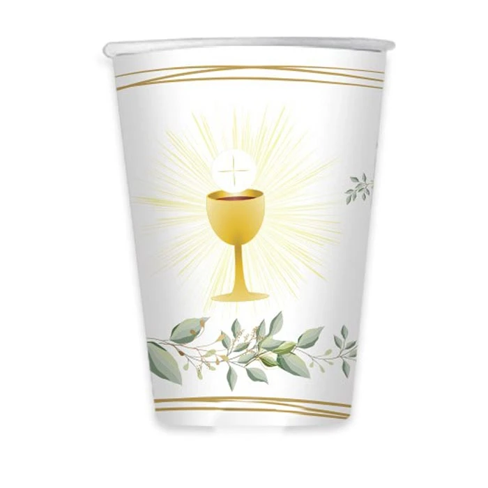confezione da 8 bicchieri di carta per comunione con simbolo calice, standard da 200cc, prodotto biodegradabile.