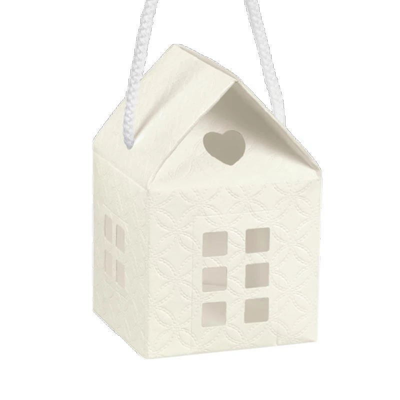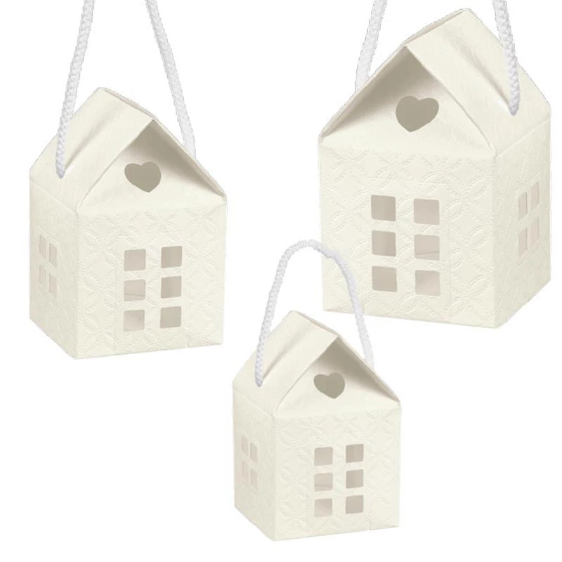 originale scatole per bomboniere a forma di casa con cordino simil shopper, colore bianche, materiale cartoncino, misure piccola 8x8x12, media 10x10x16, grande 12x12x20.