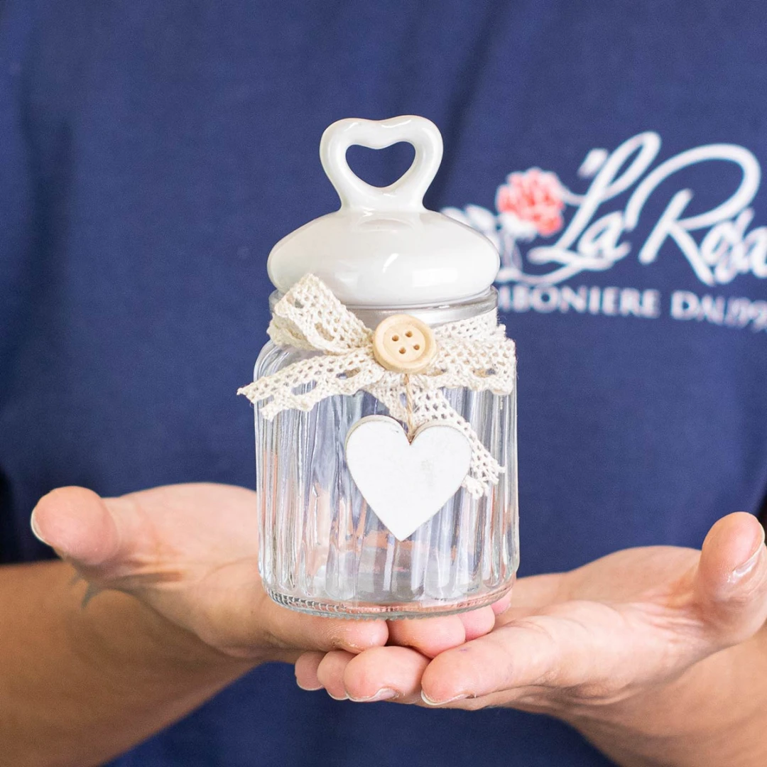 bomboniere utili barattoli ermetici con guarnizione, materiale porcellana e vetro, applicazione fiocco in trina e bottone in stile shabby chic, misura 6x12 cm, contiene 130 ml