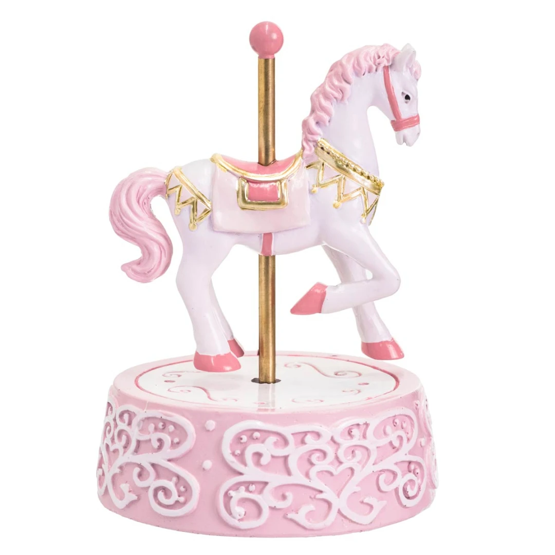 Bomboniere battesimo e nascita originali per bimba, collezione 2026, cavallini giostra rifiniti oro e rosa, scegli il modello tra piccolo 5 cm, medio 7 cm, grande 9 cm, carillon 10x14 cm.