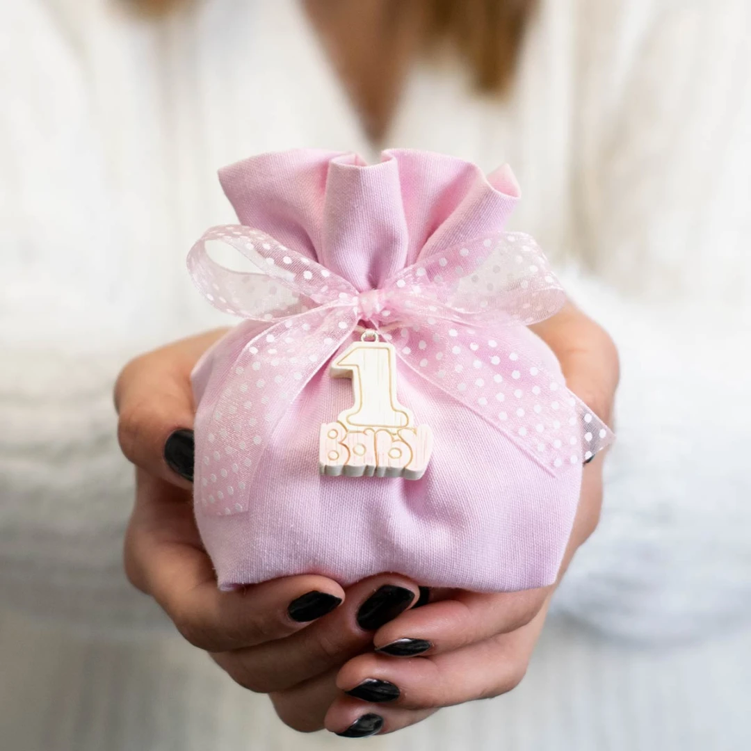 Bomboniere originali per primo compleanno per bambina, collezione 2026, ciondolo con nastrino a forma numero 1 e scritta baby rosa, misura 4 cm.