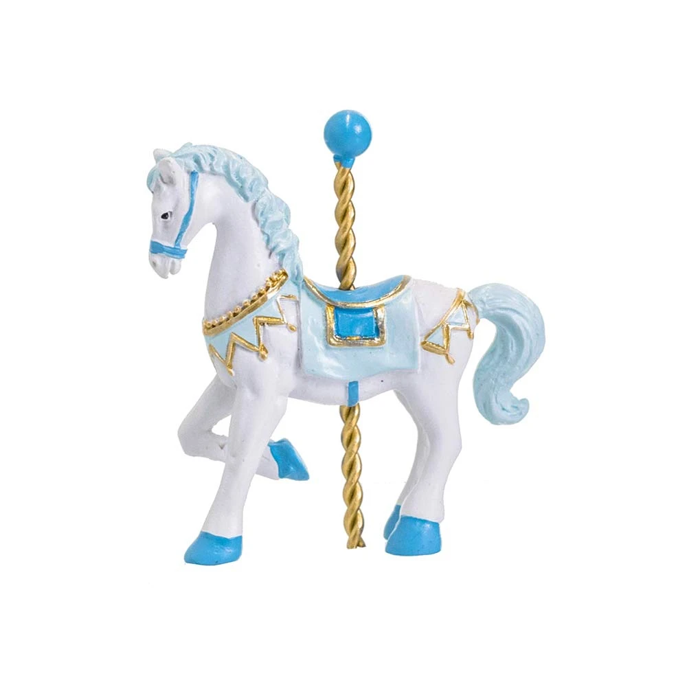 Bomboniere battesimo e nascita originali per maschio, collezione 2026, cavallini giostra rifiniti oro e azzurro, scegli il modello tra  piccolo 5 cm, medio 7 cm, grande 9 cm, carillon 10x14 cm.