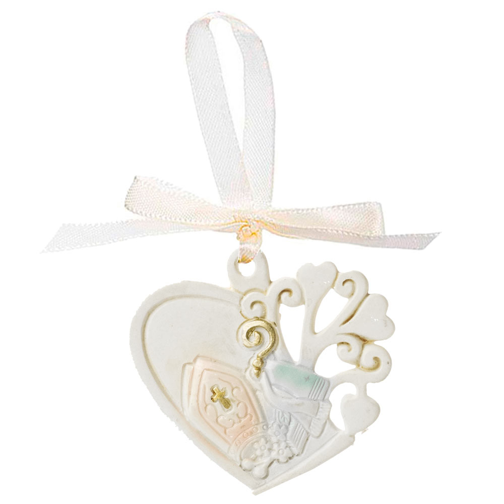 Bomboniere originali ed economiche, ciondoli a forma di cuore con albero della vita, scegli tra immagine cresima o sacra famiglia, misura 5 cm, completi di nastri