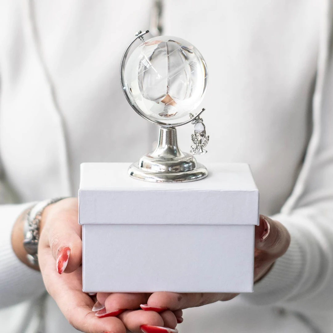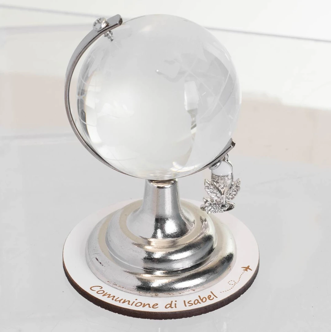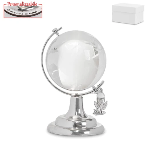 Bomboniere comunione Originali, mappamondo in cristallo e metallo, con ciondolo calice. puoi rendere unica la tua bomboniera con la base personalizzata con nome del bambino/a, misura 8 cm, completo di scatola.