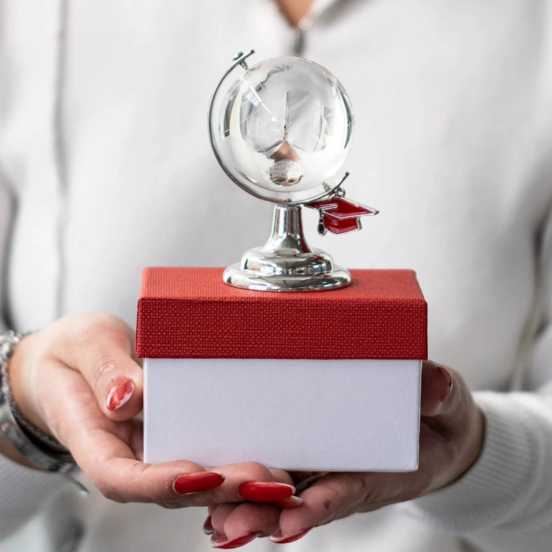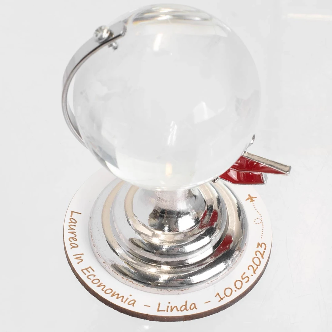 Bomboniere Laurea Originali, mappamondo in cristallo e metallo, con ciondolo simbolo tocco da laureato. puoi rendere unica la tua bomboniera con la base personalizzata con nome, facoltà, data o frase, misura 8 cm, completo di scatola.