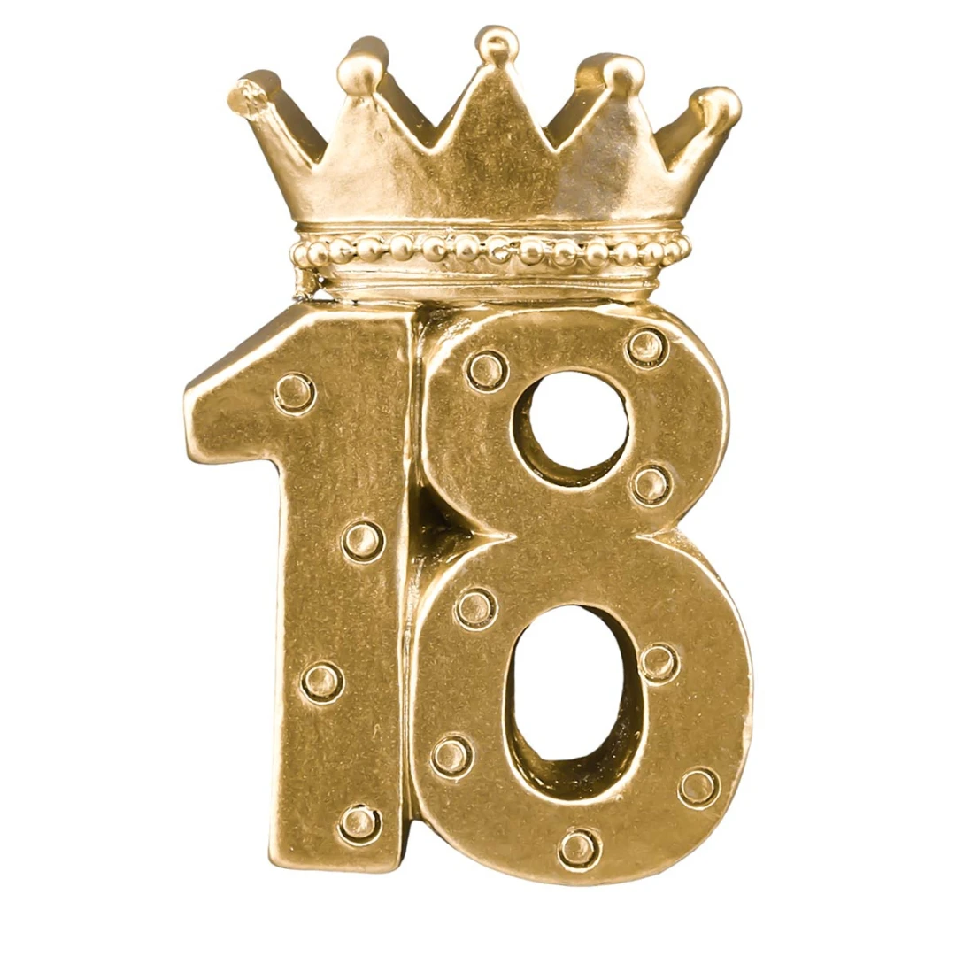 Bellissime Bomboniere 2026 per diciottesimo compleanno, Magnete numero 18° oro con dettagli corona oro in resina. Prezzo cadauno. Prodotto Artigianale. misura: 5 cm. Inoltre, è possibile aggiungere un cuore personalizzato con il proprio nome.
