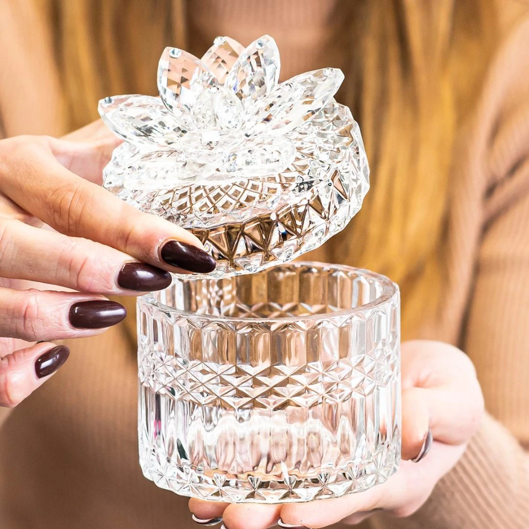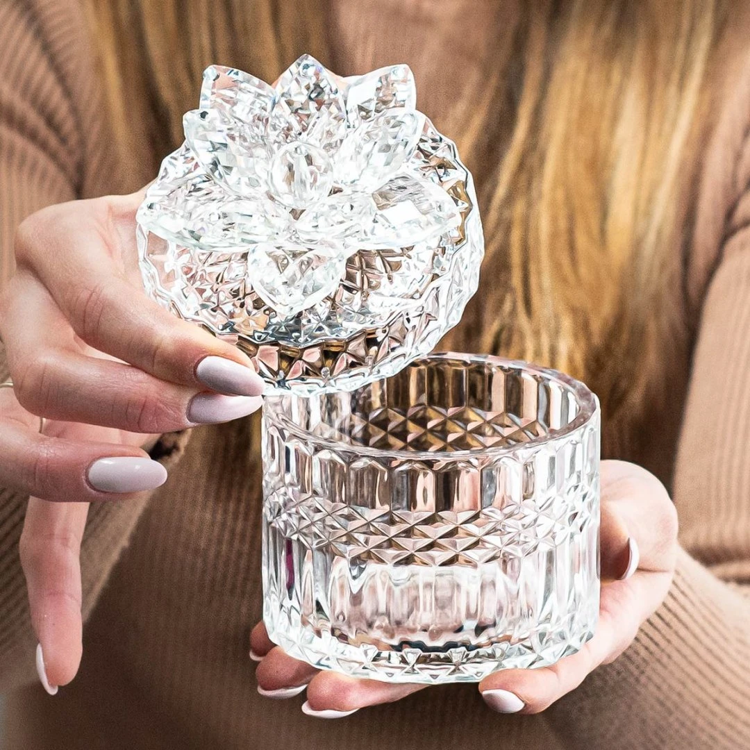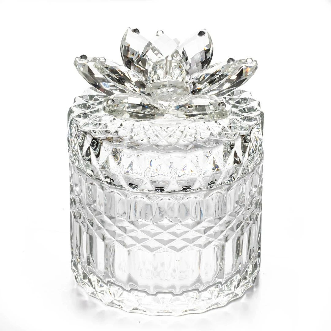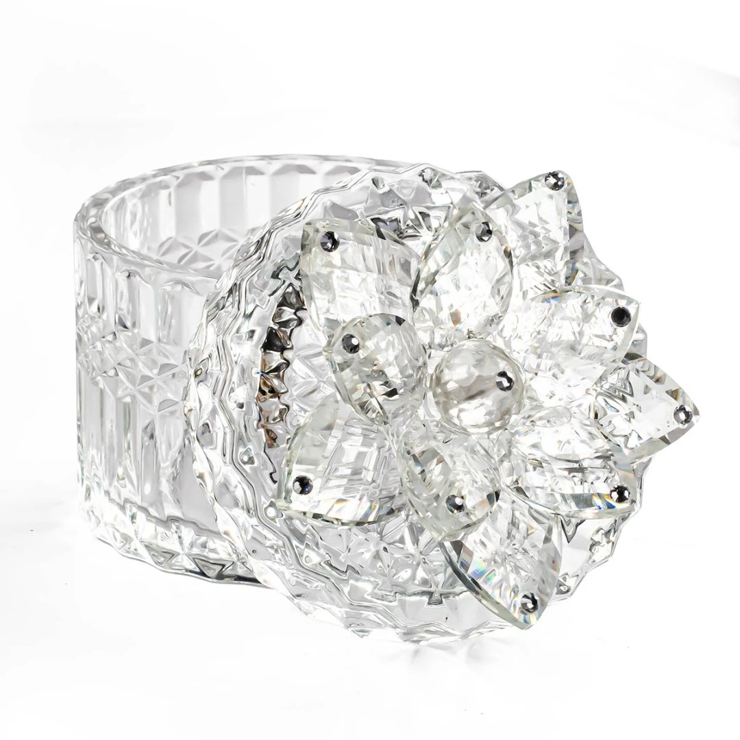 Bomboniere 2026, portagioie Diamond in vetro con tappo decorato da fiore in cristallo swarovski e punti luce, articolo di ottima qualità, dal vivo rende molto di più. completa di scatola, misura 9x9x12 cm.