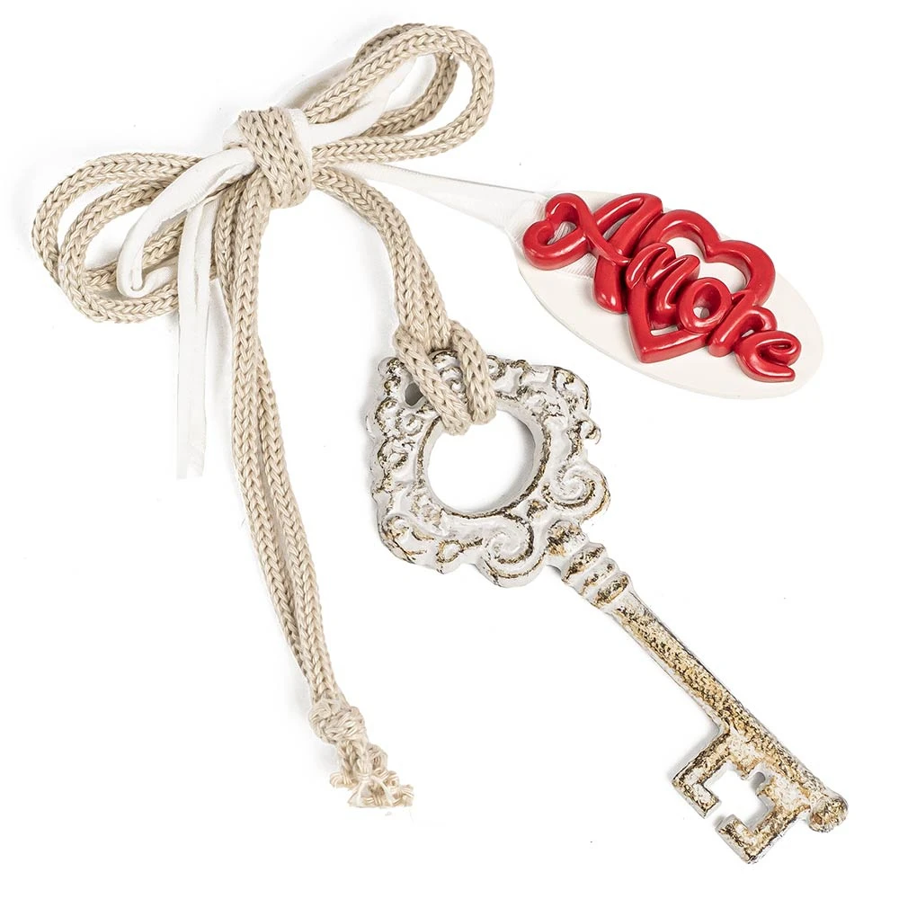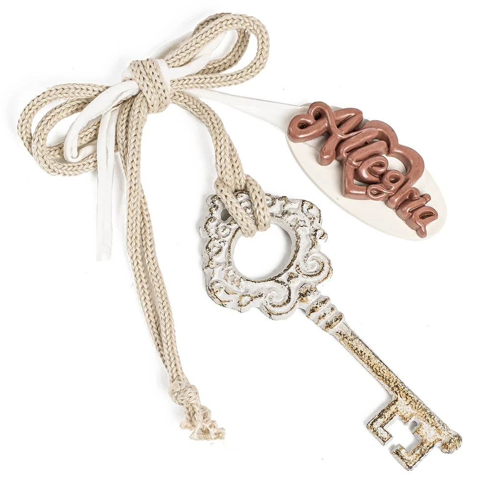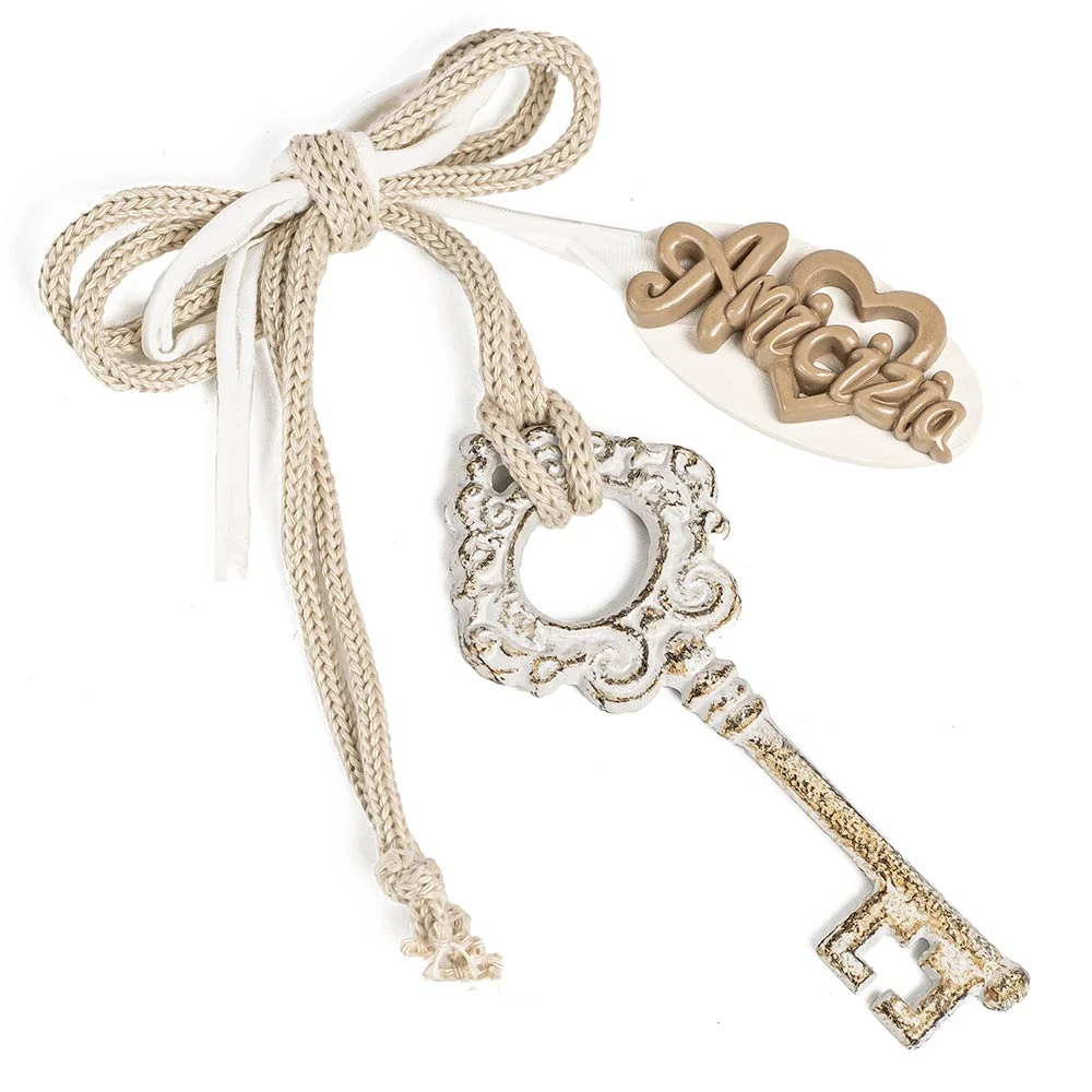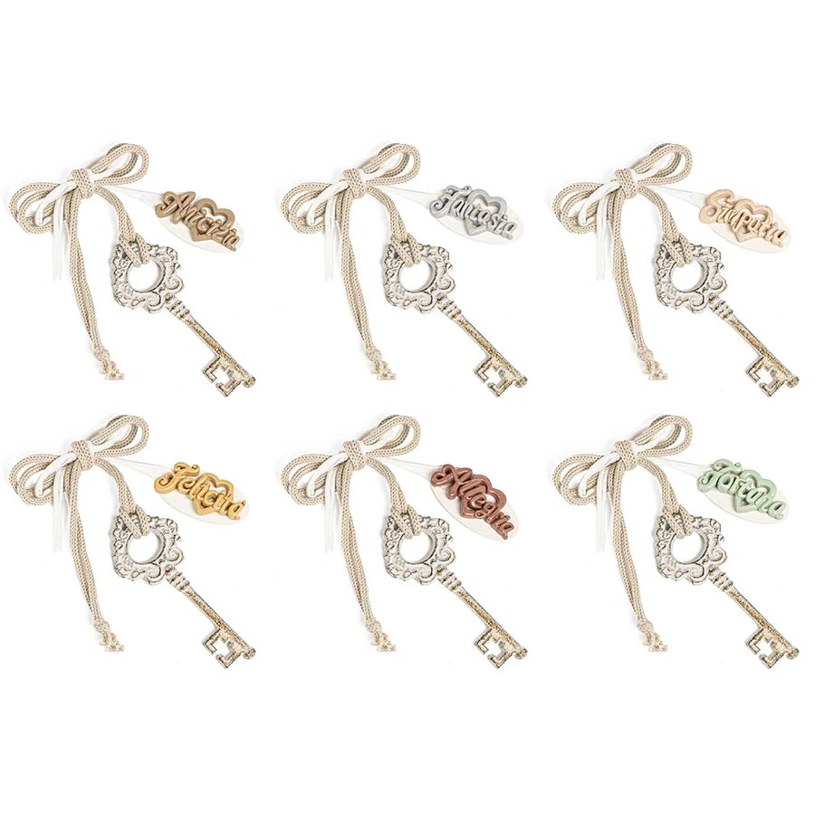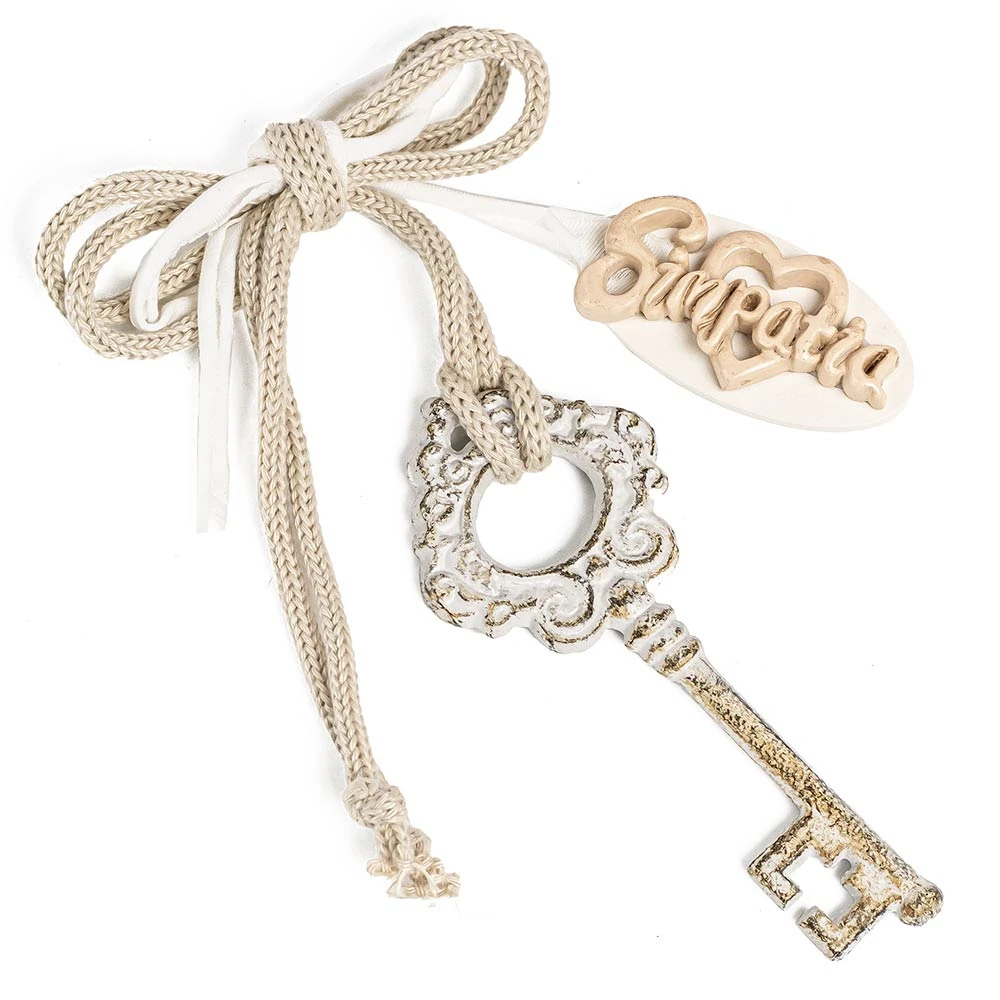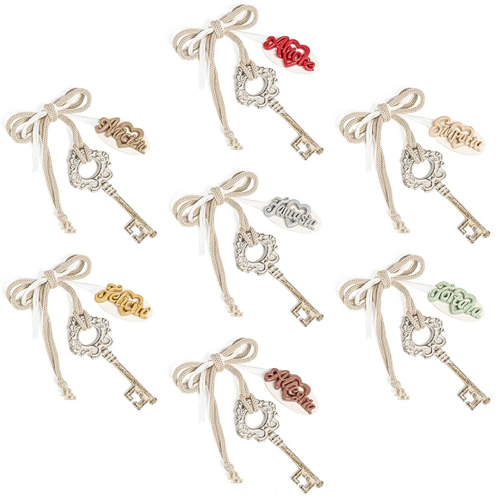 Bellissime Bomboniere 2026, Ciondolo Chiavi Portafortuna con parole in metallo e resina con cordino. Si suddividono in due modelli, uno con 6 parole ASSORTITE (Simpatia, Fantasia, Amicizia, Felicità, Allegria e Fortuna) oppure il modello SOLO Amore. Prezzo cadauno. Prodotto Artigianale.