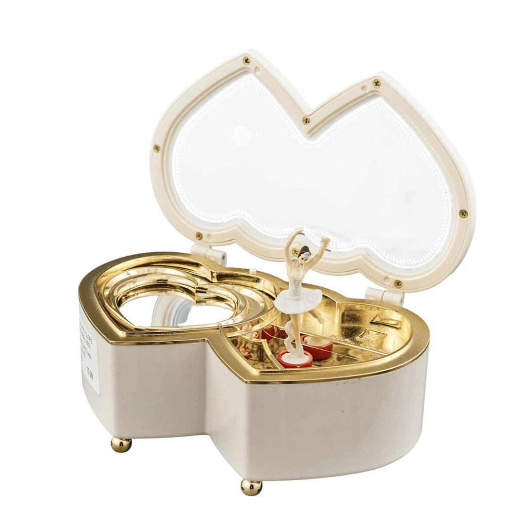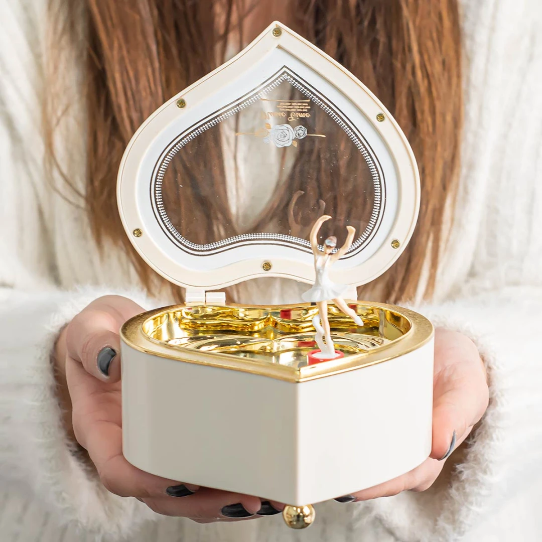 Il Carillon funziona caricandolo dalla manopola sottostante e solo quando il coperchio viene aperto, nel caso si presenti con la ballerina, essa sta in piedi grazie ad un magnete e rotea su se stessa assieme alla musica.