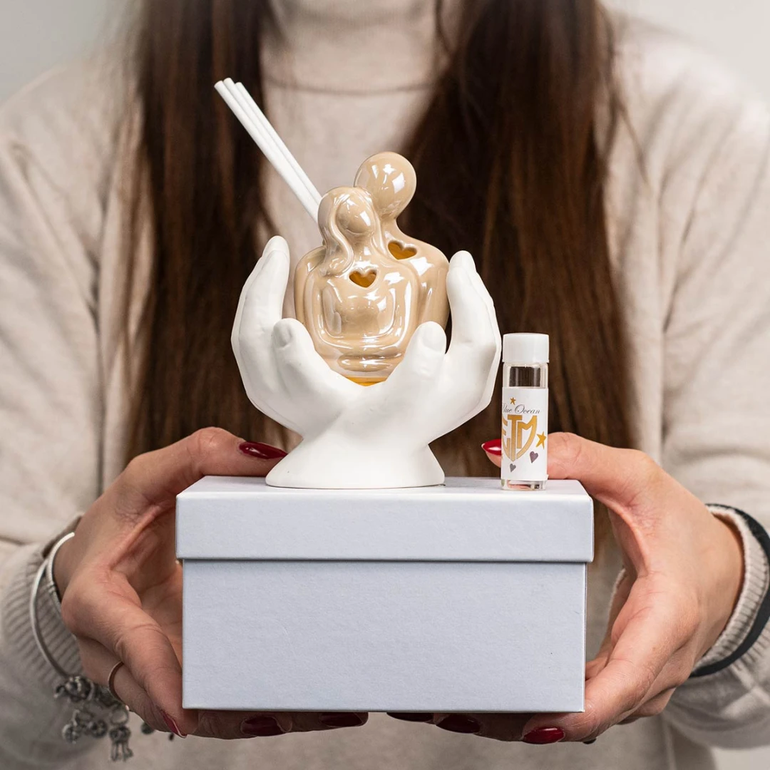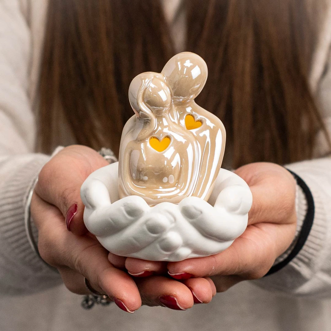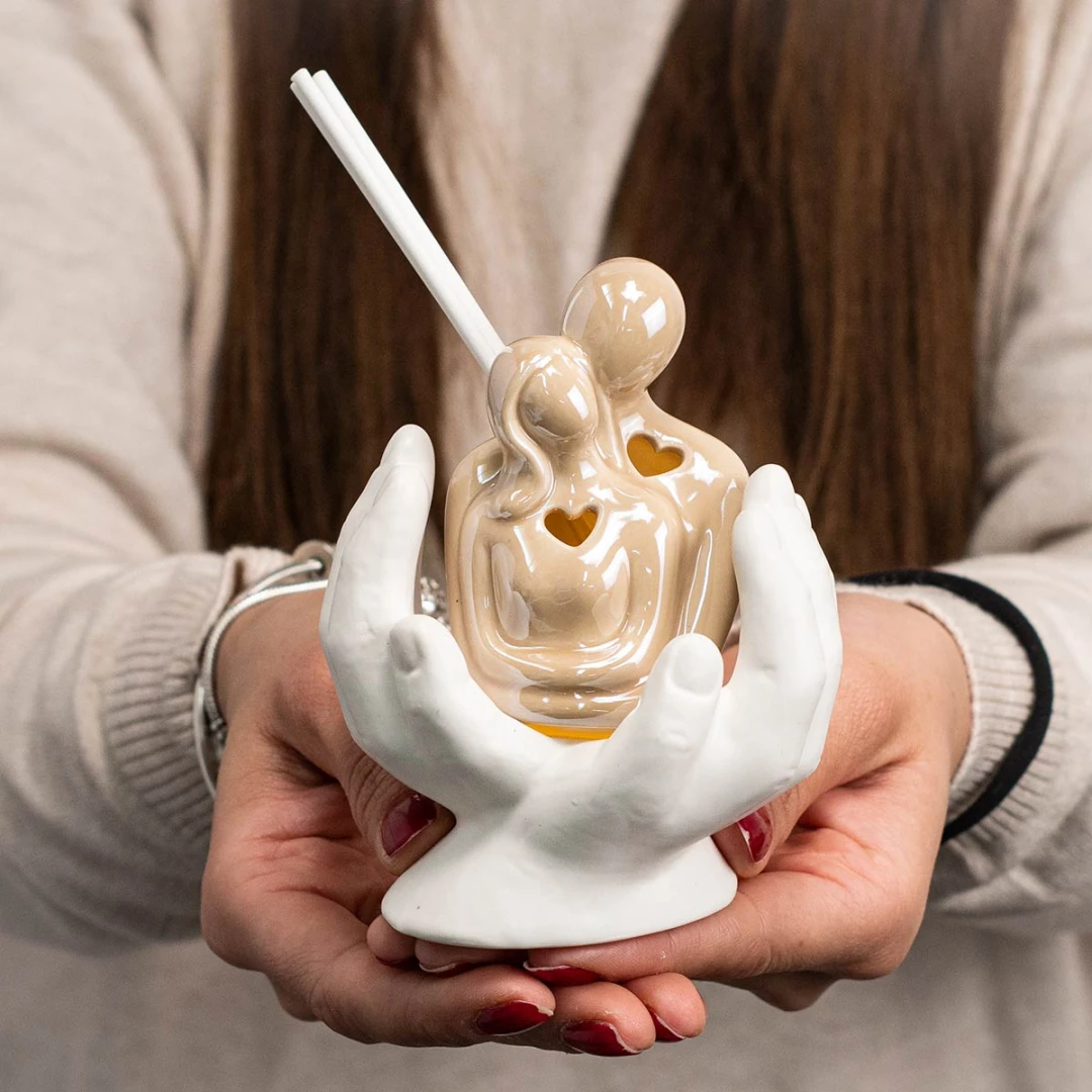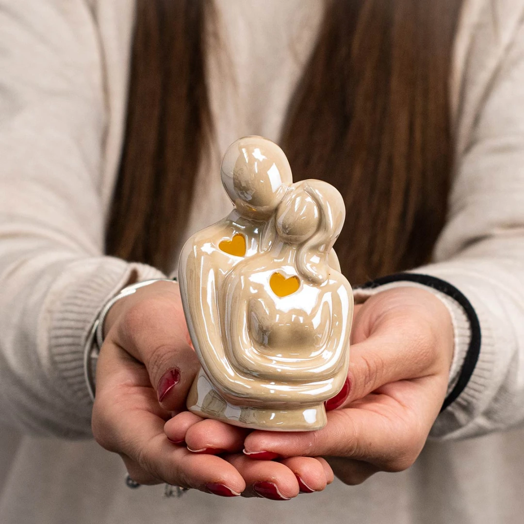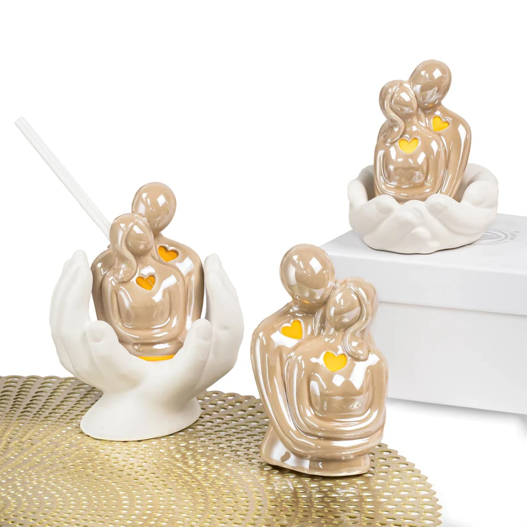 Bellissime Bomboniere 2026, Linea Abbraccio, Coppia che si abbraccia in ceramica con mani tortora. Tutti i modelli arrivano assortiti in due versioni. Nella versione Profumatore la scatola è inclusa. Prodotto Artigianale.