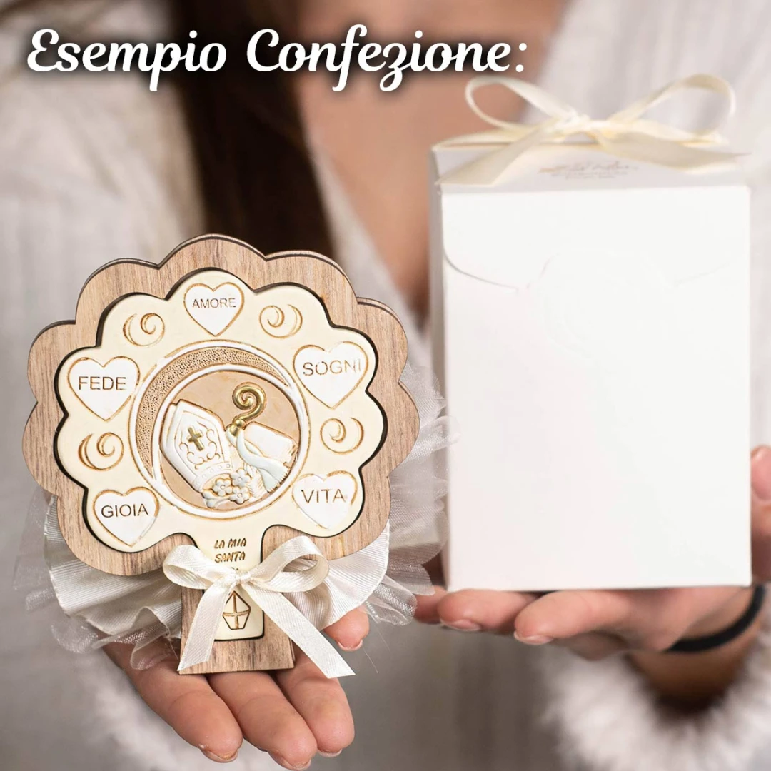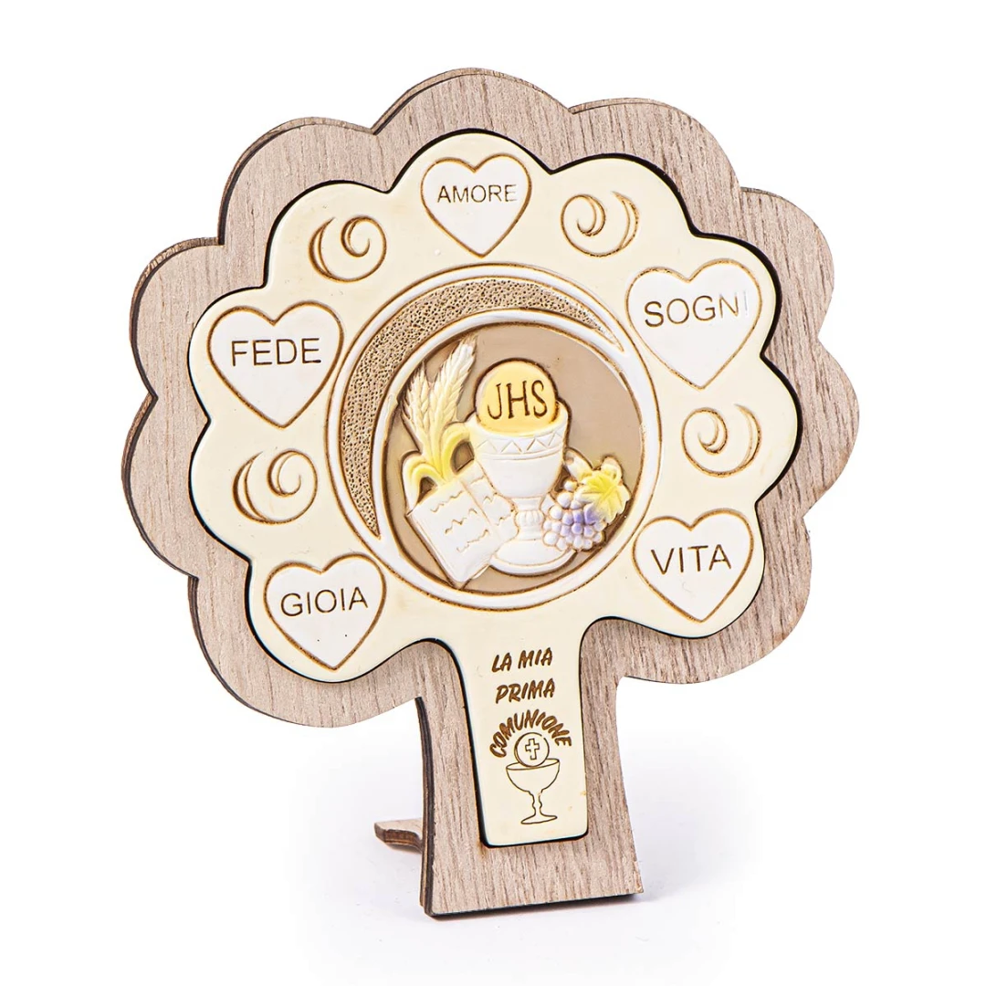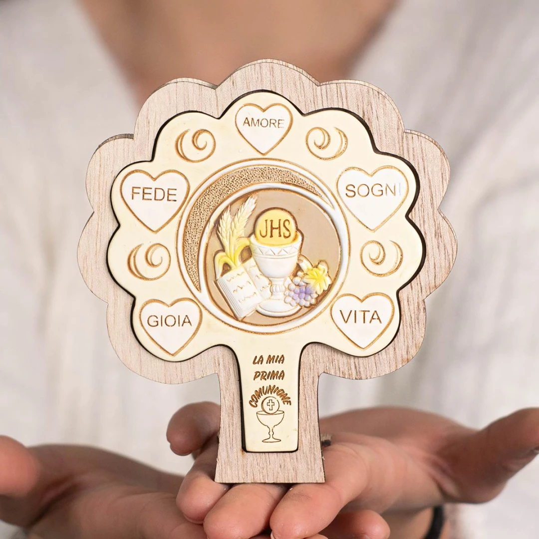 Bellissime Bomboniere 2026 per Comunione, Albero in resina e legno con calice, parole e vari decori. Prodotto Artigianale. Misura: 11,2x3,5 cm h 11,5 cm circa.