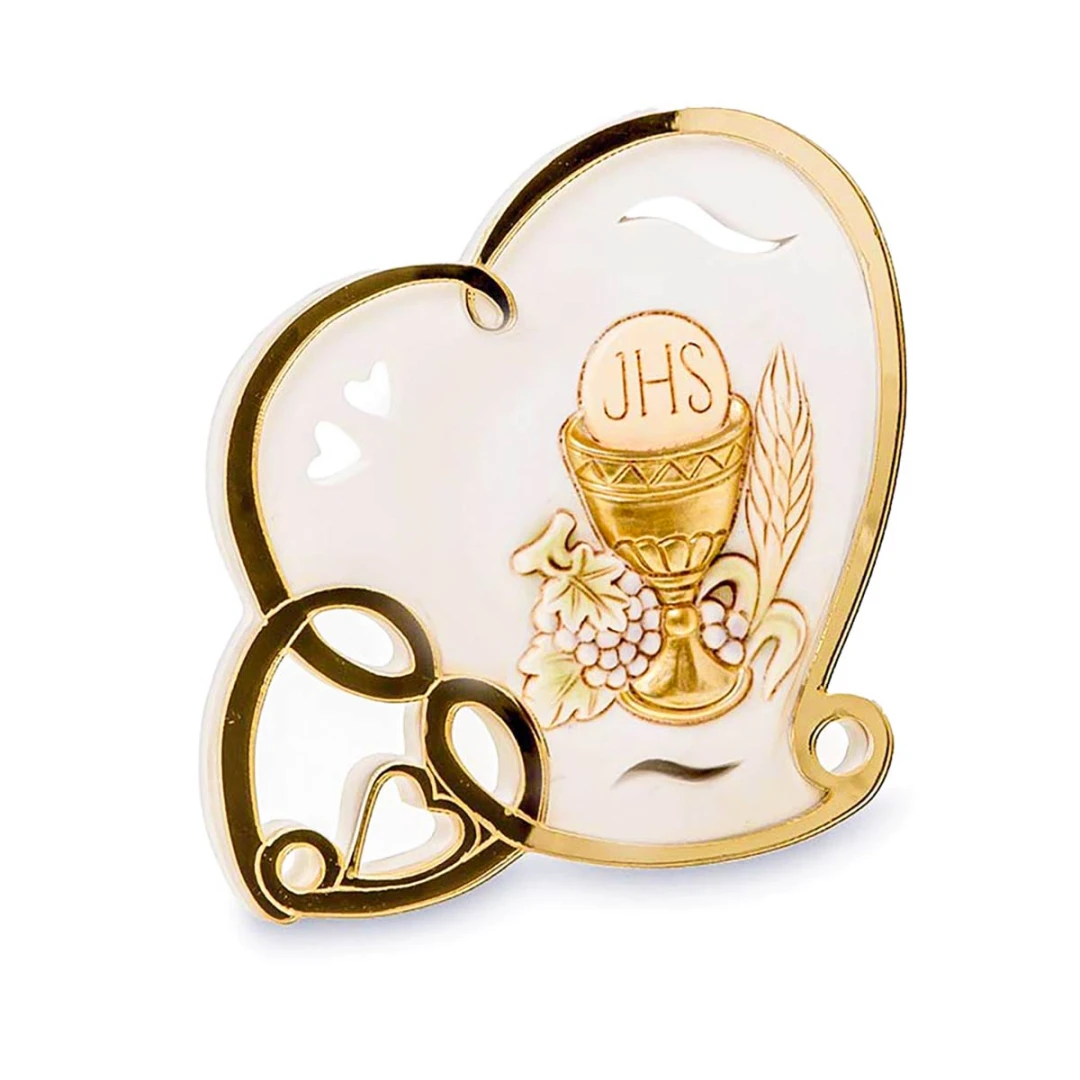 Bellissime Bomboniere 2026 per Comunione, Icona a forma di cuore con calice in resina decorata con l'acrilico. Prodotto Artigianale. Misura: 7,4 cm ed è alta 8 cm circa.
