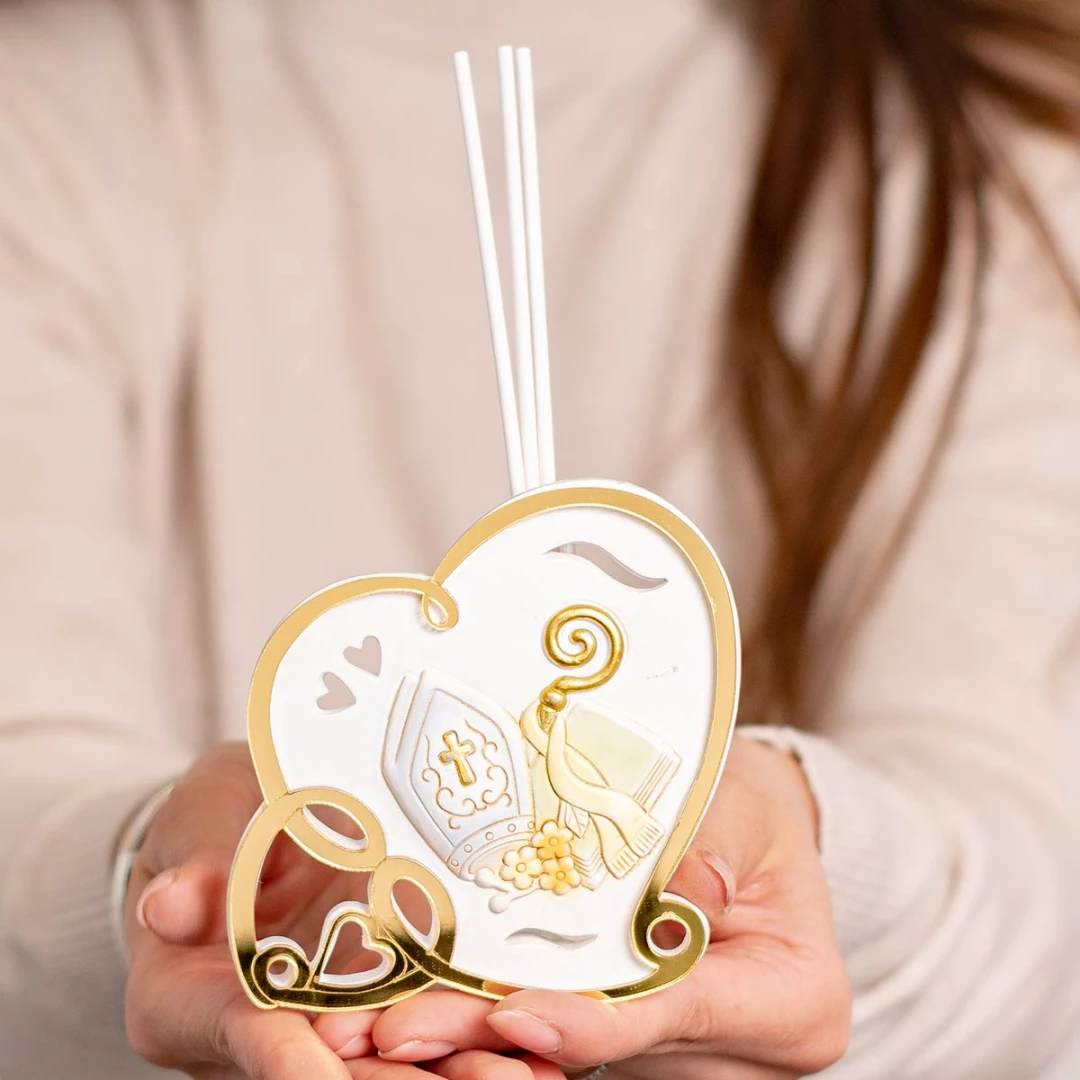 Bellissime Bomboniere 2026 Cresima, Icona Profumatore a forma di cuore con cappello e bastone in resina decorata con l'acrilico. Bacchette, Profumo e Scatola inclusi. Prodotto Artigianale. Misura: 9,2 cm ed è alta 10 cm circa | con le bacchette è alta: 18 cm circa. Puoi personalizzare la bomboniera aggiungendo un cuore inciso con il nome!