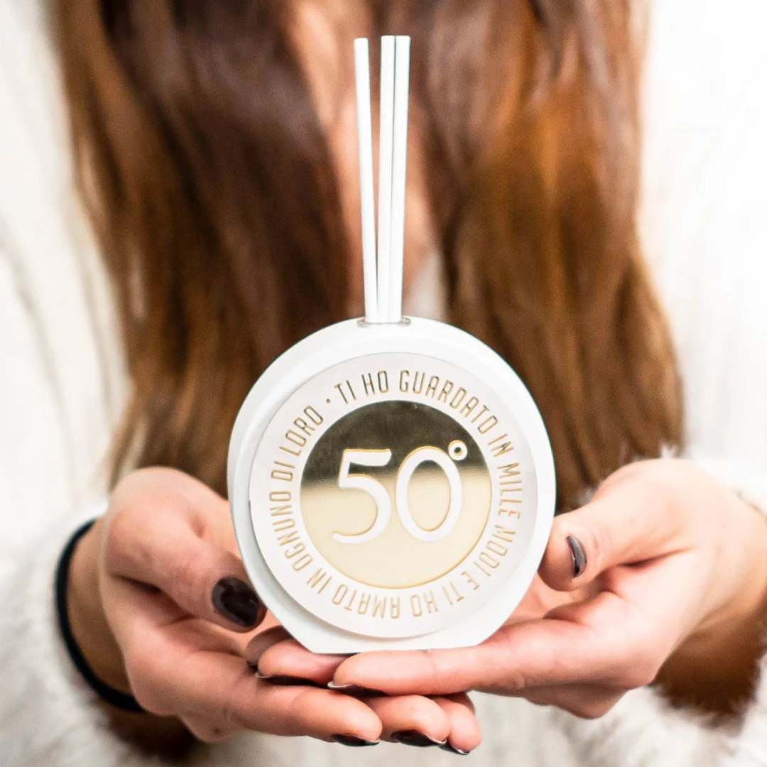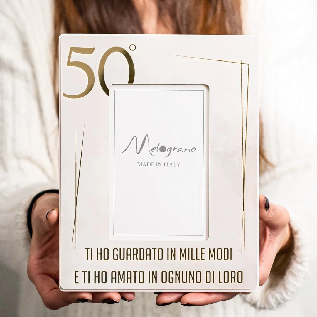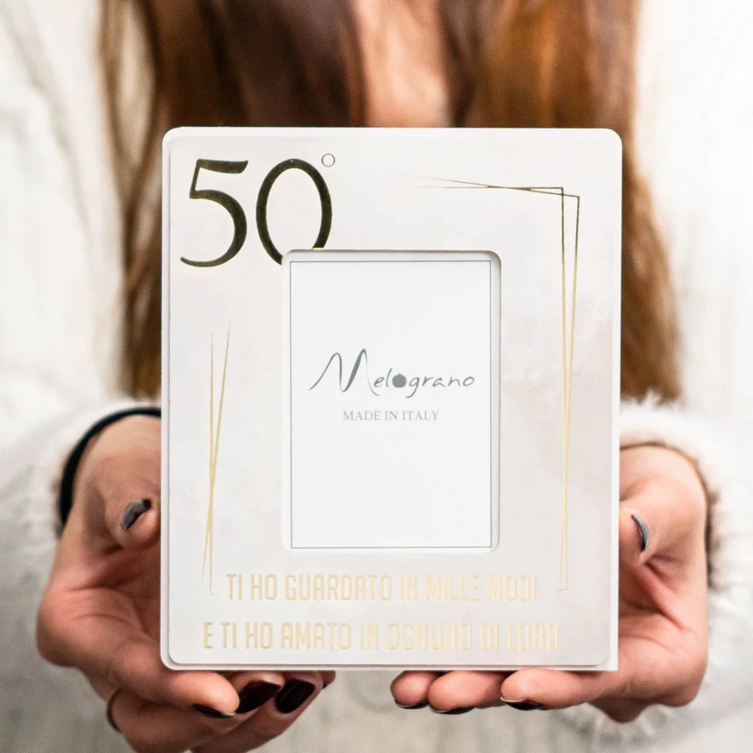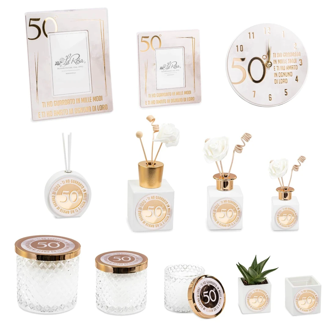 Bomboniere 2026, Linea 50° Anniversario Oro con Portafoto, Profumatori, Candele, Vasi ed Orologio con numero 50 e frase "Ti ho guardato in mille modi e ti ho amato in ognuno di loro" materiale resina e plexiglass oro, articoli di ottima qualità, dal vivo rendono molto di più, disponibili in diversi modelli. completi di scatola e certificato di qualità (per profumatori anche bacchette e profumo).