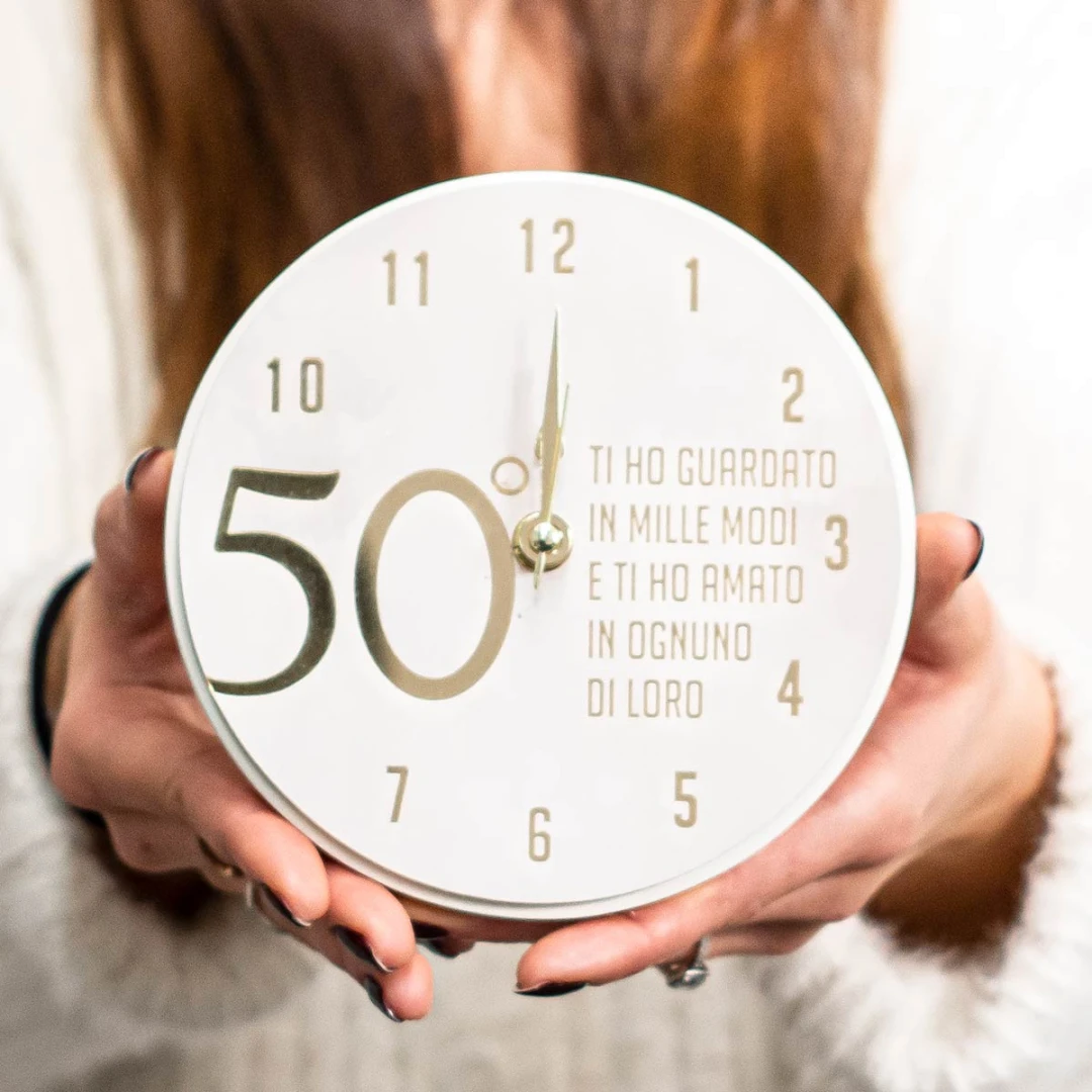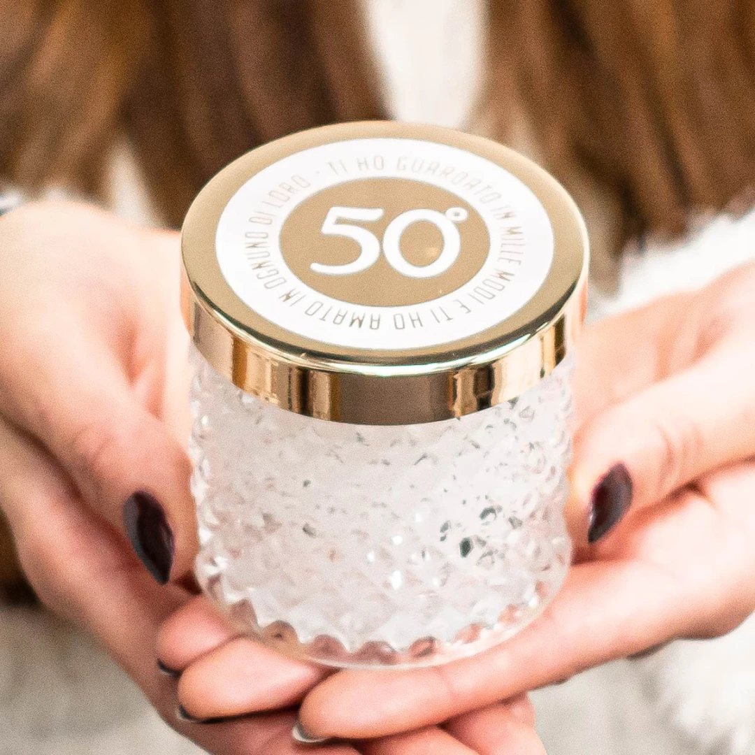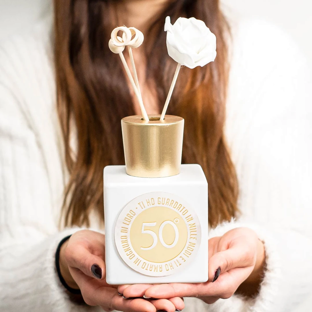 Bomboniere 2026, Linea 50° Anniversario Oro con Portafoto, Profumatori, Candele, Vasi ed Orologio con numero 50 e frase "Ti ho guardato in mille modi e ti ho amato in ognuno di loro" materiale resina e plexiglass oro, articoli di ottima qualità, dal vivo rendono molto di più, disponibili in diversi modelli. completi di scatola e certificato di qualità (per profumatori anche bacchette e profumo).