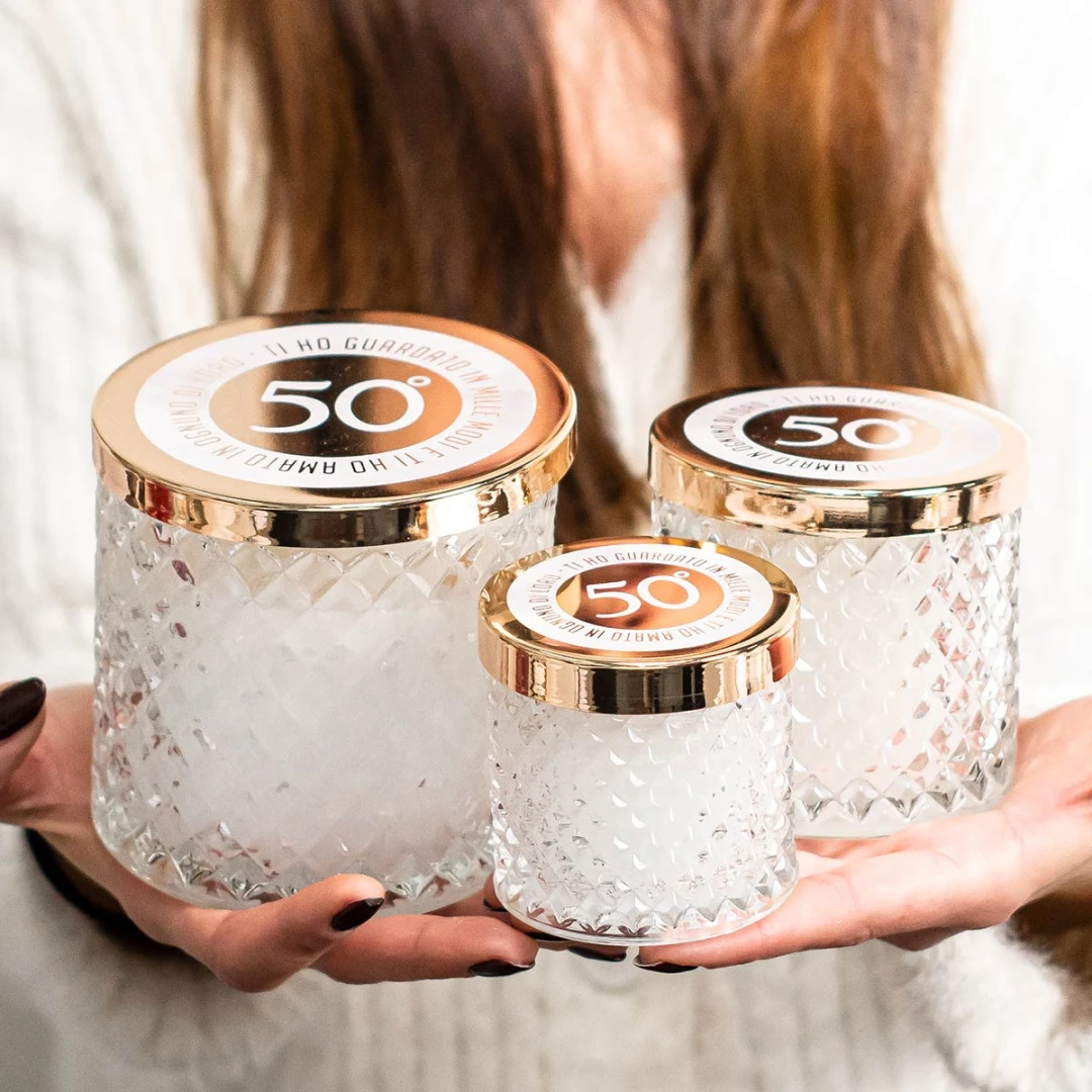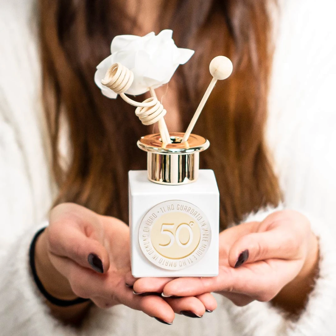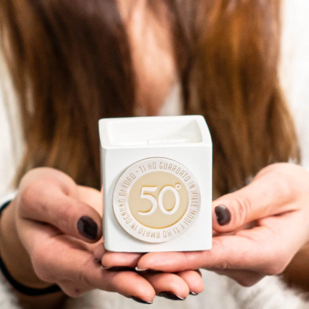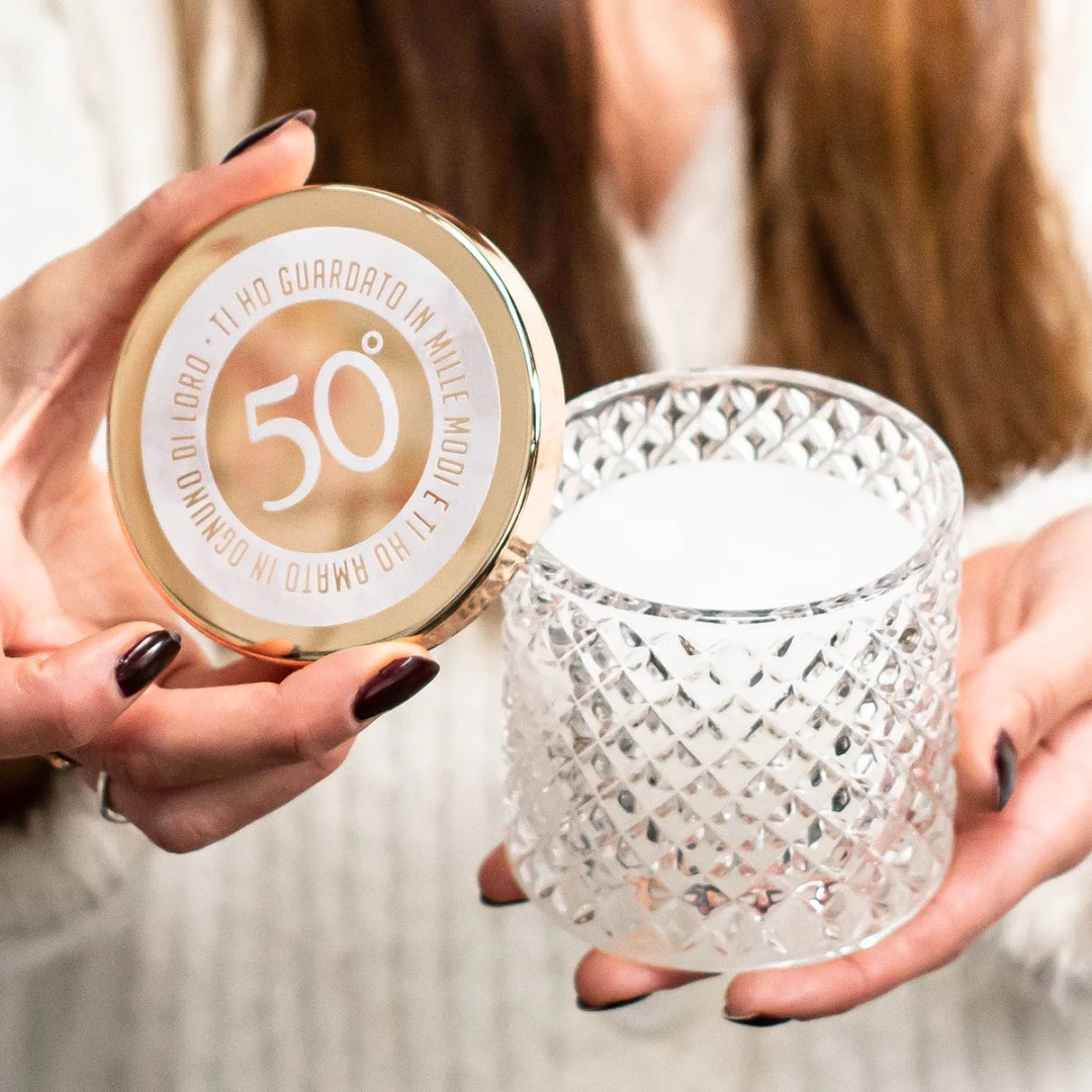 Bomboniere 2026, Linea 50° Anniversario Oro con Portafoto, Profumatori, Candele, Vasi ed Orologio con numero 50 e frase "Ti ho guardato in mille modi e ti ho amato in ognuno di loro" materiale resina e plexiglass oro, articoli di ottima qualità, dal vivo rendono molto di più, disponibili in diversi modelli. completi di scatola e certificato di qualità (per profumatori anche bacchette e profumo).
