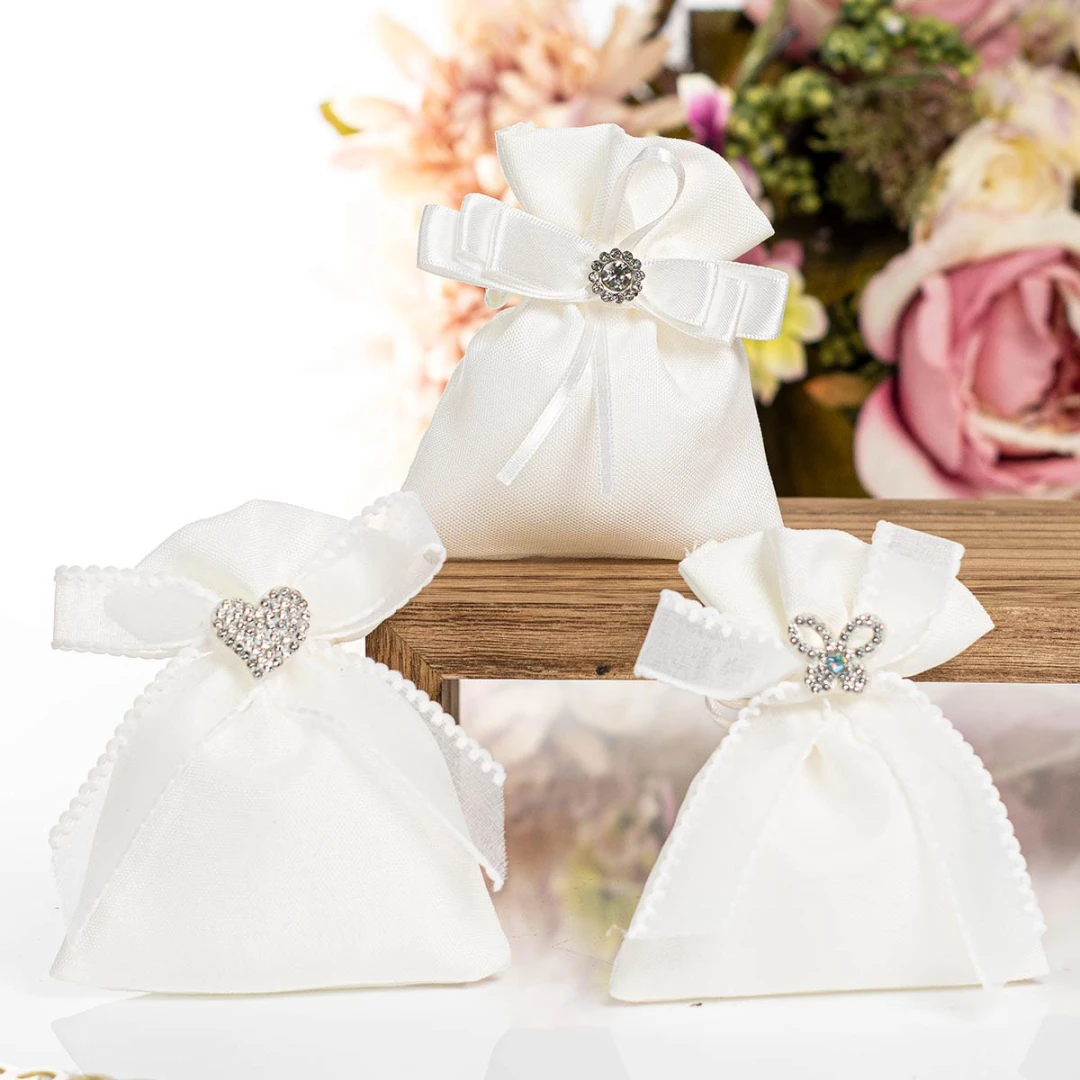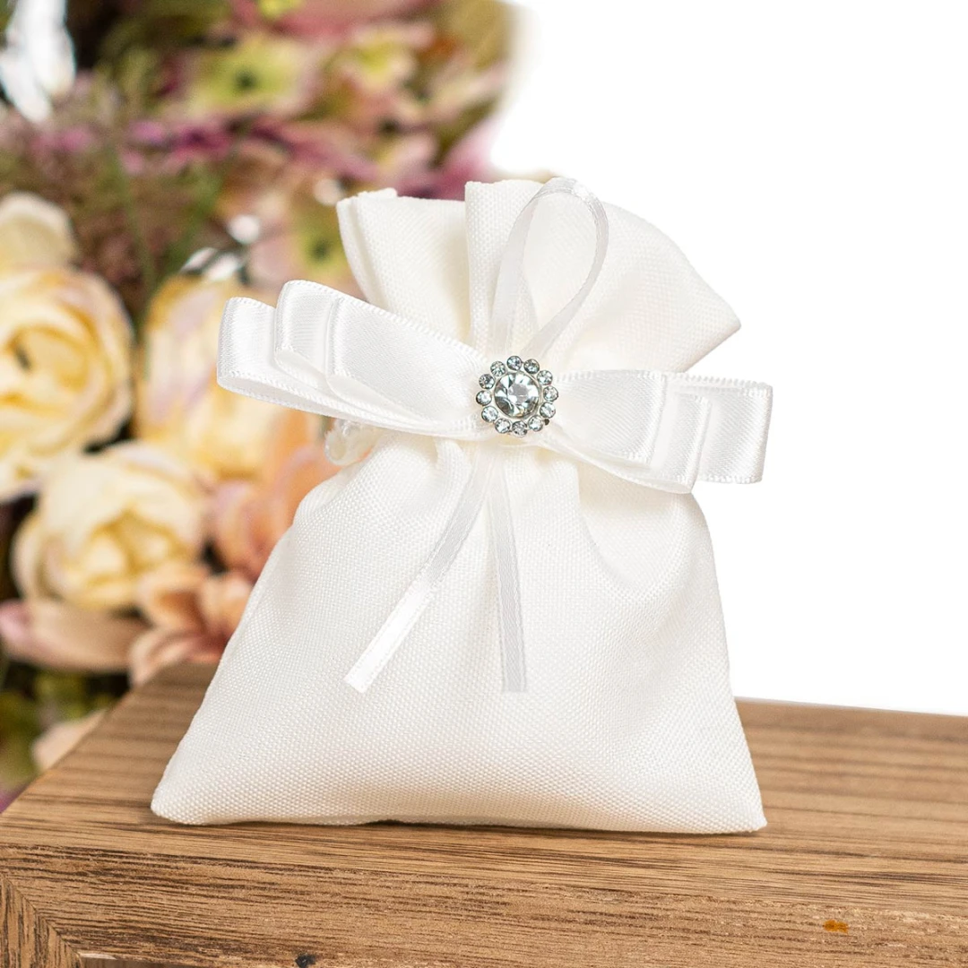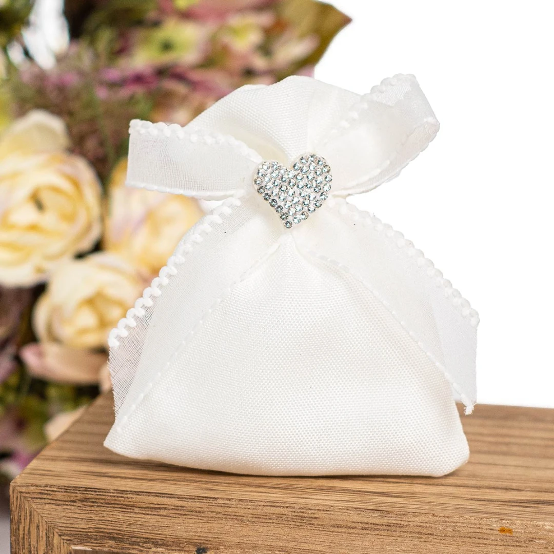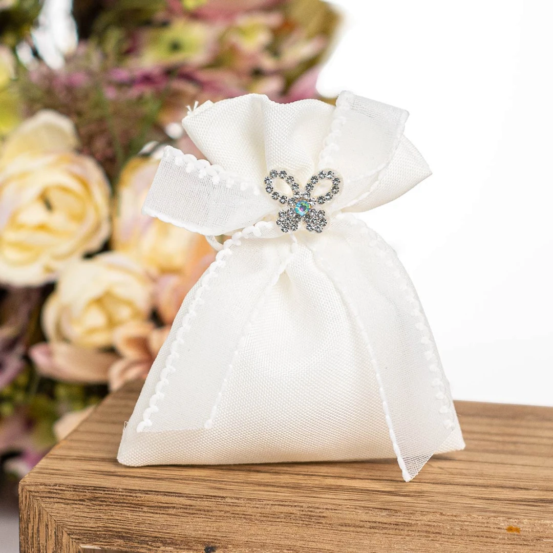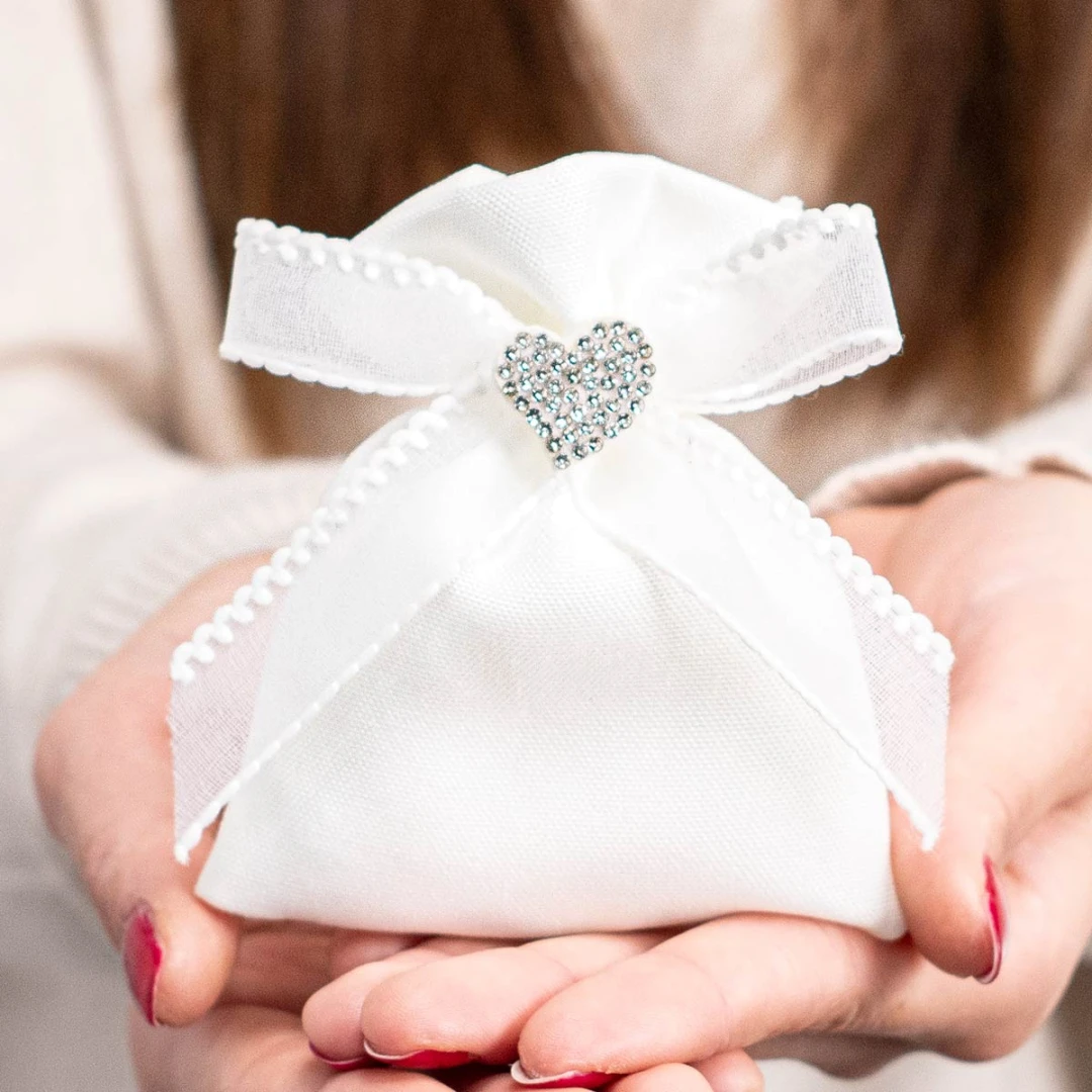 Bellissime Bomboniere 2026, Linea Brilla, Sacchettini Portaconfetti Bianchi e dettaglio con brillantini (nel Diamante cambia lo stile del fiocchino). Puoi scegliere fra alcuni modelli (Cuore, Farfalla e Diamante). Prezzo cadauno. Prodotto Artigianale.