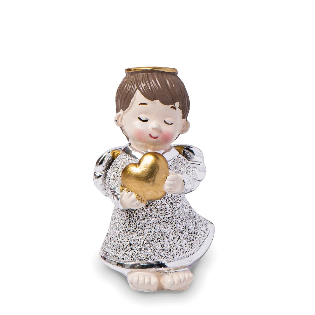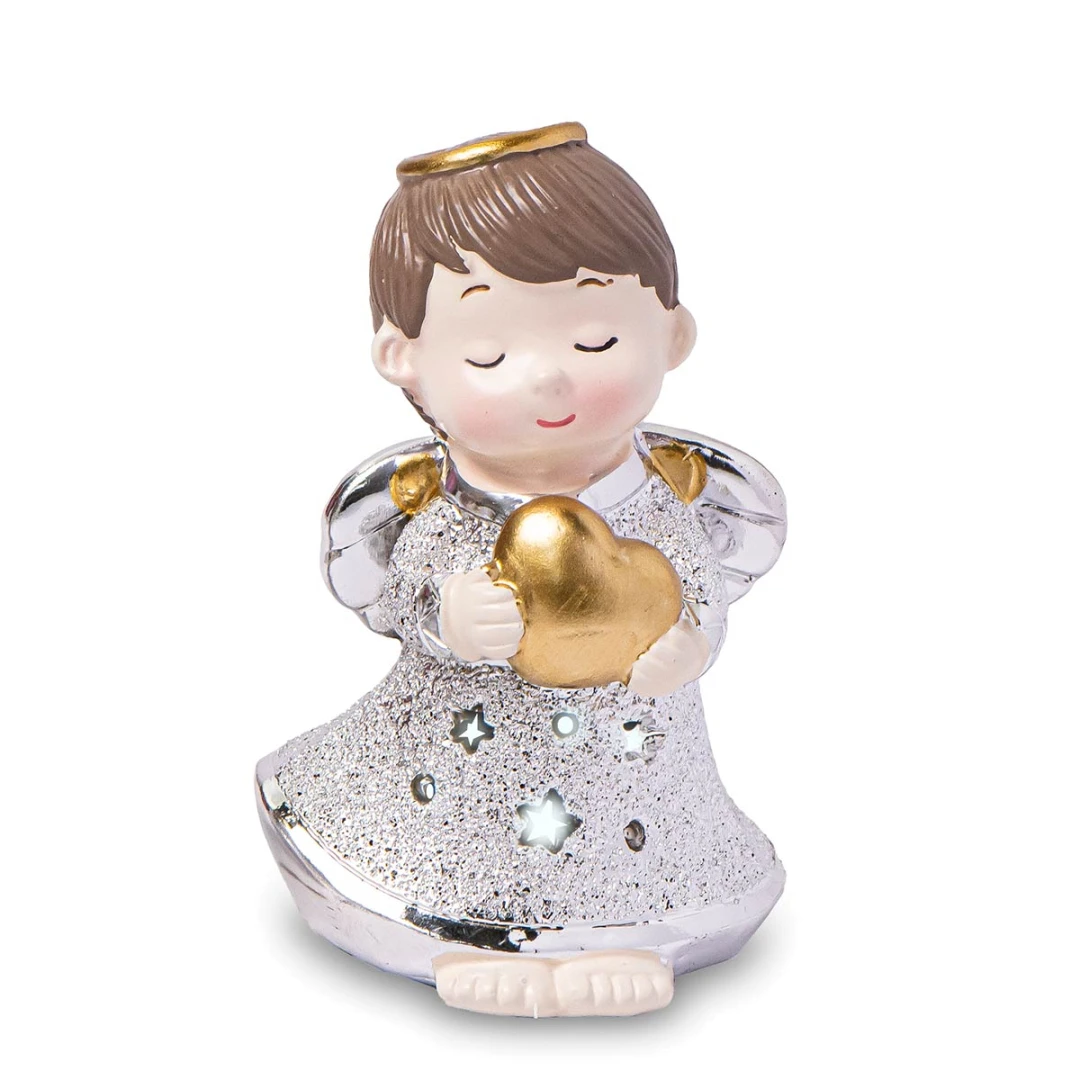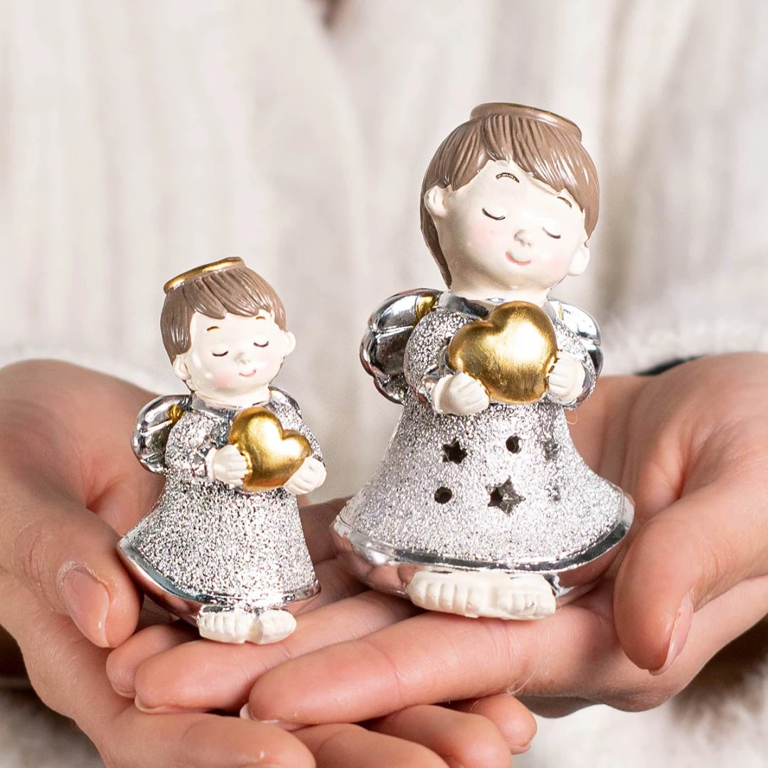 Bellissime Bomboniere 2026, Linea Coeur Angeli argentati con cuore oro in resina, Luce LED e statuina. Per ogni prodotto ci sono 2 modelli assortiti tra loro. Prezzo cadauno. Prodotto Artigianale. Puoi personalizzare la bomboniera aggiungendo la base incisa con il nome!