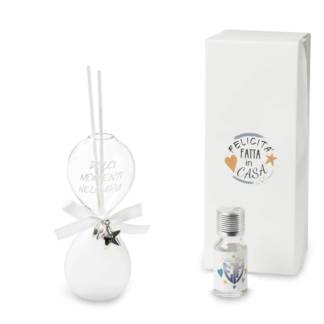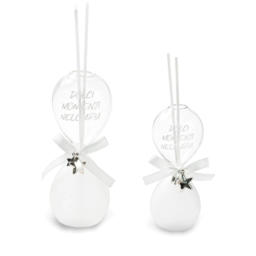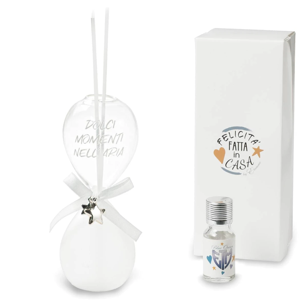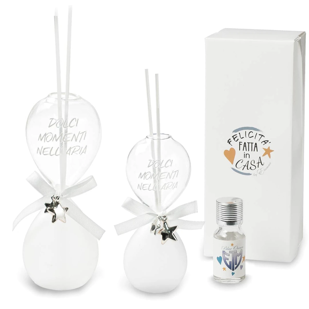 Bellissime Bomboniere 2026, Linea Due Stelle, Profumatore a forma di clessidra con frase "Dolci momenti nell'aria" e fiocco bianco con ciondolo stelline. Bacchette, Profumo e Scatola inclusi. Prezzo cadauno. Prodotto Artigianale.