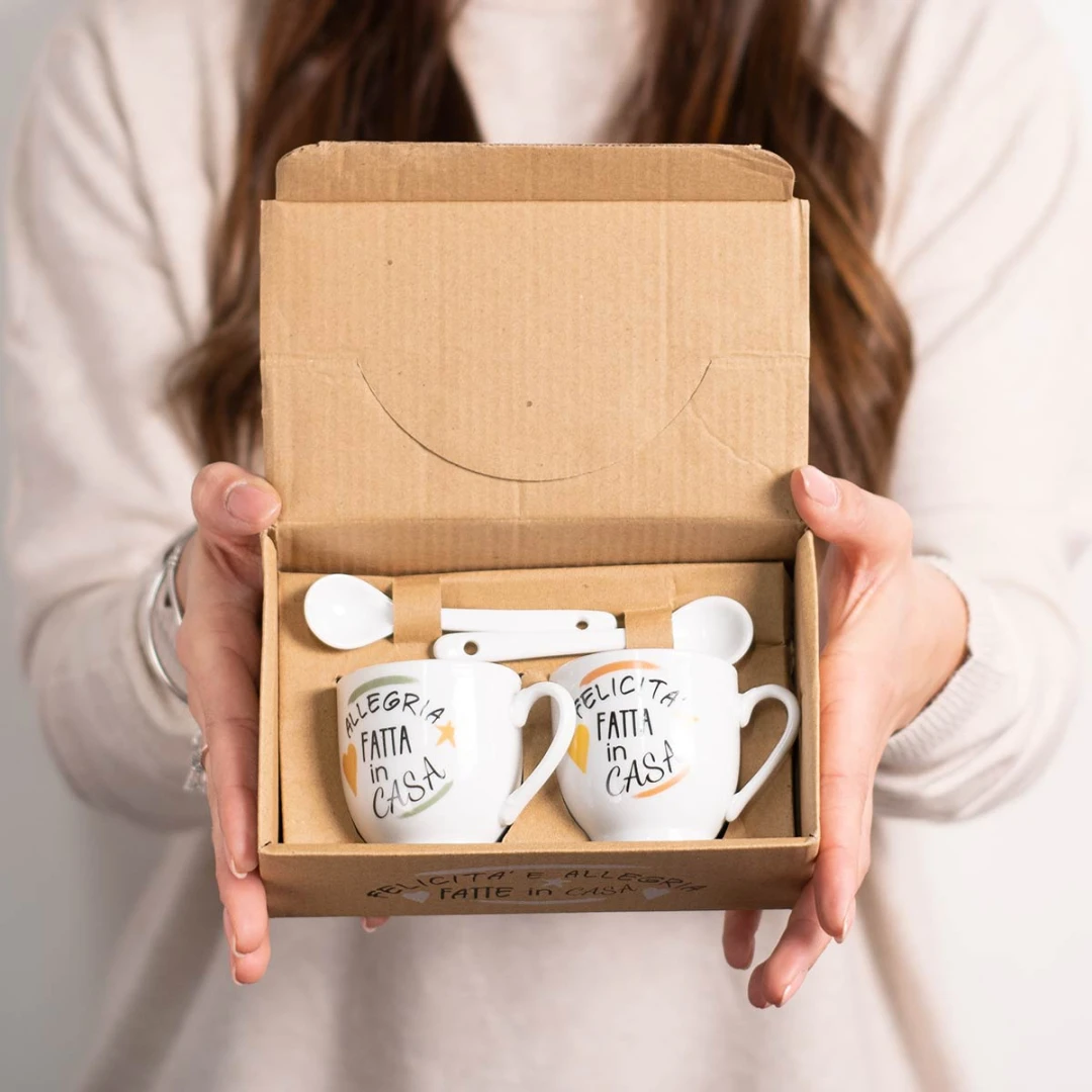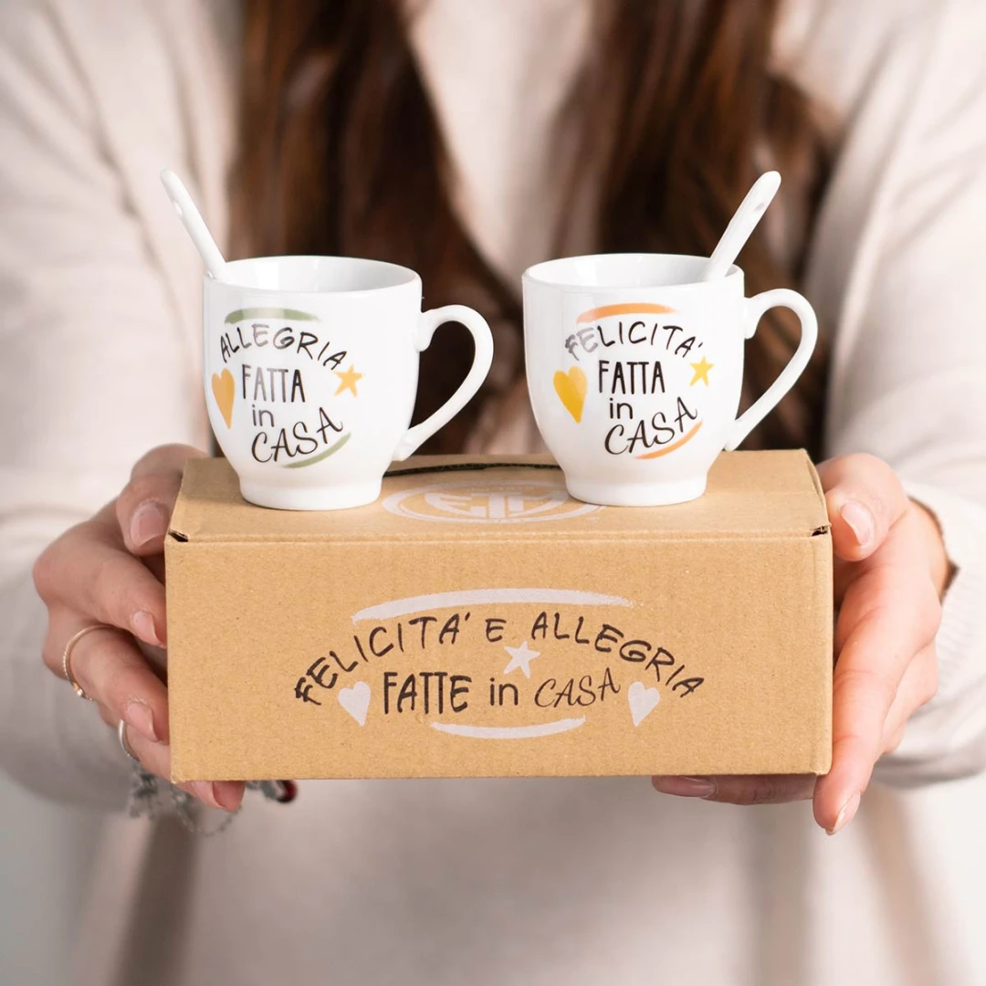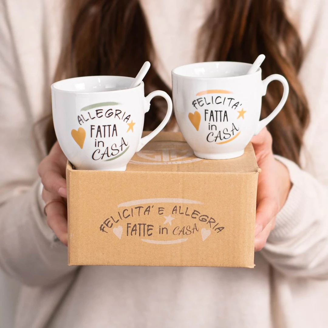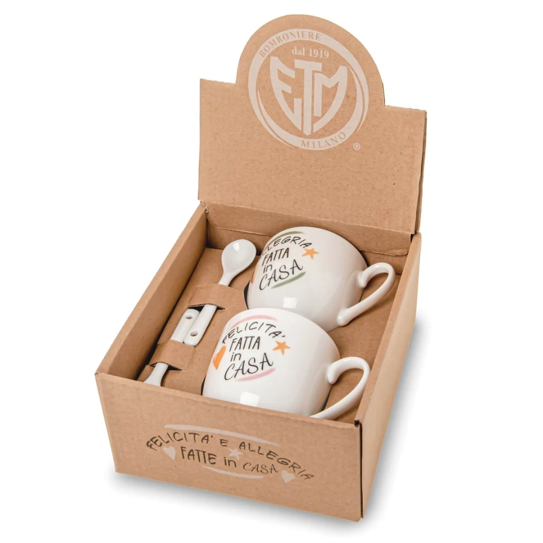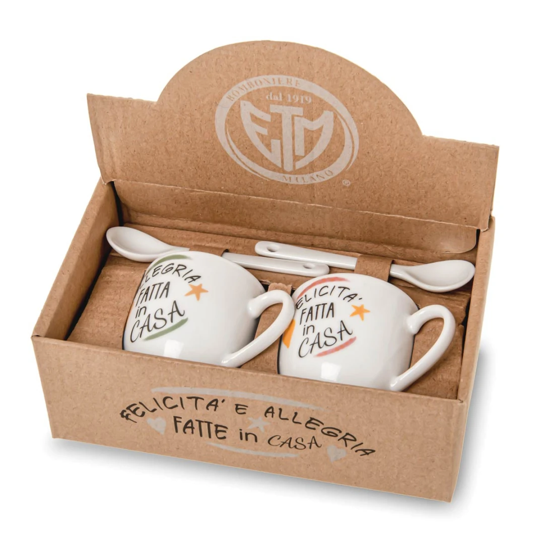 Originali Bomboniere 2026, Set di tazzine in porcellana per caffè e tè con frasi, complete di cucchiaino e scatola. Prodotto Artigianale.