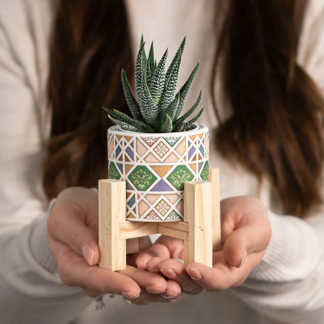 Bellissime Bomboniere 2026, Linea Giglius, Vasi Portapiantina in ceramica con sostegno in legno e fantasia maioliche. Questi prodotti vengono assortiti in 3 fantasie diverse. Prezzo cadauno. Prodotto Artigianale.
