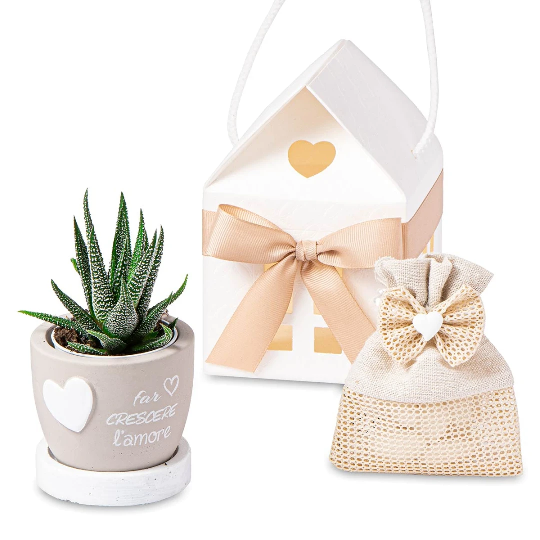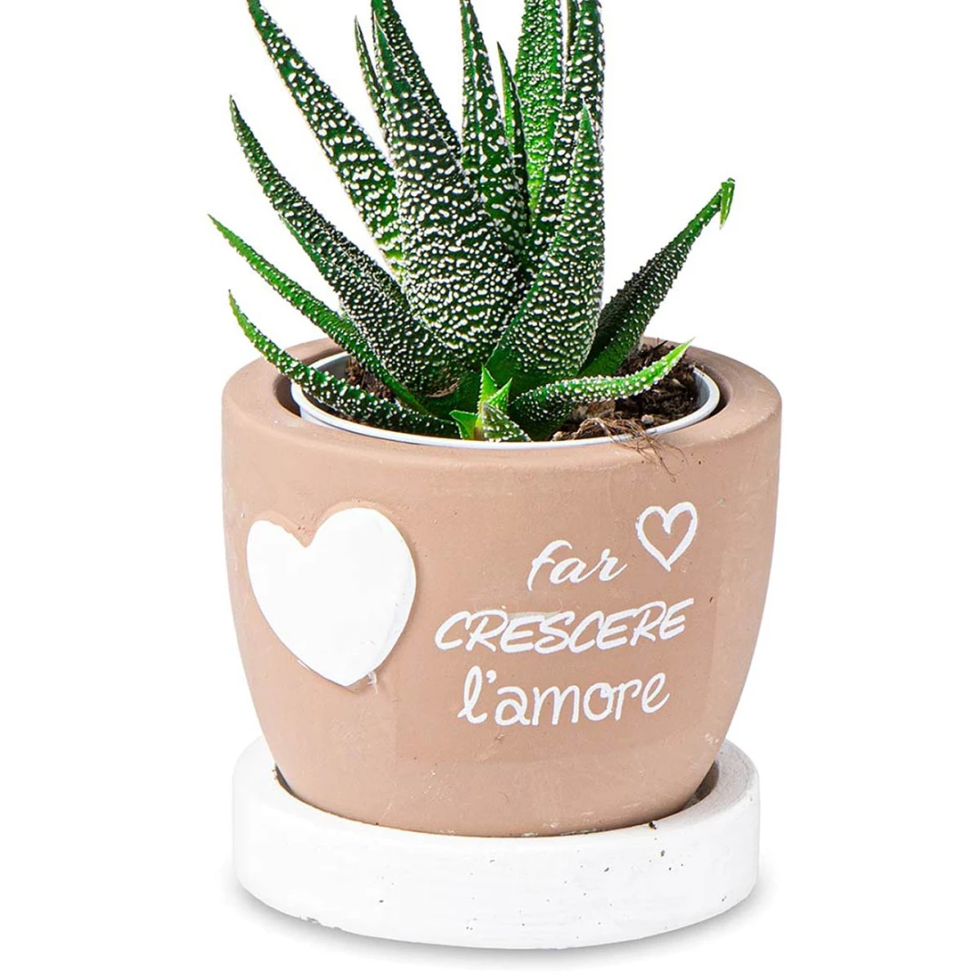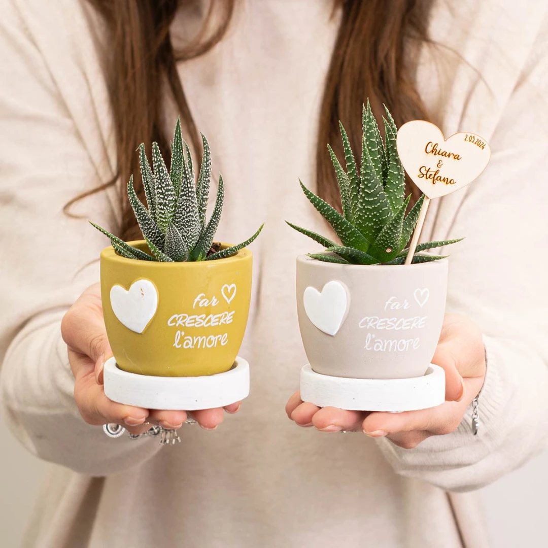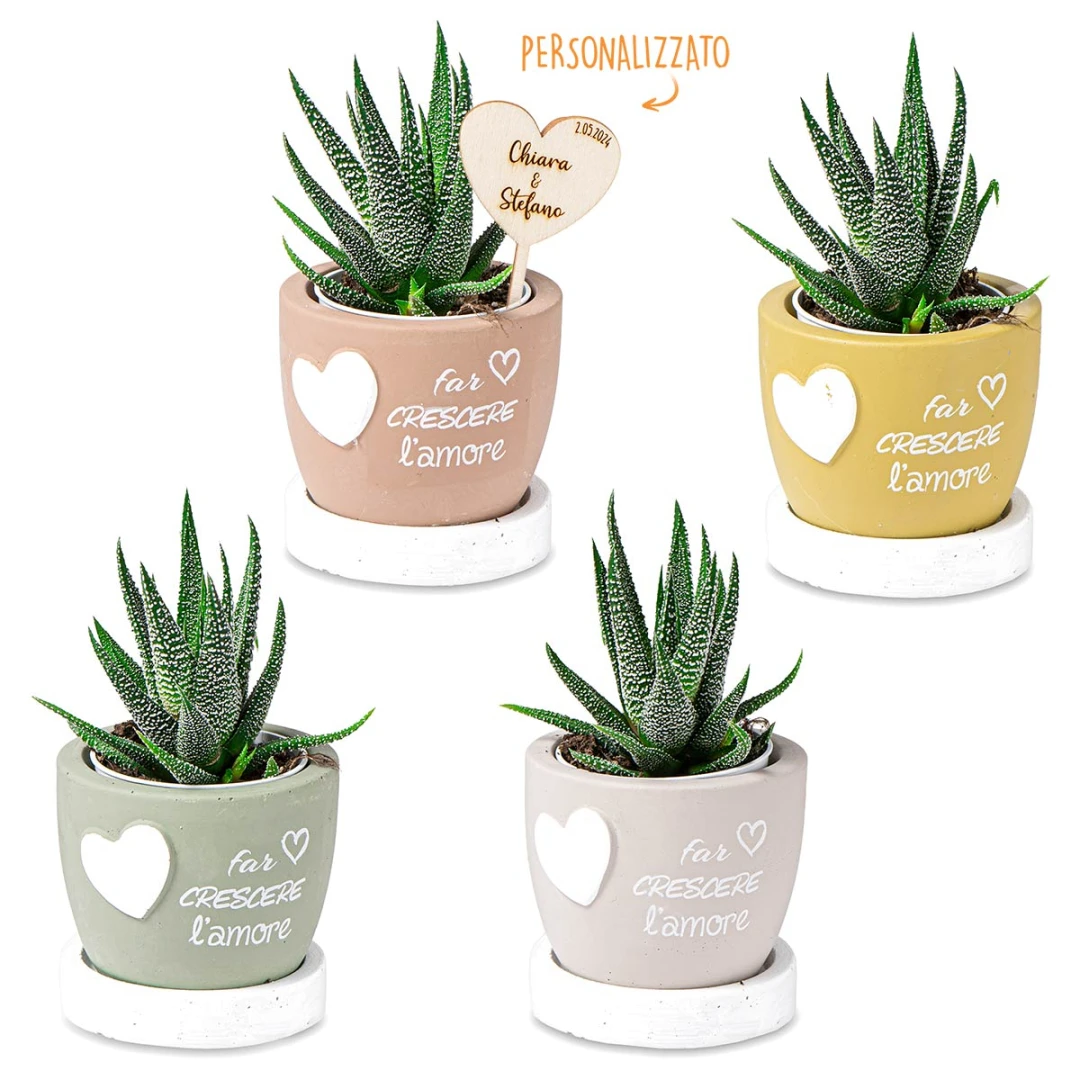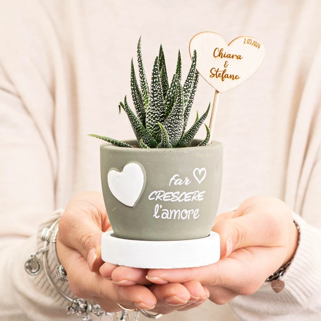 Bellissime Bomboniere 2026, Linea L'Amore, Vasi Portapiantina in cemento con base e frase con cuore. Questi prodotti vengono assortiti in 4 colori diversi. Prezzo cadauno. Prodotto Artigianale.