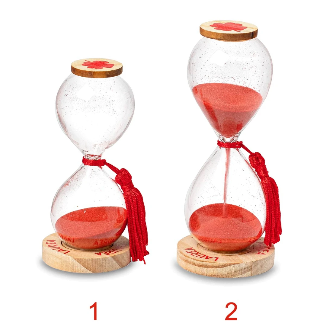 Bellissime Bomboniere 2026, Linea Laurea, Clessidra con nappina rossa e base in legno con scritta "Laurea", il tutto completato da un quadrifoglio rosso che si ripete sulla parte superiore ed inferiore della clessidra. Scatola inclusa. Prezzo cadauno. Prodotto Artigianale.