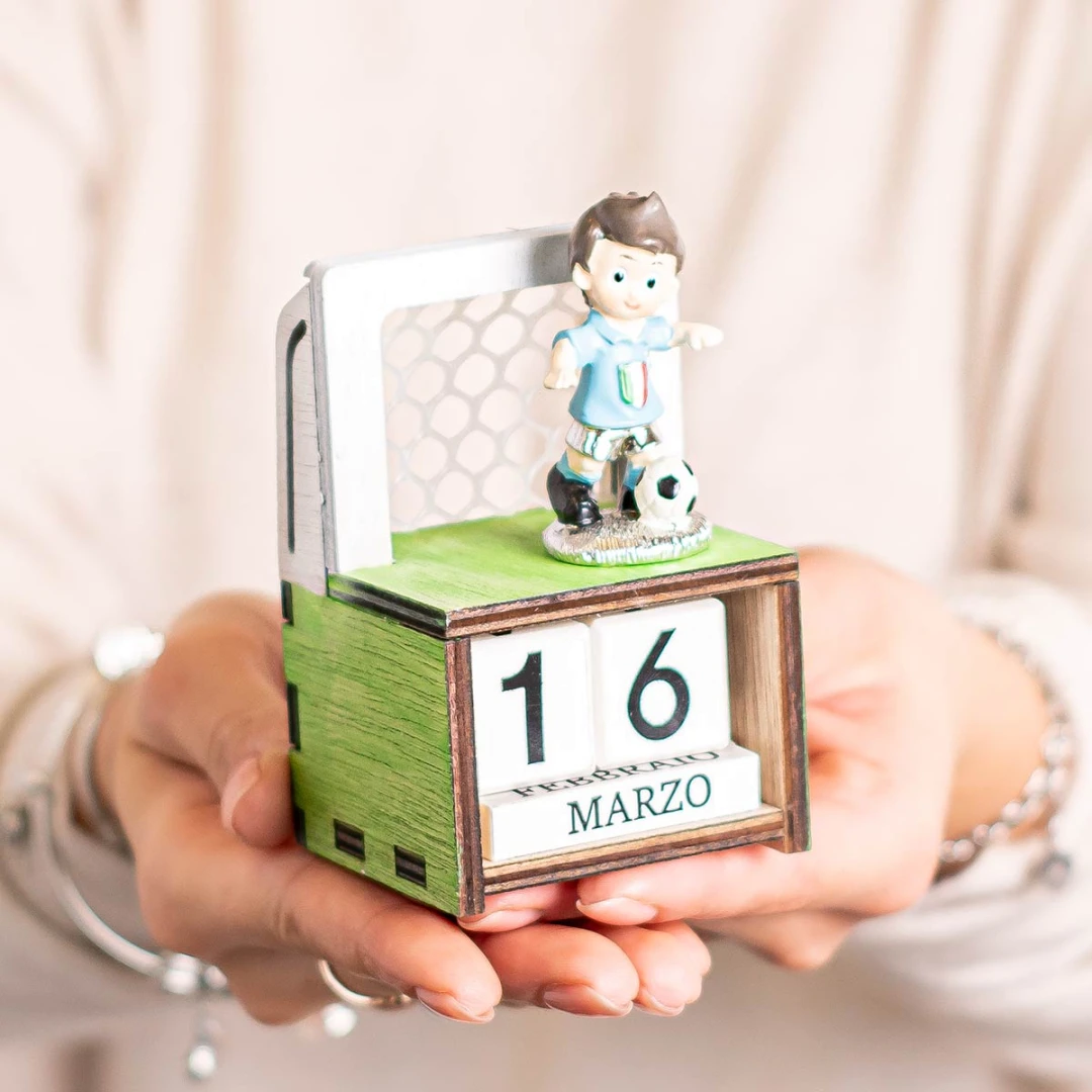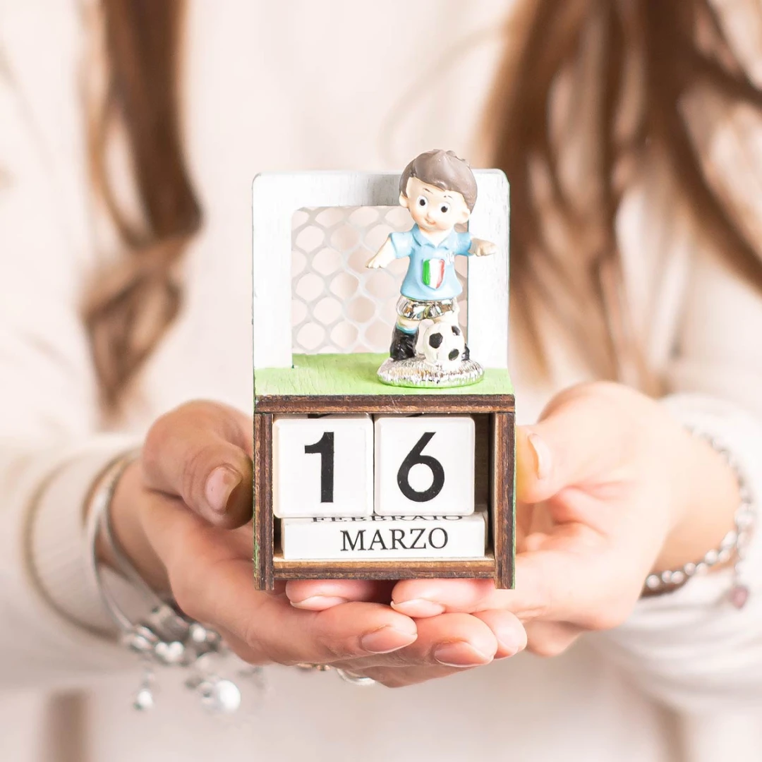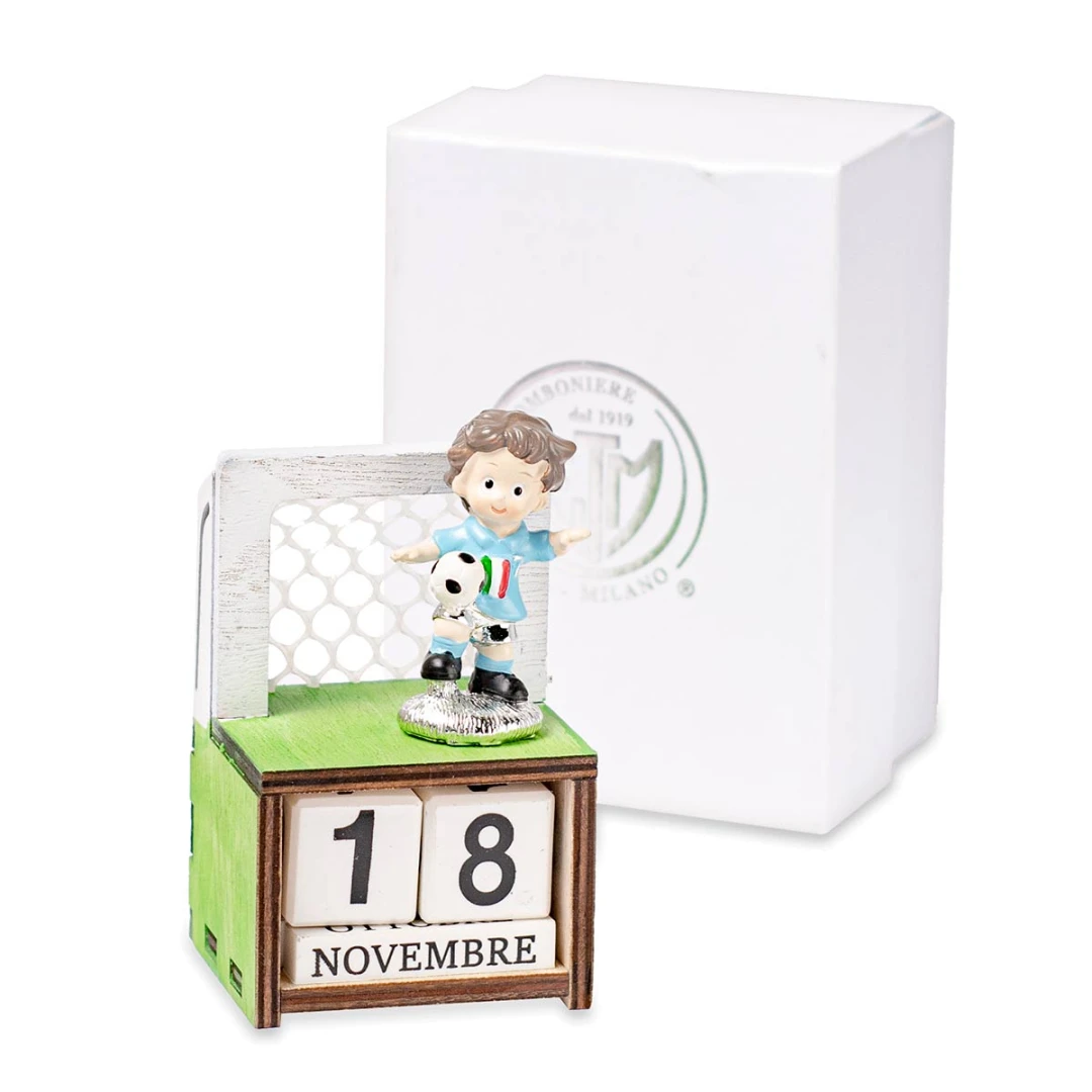 Simpatiche Bomboniere 2026, Linea Mondiali, Calendario con porta e piccolo calciatore, Barattolino Portaconfetti con stauetta calciatore su tappo con piccolo decoro pallone sul fronte e piccole statuette calciatori, Scatola inclusa solo per il calendario. Questo prodotto arriva assortito in 3 modi per tutti i modelli presenti. Prezzo cadauno. Prodotto Artigianale.