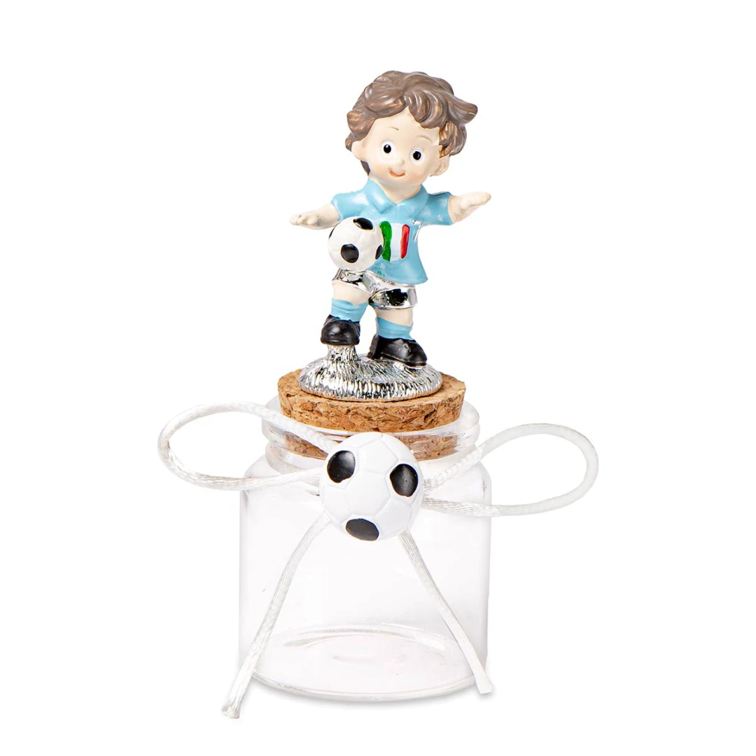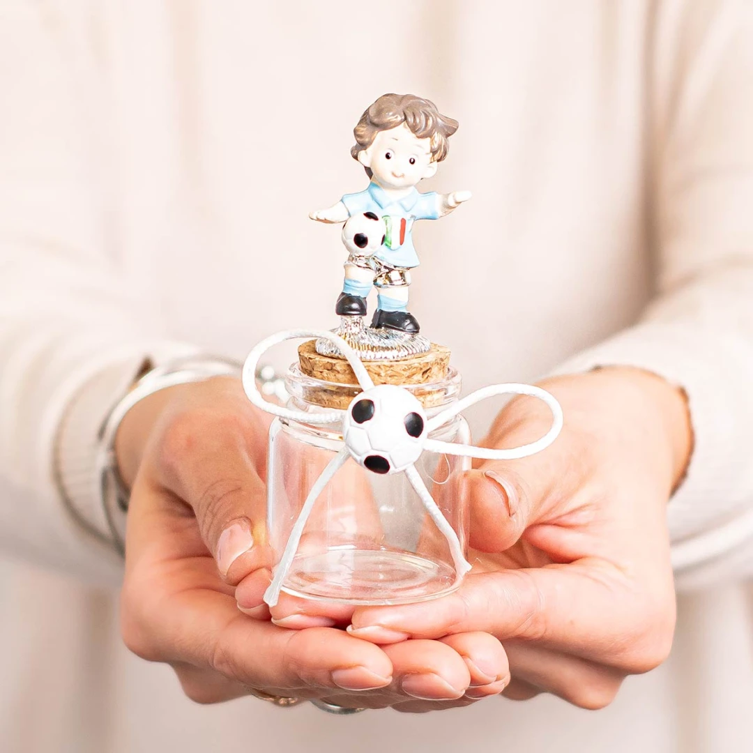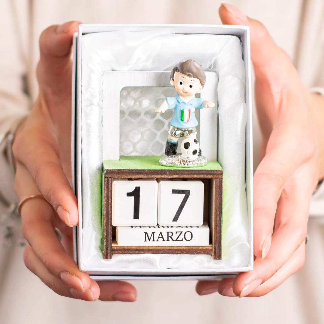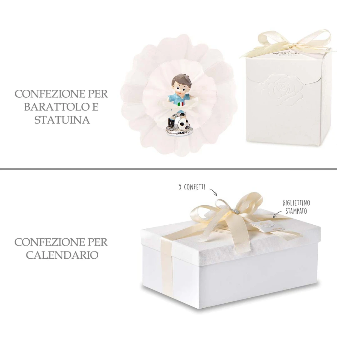 Simpatiche Bomboniere 2026, Linea Mondiali, Calendario con porta e piccolo calciatore, Barattolino Portaconfetti con stauetta calciatore su tappo con piccolo decoro pallone sul fronte e piccole statuette calciatori, Scatola inclusa solo per il calendario. Questo prodotto arriva assortito in 3 modi per tutti i modelli presenti. Prezzo cadauno. Prodotto Artigianale.