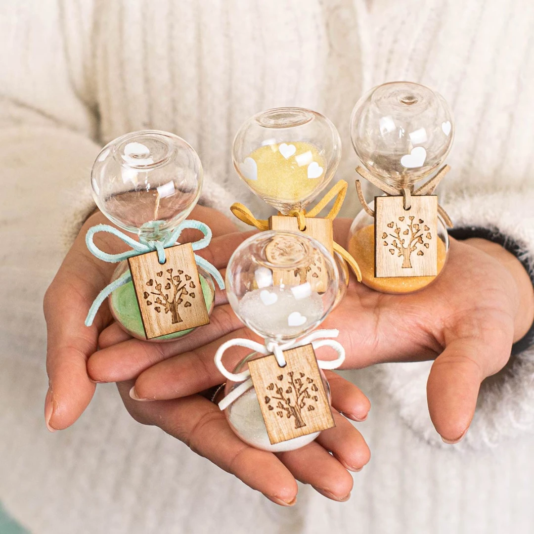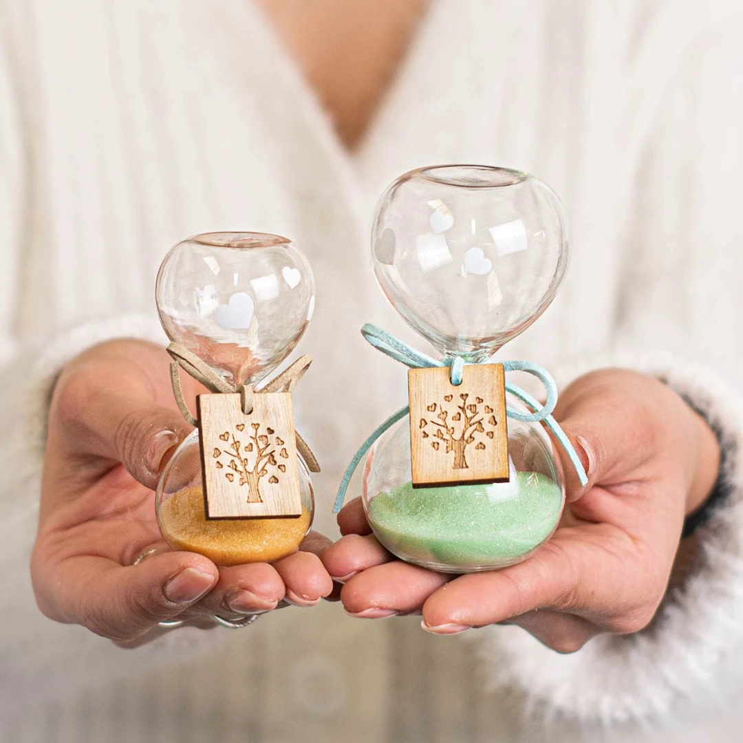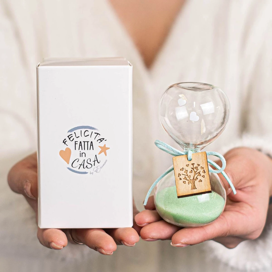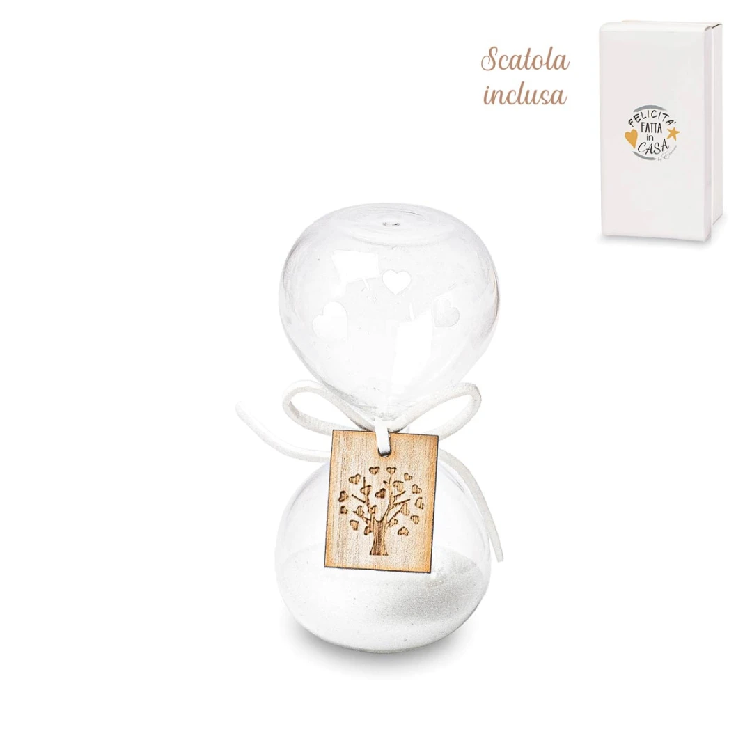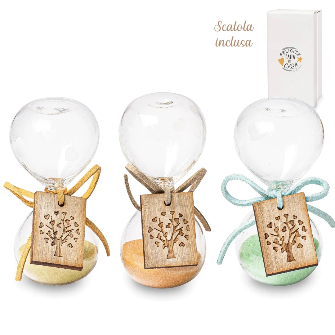 Bellissime Bomboniere 2026, Linea Nuance,Clessidre in vetro con ciondolo albero della vita bianche o colorate. Scatola inclusa. Questo prodotto nella versione colorata arriva in 3 colori assortiti. Prezzo cadauno. Prodotto Artigianale.