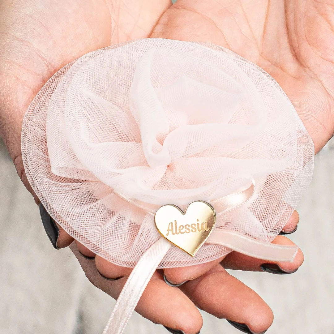Collezione Bomboniere AD 2026, Linea Plissé, Sacchettino Portaconfetti a forma di rosa girata in tulle, Prodotto di Alta Qualità. Misura: 10 x 5 cm. Inoltre, è possibile aggiungere un cuoricino personalizzato con il proprio nome.