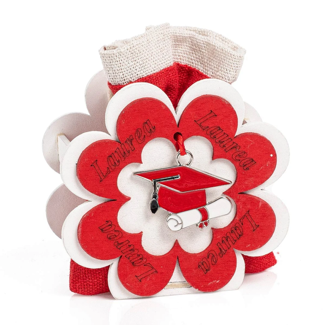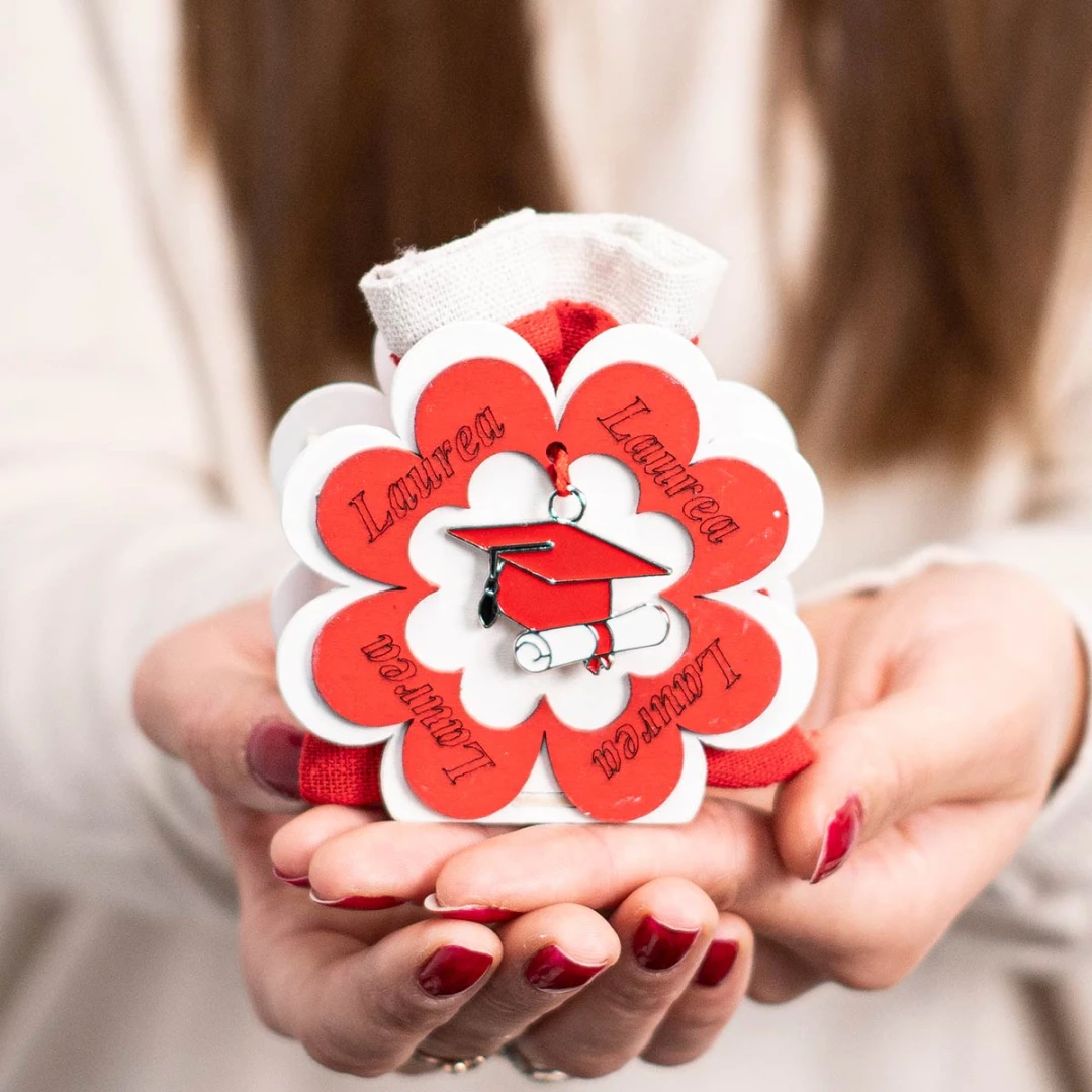 Bellissime Bomboniere Laurea 2026, Linea Quadrifoglio, Scatoline portaconfetti a forma di quadrifoglio rosso e bianco. Arrivano con ciondolo assortito (Alloro, Tocco e Pergamena o Mappamondo). Prezzo cadauno. Prodotto Artigianale. Misura: 8,2 x 3,5 cm | h 8 cm.