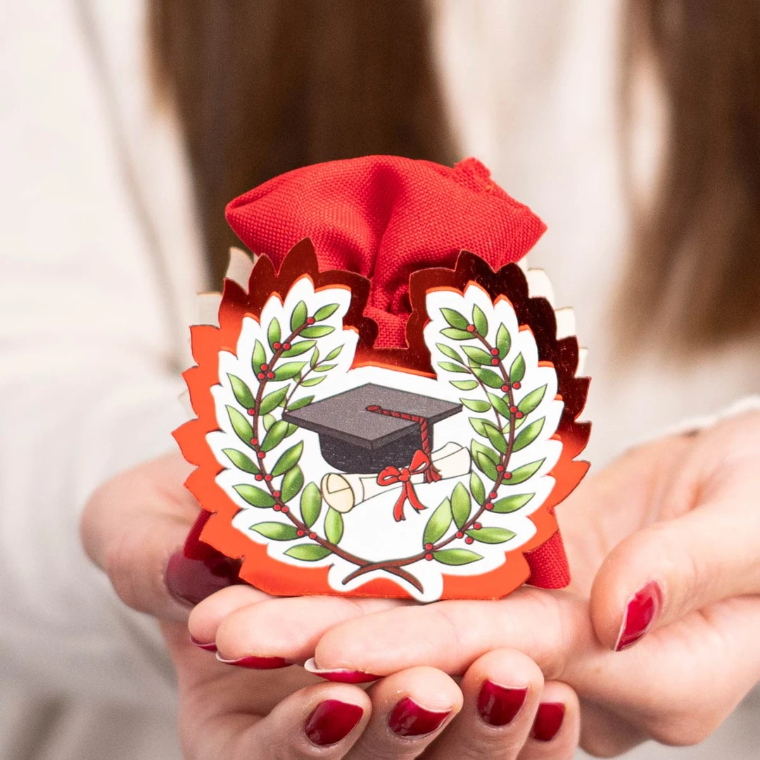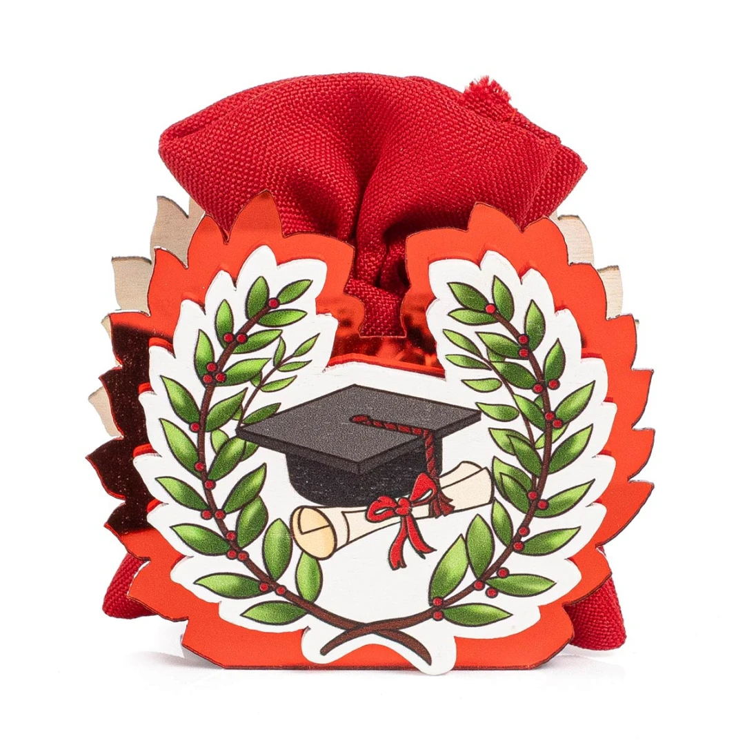 Bomboniere Laurea 2026, Linea Rouge, Scatoline portaconfetti a forma di corona d'alloro con tocco e pergamena e sacchettino rosso all'interno. Prezzo cadauno. Prodotto Artigianale. Misura: 8 x 3,5 cm | h 8 cm.