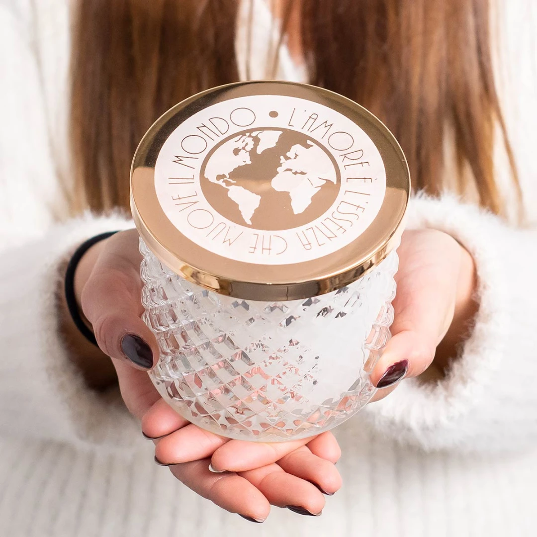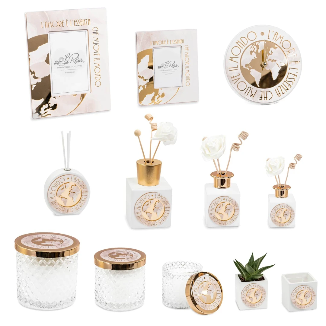 Bomboniere 2026, Linea Viaggio Oro con Portafoto, Profumatori, Candele, Vasi ed Orologio con mondo e frase "L'amore è l'essenza che muove il mondo" il tutto decorato in color oro, articoli di ottima qualità, dal vivo rendono molto di più, disponibili in diversi modelli. completi di scatola e certificato di qualità (per profumatori anche bacchette e profumo).