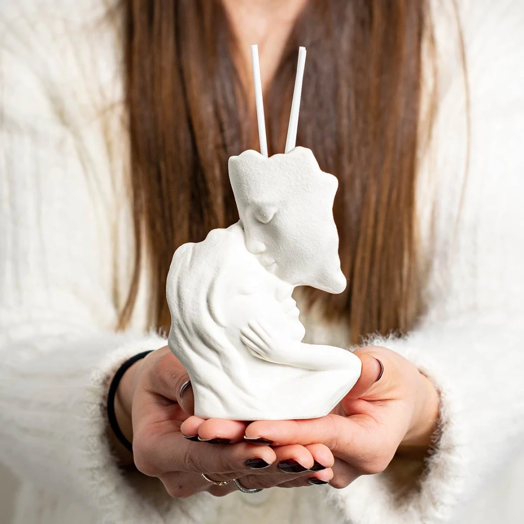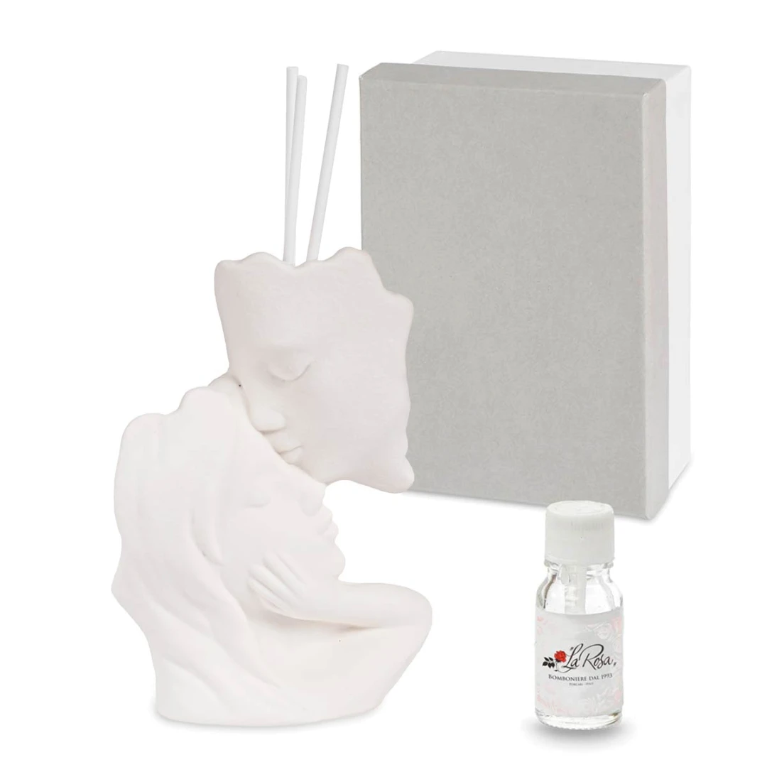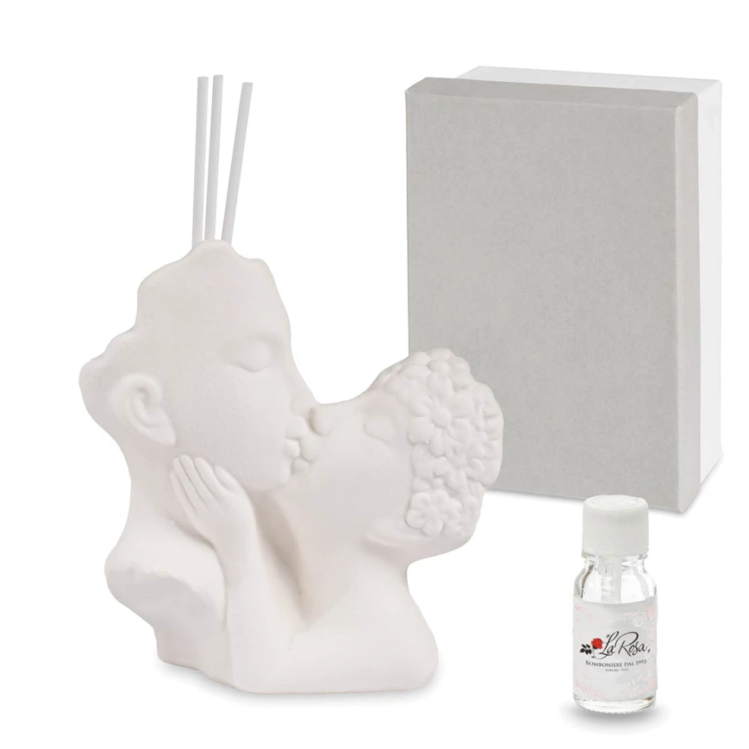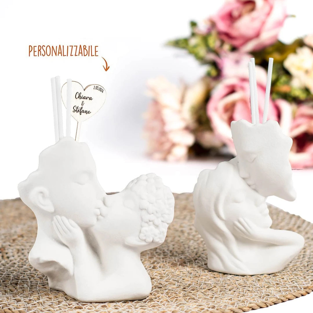 Idea Bomboniera per Matrimonio, Profumatori con coppia che si bacia, in ceramica, è disponibile in due modelli. Profumo e bacchette inclusi. Prodotto Artigianale. Inoltre, è possibile personalizzarle con un cuoricino in plexiglass inciso con i propri nomi.
