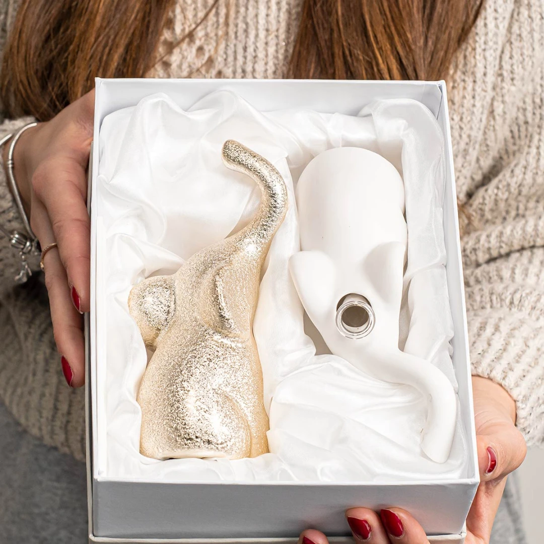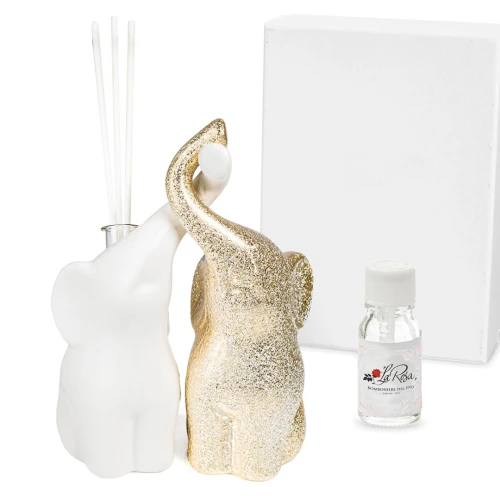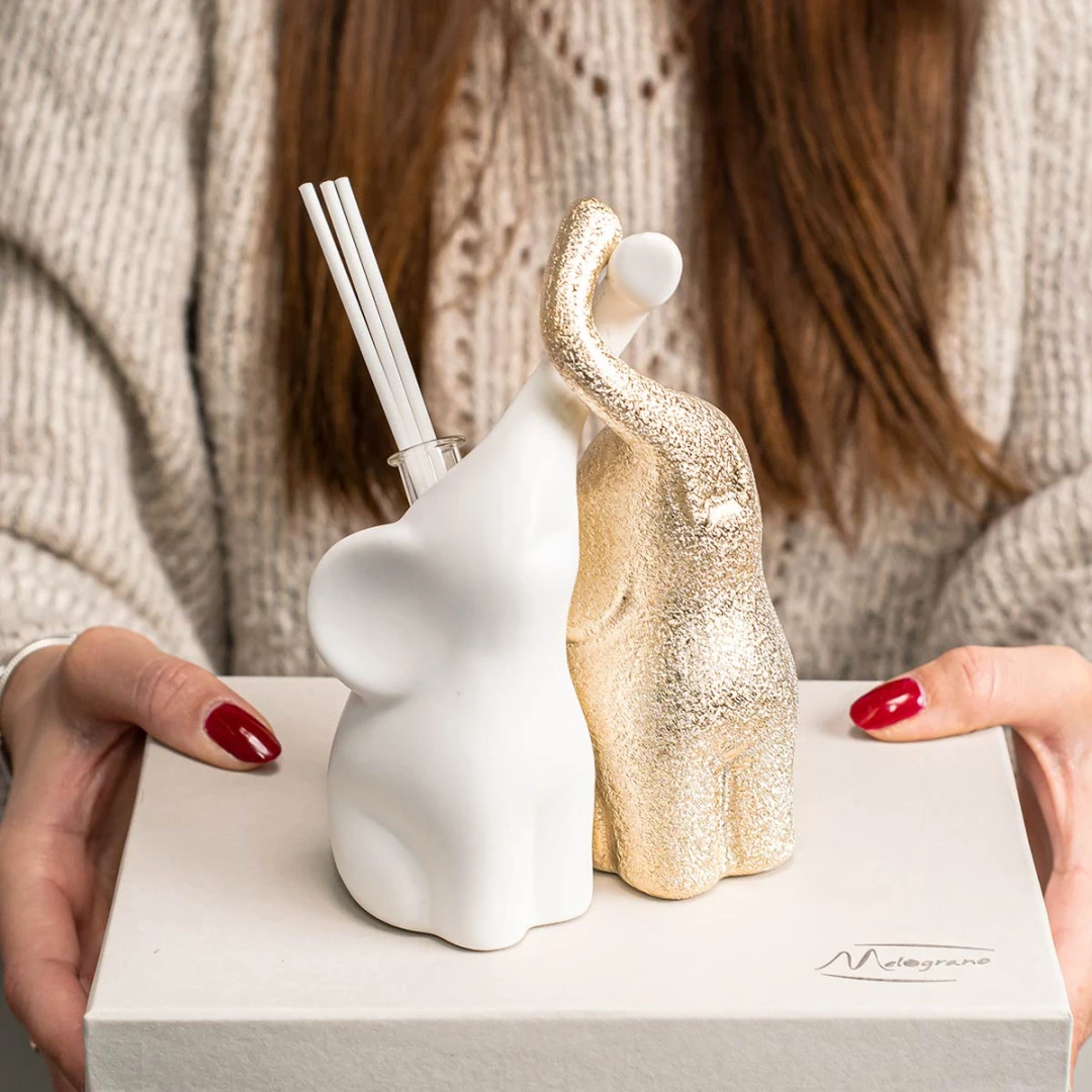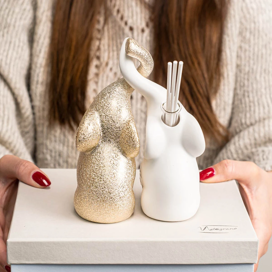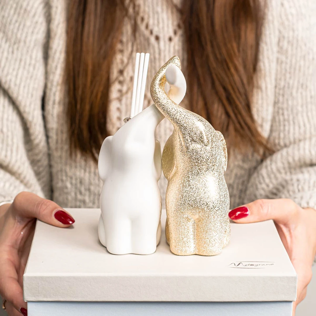 Bellissime Bomboniere 2026, Profumatore Elefantini Intrecciati Bianco & Oro. Incluso di scatola, bacchette e profumo. Misura: 10,5 x 6 cm | h 16,5 cm | con bacchette: 19,5 cm. | scatola: 21 x 17 cm | h 8 cm. Prodotto Artigianale.