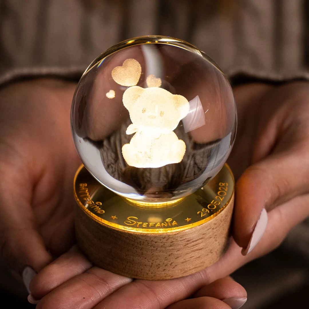 Bellissime Bomboniere Santo Battesimo Femmina 2026, Sfera in vetro con grafica in 3D, (si vede da tutti i lati) su base in legno a LED e con possibilità di personalizzarla su base in plexiglass a specchio. Prodotto Artigianale. Misura: Ø 6 cm | h 9 cm.