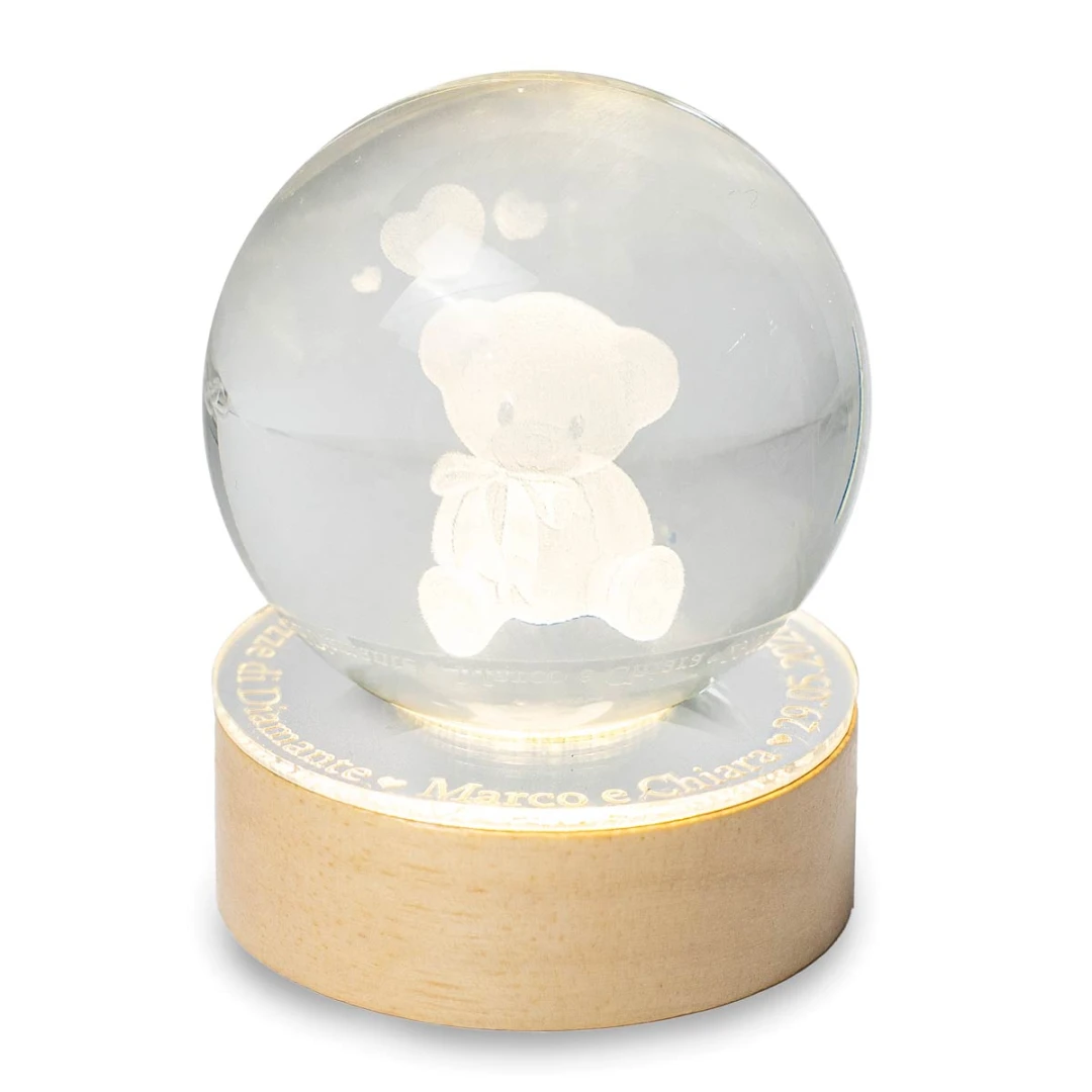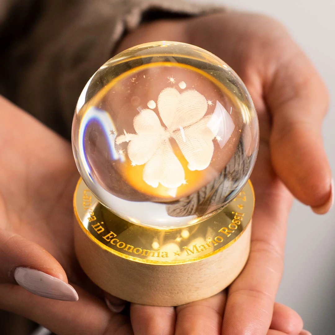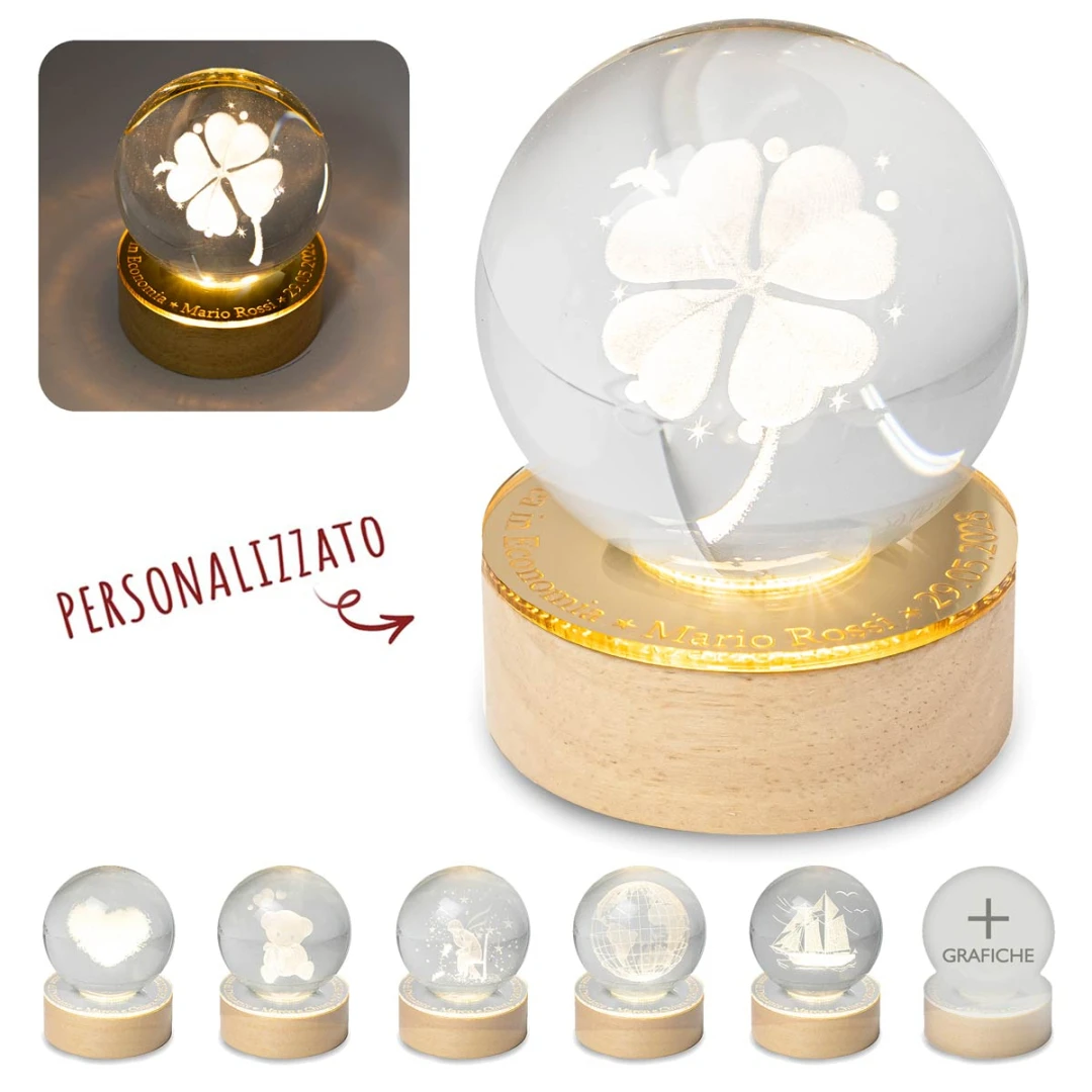 Bellissime Bomboniere Laurea 2026, Sfera in vetro con grafica in 3D, (si vede da tutti i lati) su base in legno a LED e con possibilità di personalizzarla su base in plexiglass a specchio. Prodotto Artigianale. Misura: Ø 6 cm | h 9 cm.