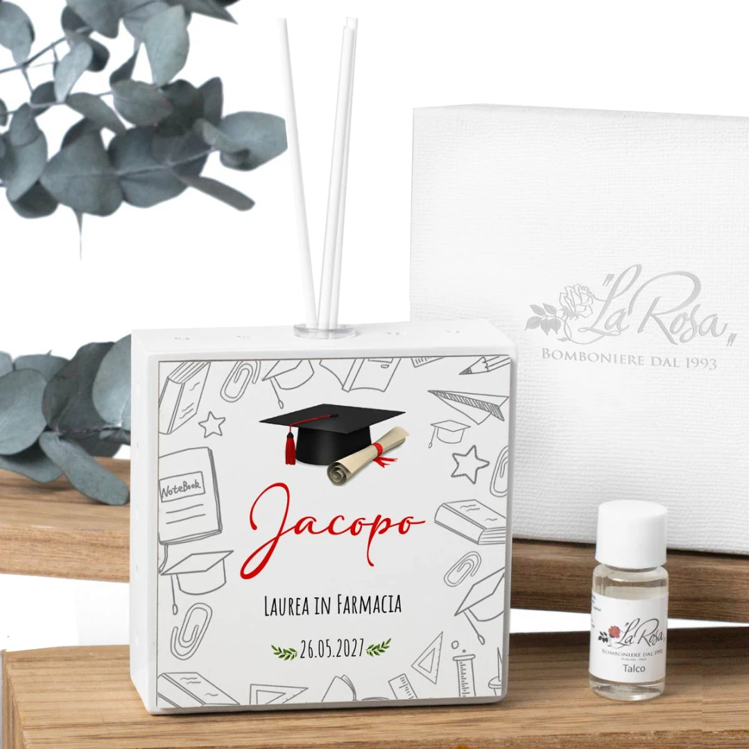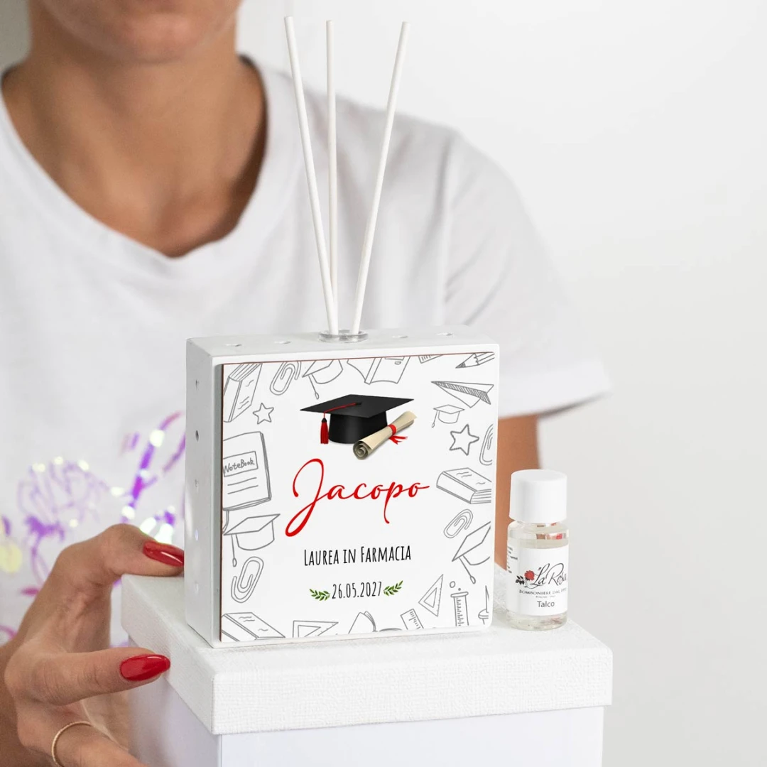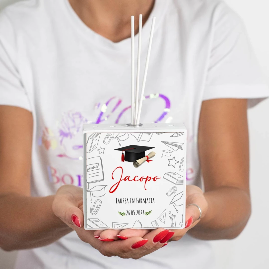 Bomboniere Laurea Profumatore a LED personalizzabile con grafica tocco e simboli facoltà, arriva completo di batterie, bacchette, profumo e scatola. misura: 10,5 x 4 cm | altezza: 10,5 cm | altezza con bacchette: 20 cm.