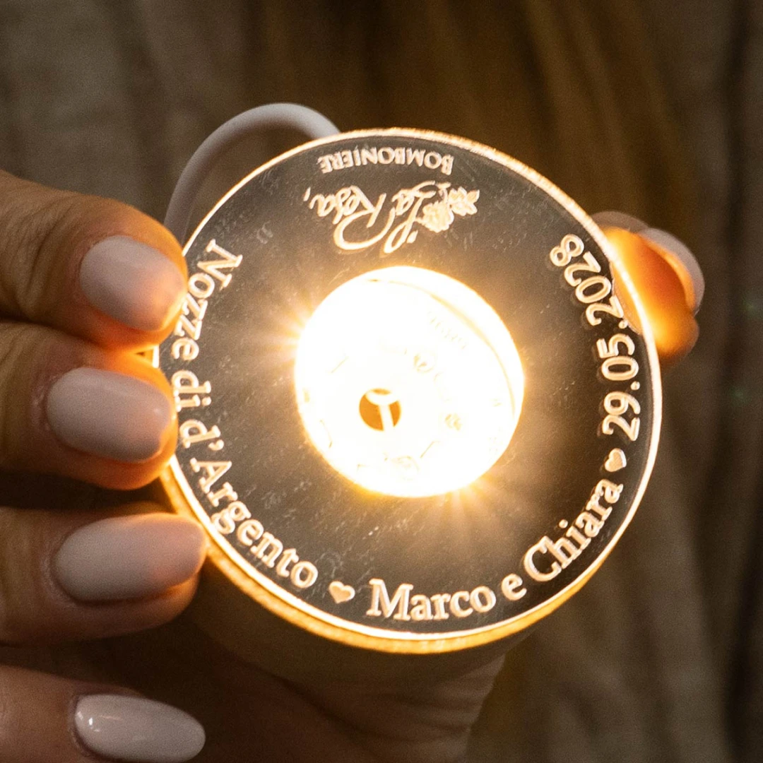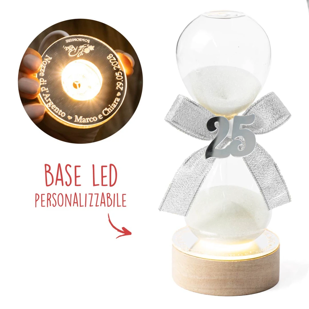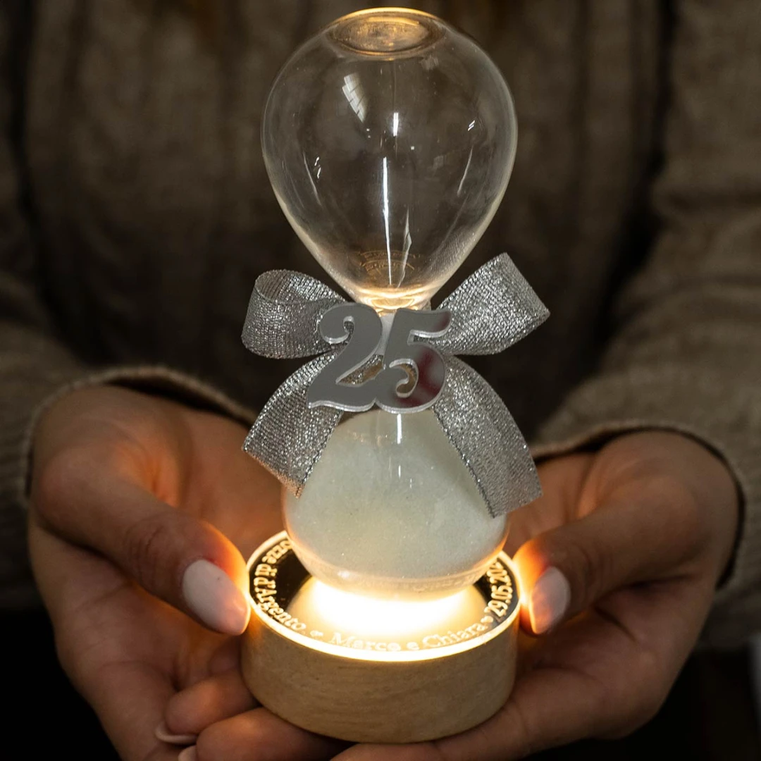 Bellissime Bomboniere Nozze D'Argento 2026, Clessidra in vetro soffiato, su base in legno a LED e con possibilità di personalizzarla su base in plexiglass a specchio. Prodotto Artigianale. Misura: h 13 cm. Sabbia disponibile in diversi colori.