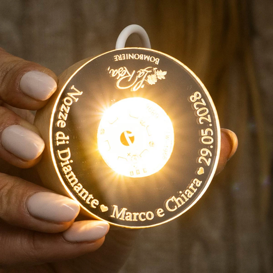 Bellissime Bomboniere 60° Anniversario di matrimonio 2026, Clessidra in vetro soffiato, su base in legno a LED e con possibilità di personalizzarla su base in plexiglass a specchio. Prodotto Artigianale. Misura: h 13 cm. Sabbia disponibile in diversi colori.