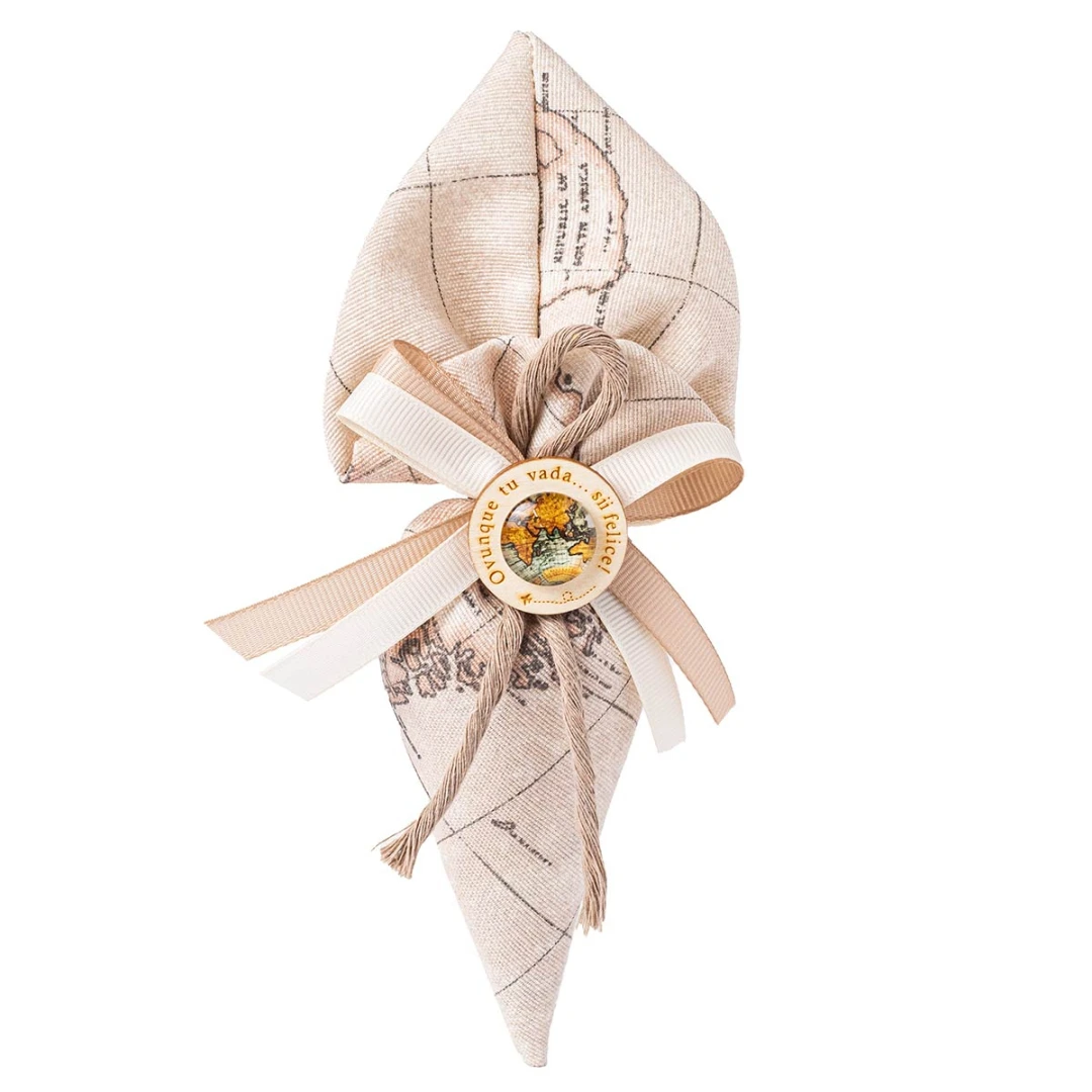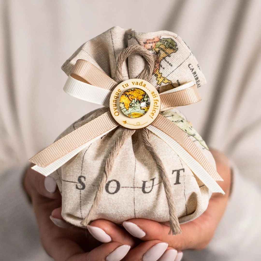 Bomboniere, Sacchettini portaconfetti in tessuto, tema viaggio con applicazione mondo con frase personalizzabile. Disponibili in tre modelli. Prezzo cadauno. Arrivano completi di confetti e bigliettino. Prodotto Artigianale.