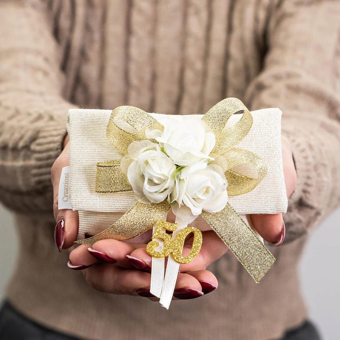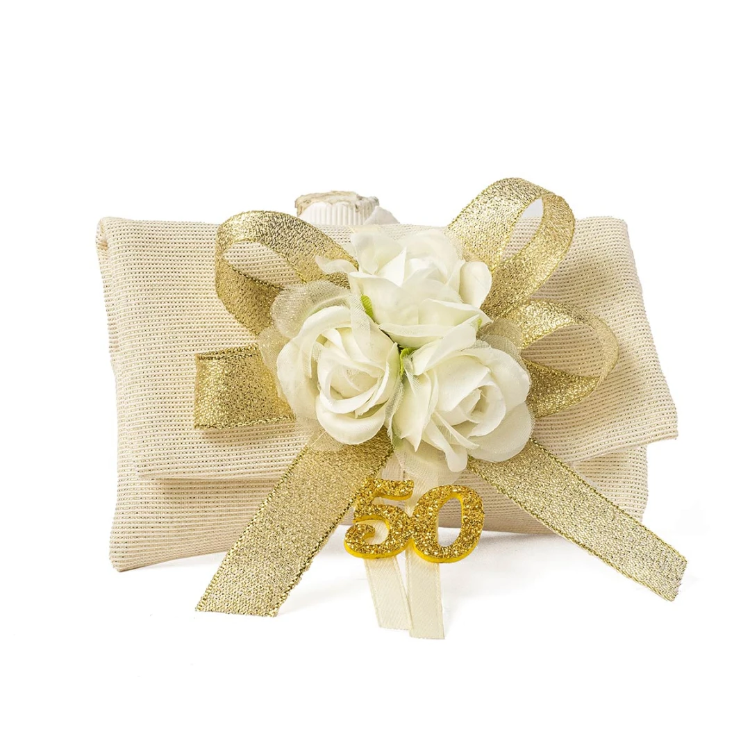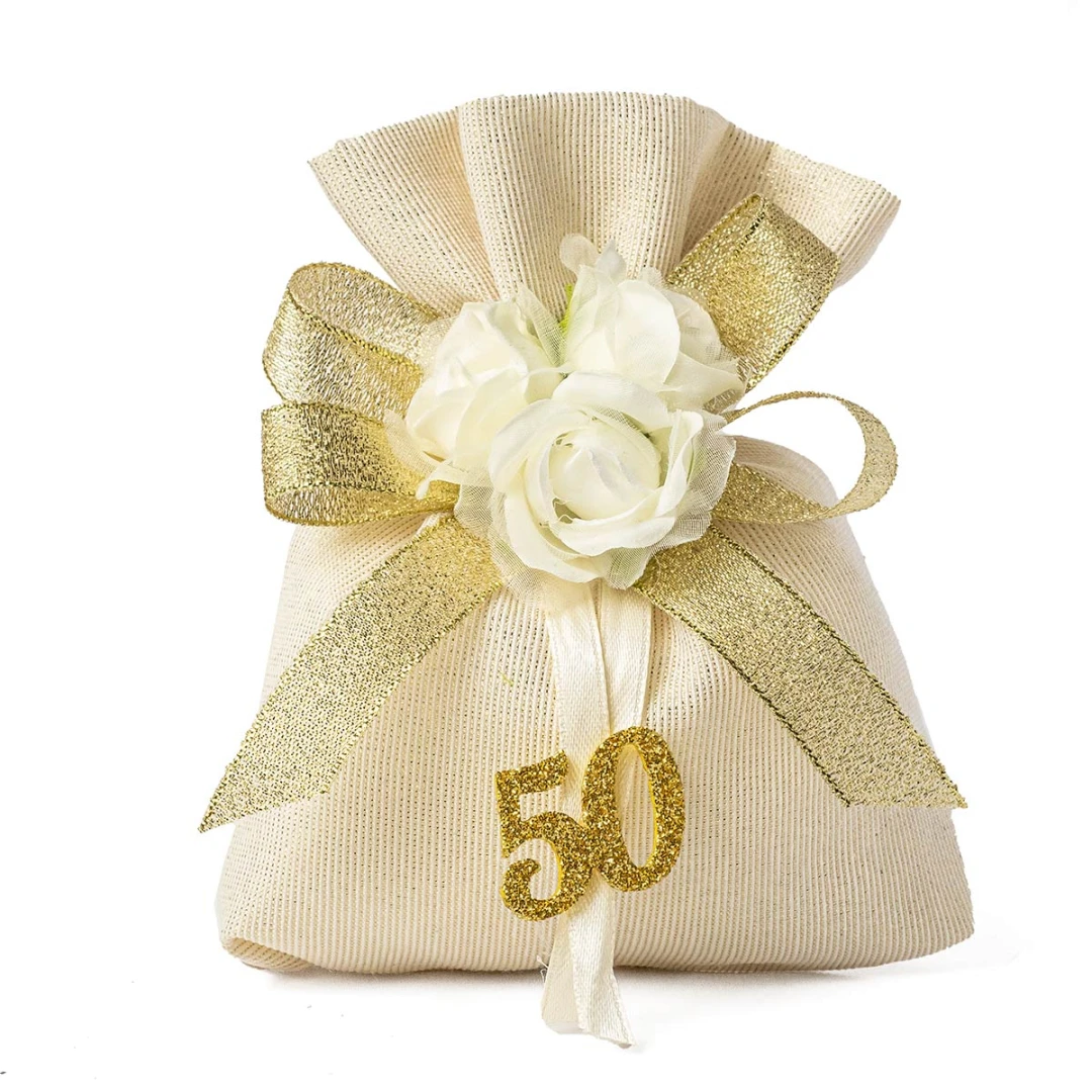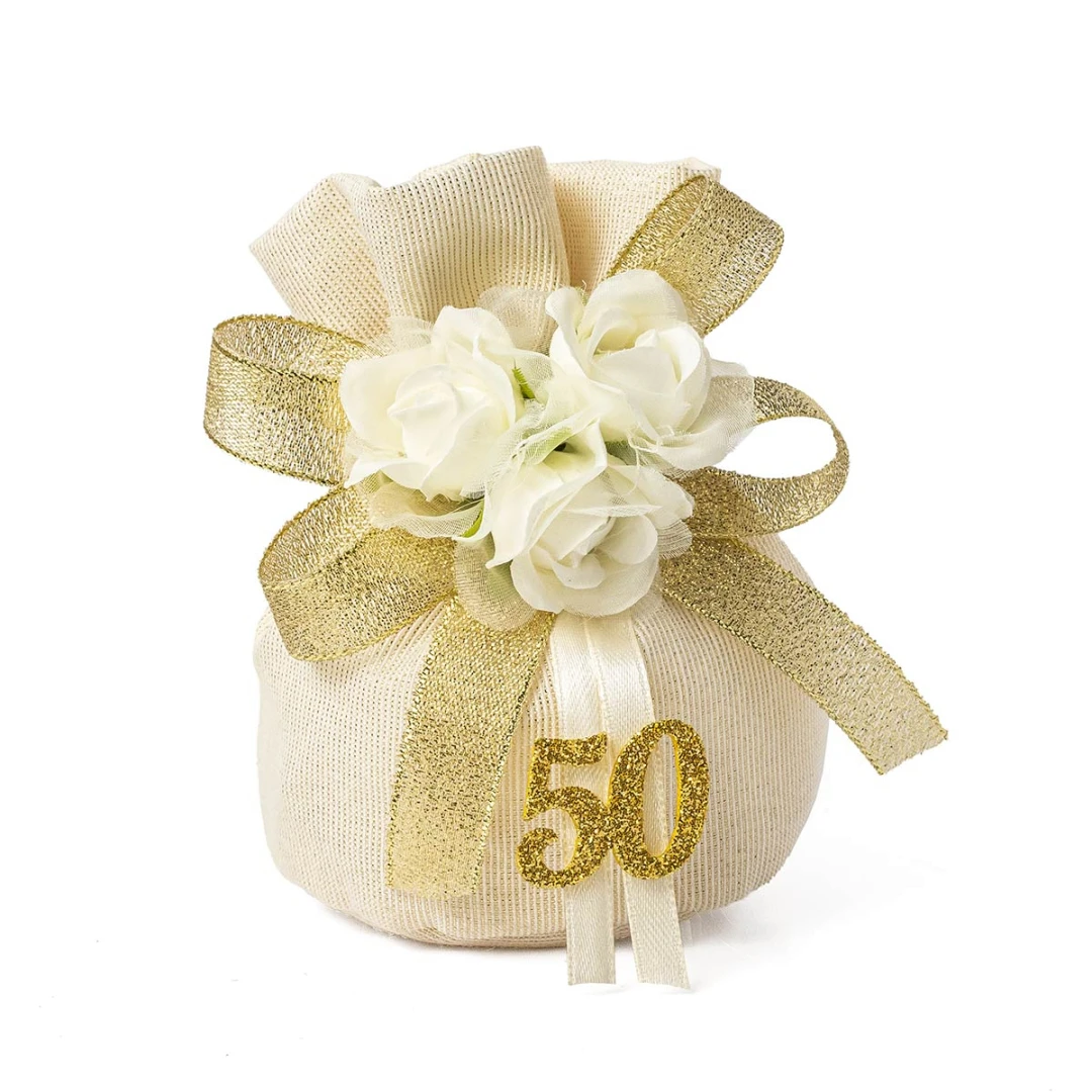 Bomboniere, Sacchettini portaconfetti con effetto satinato, fiore in tessuto ed applicazione in feltro numero 50 glitterato. Disponibili in tre modelli. Prezzo cadauno. Arrivano completi di confetti e bigliettino. Prodotto Artigianale.