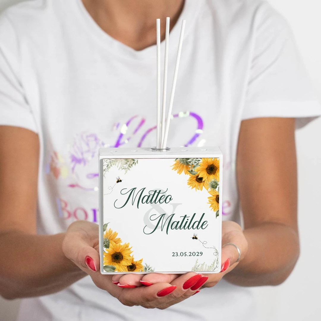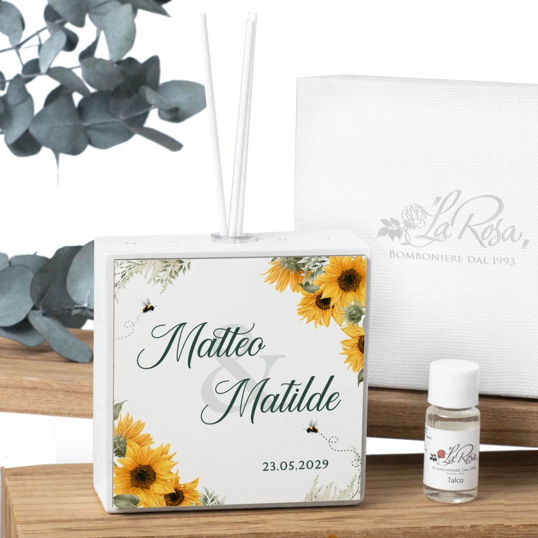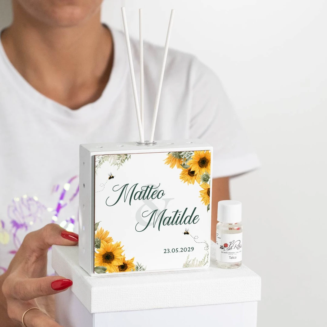 Bomboniere Profumatore a LED personalizzabile con grafica bellissimi girasoli, arriva completo di batterie, bacchette, profumo e scatola. misura: 10,5 x 4 cm | altezza: 10,5 cm | altezza con bacchette: 20 cm.