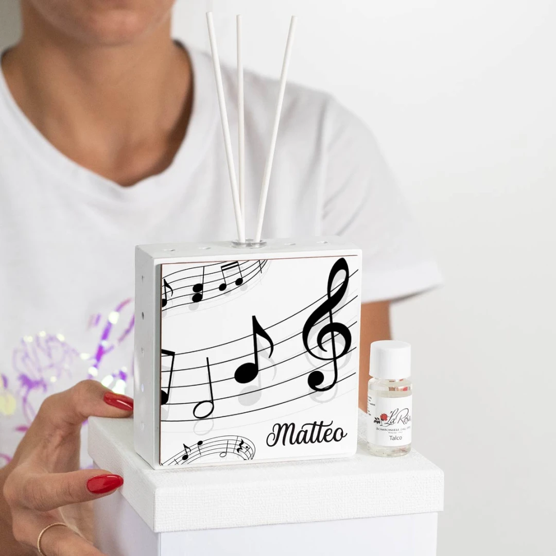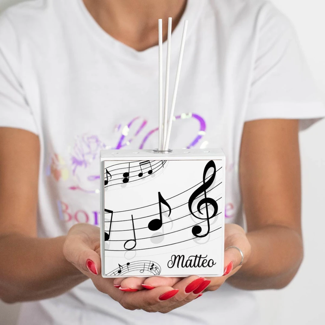 Bomboniere Profumatore a LED personalizzabile con grafica chiave di violino e note musicali, arriva completo di batterie, bacchette, profumo e scatola. misura: 10,5 x 4 cm | altezza: 10,5 cm | altezza con bacchette: 20 cm.