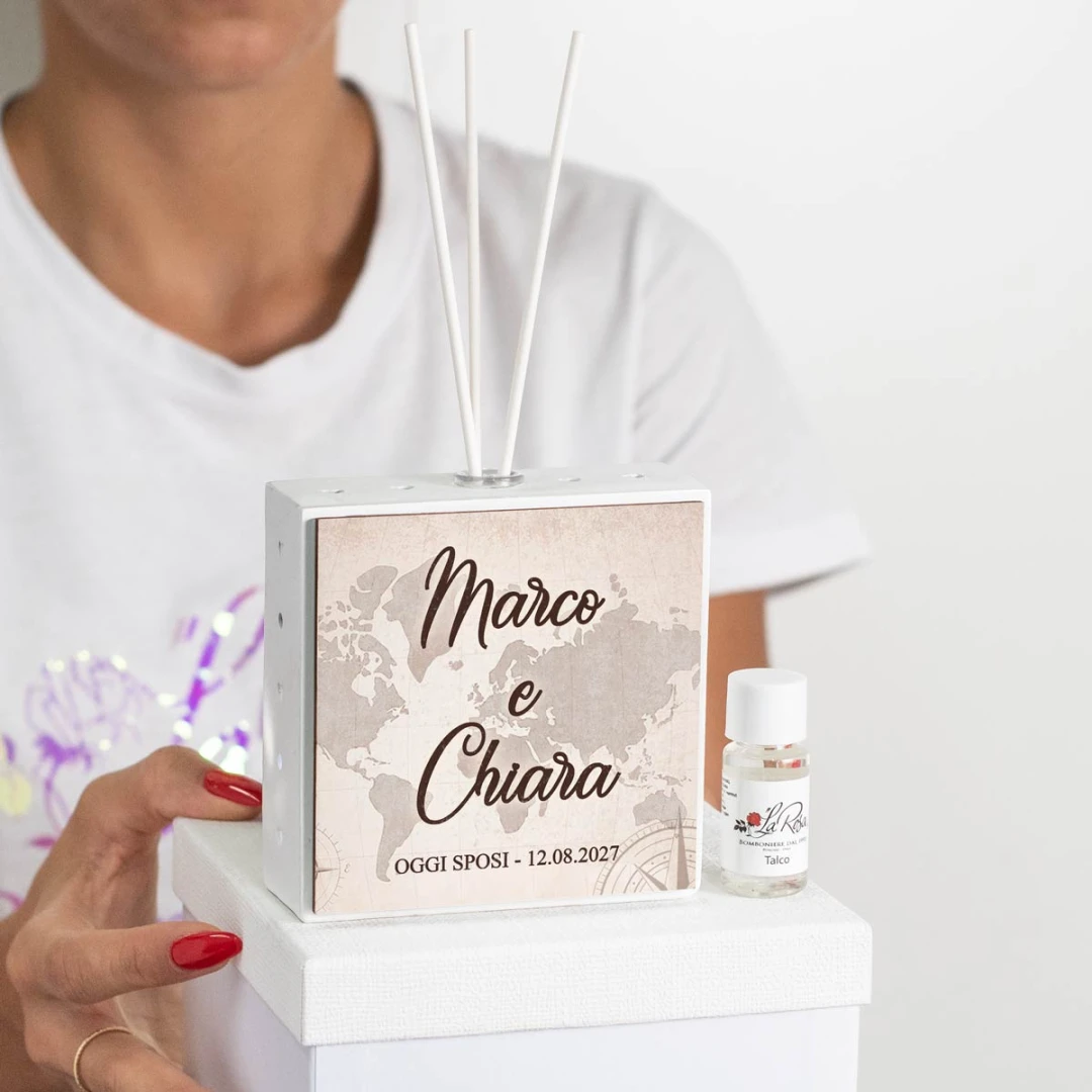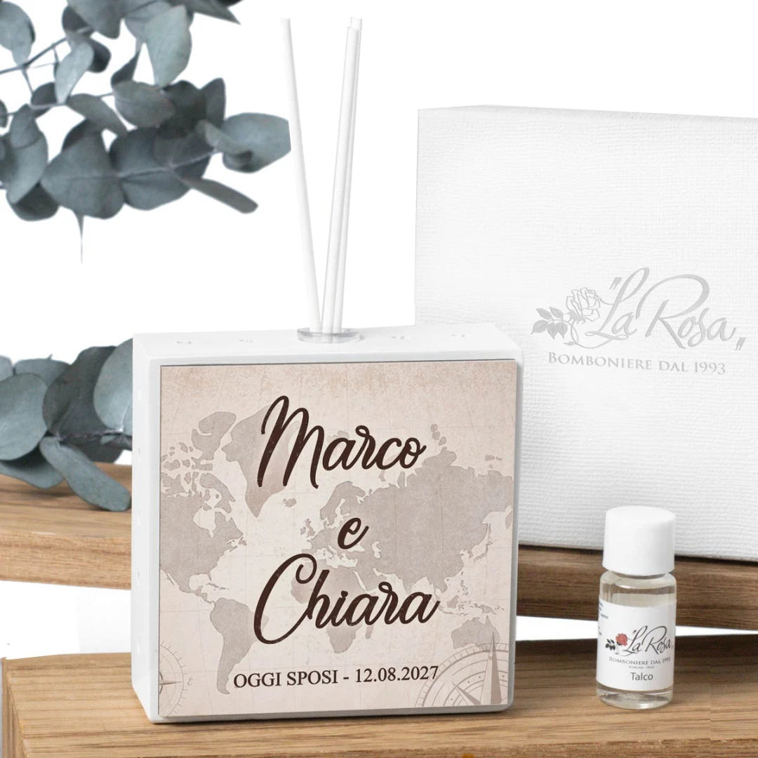 Bomboniere Profumatore a LED personalizzabile con grafica cartina geografica con bussola, arriva completo di batterie, bacchette, profumo e scatola. misura: 10,5 x 4 cm | altezza: 10,5 cm | altezza con bacchette: 20 cm.