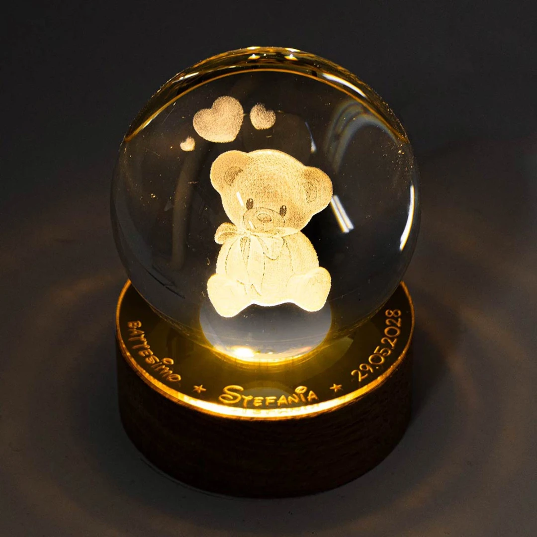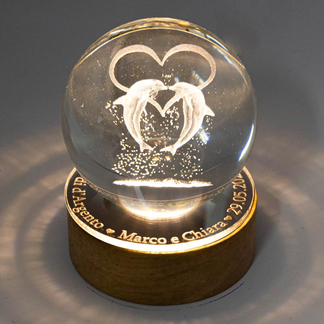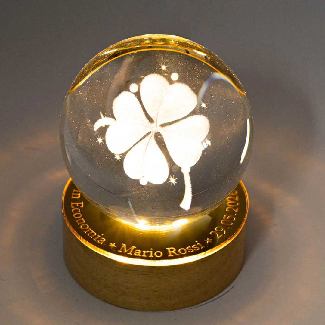 Bomboniere Cresima 2026 Sfera in vetro con incisione interna in 3D, su base in legno a LED e con possibilità di personalizzare la base in plexiglass a specchio. Misura: sfera Ø 6 cm | h totale 9 cm.