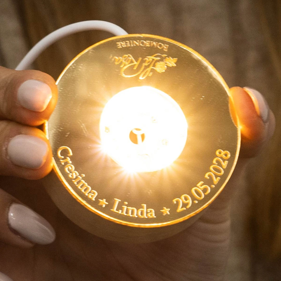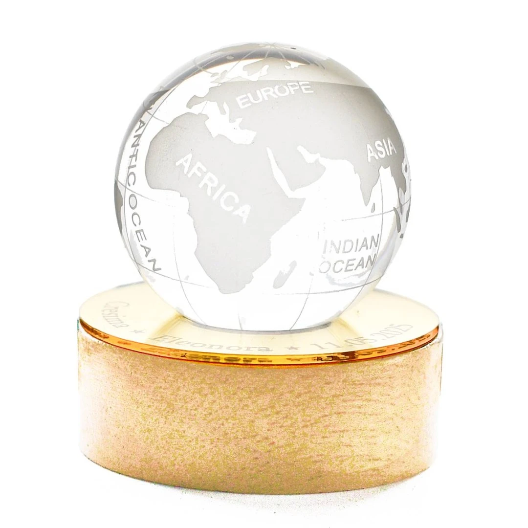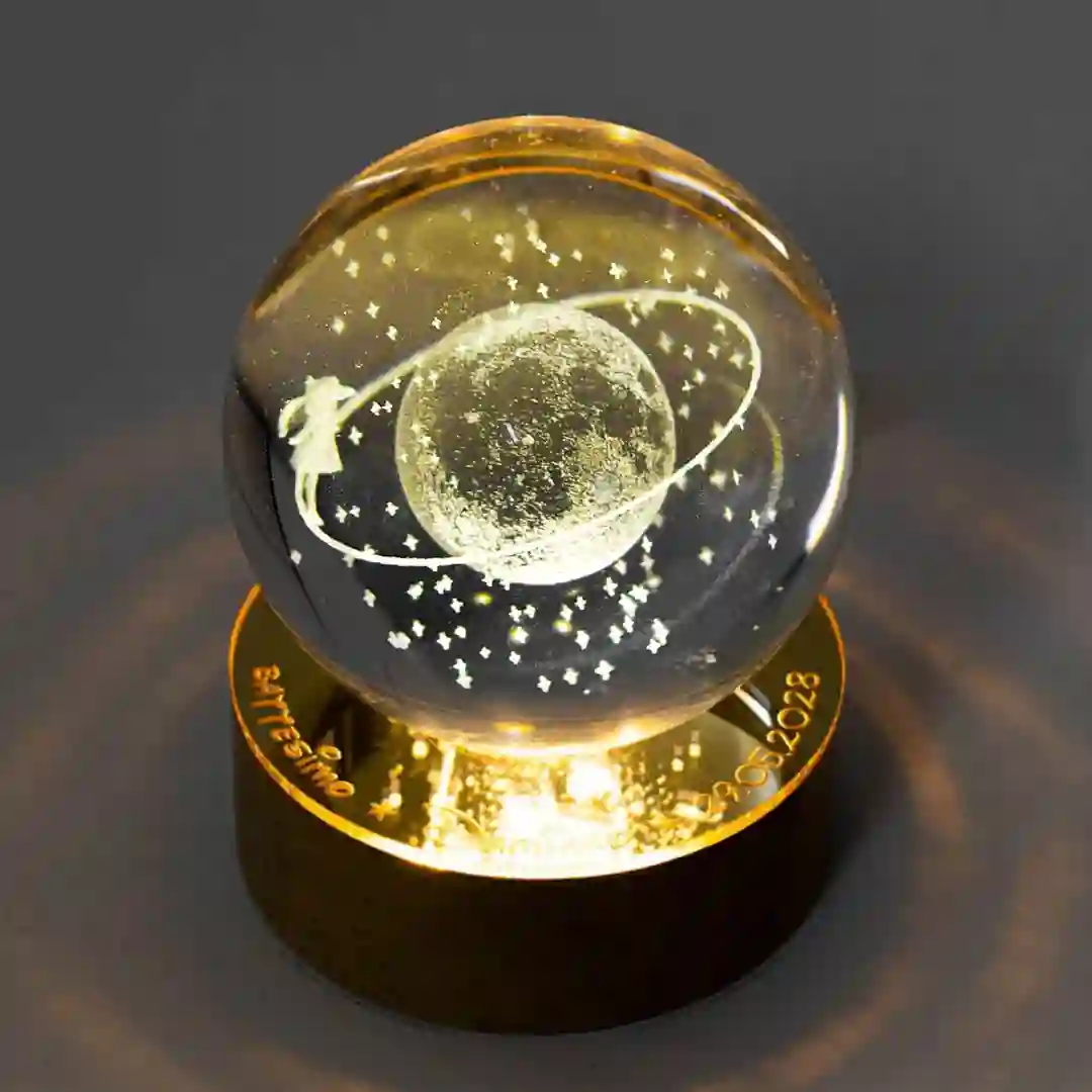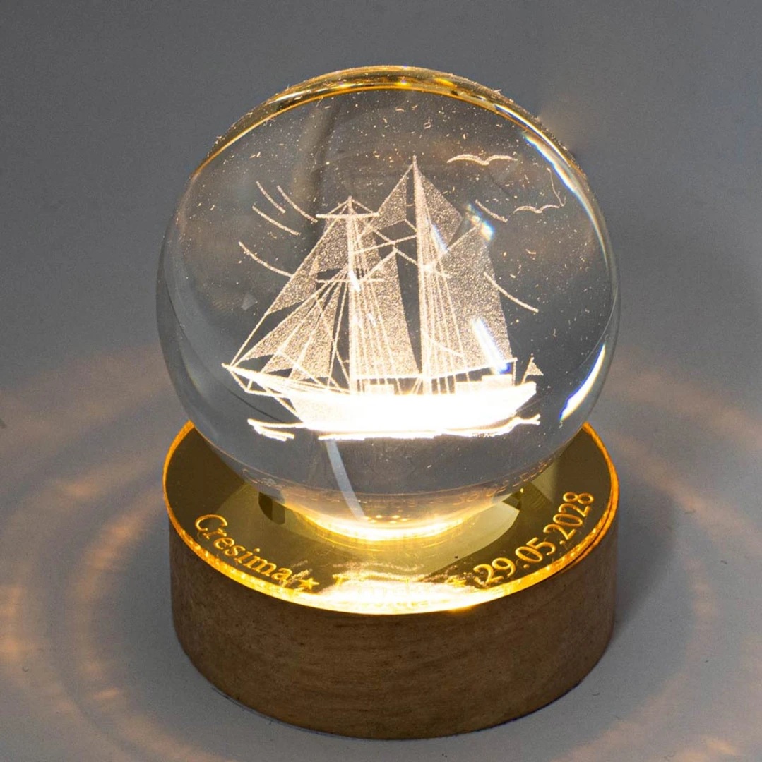 Bomboniere Cresima 2026 Sfera in vetro con incisione interna in 3D, su base in legno a LED e con possibilità di personalizzare la base in plexiglass a specchio. Misura: sfera Ø 6 cm | h totale 9 cm.