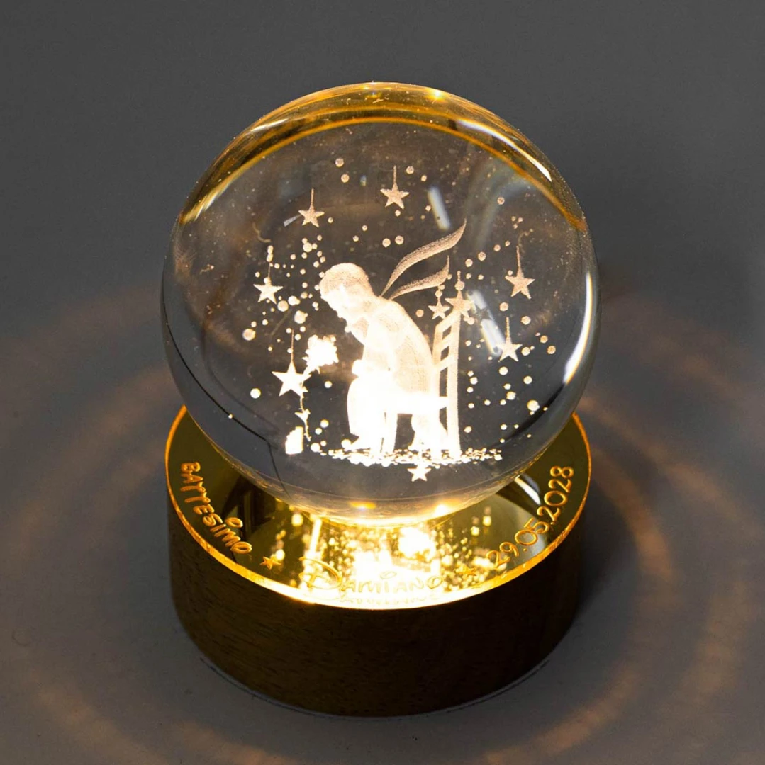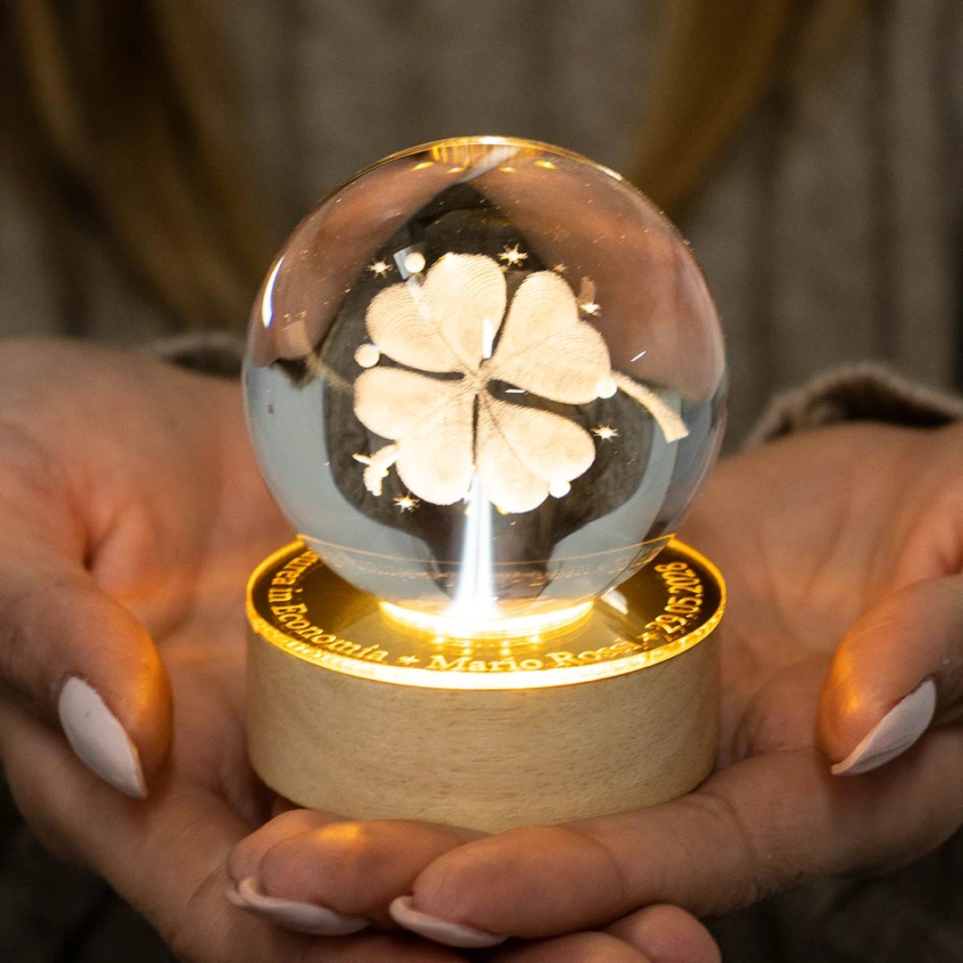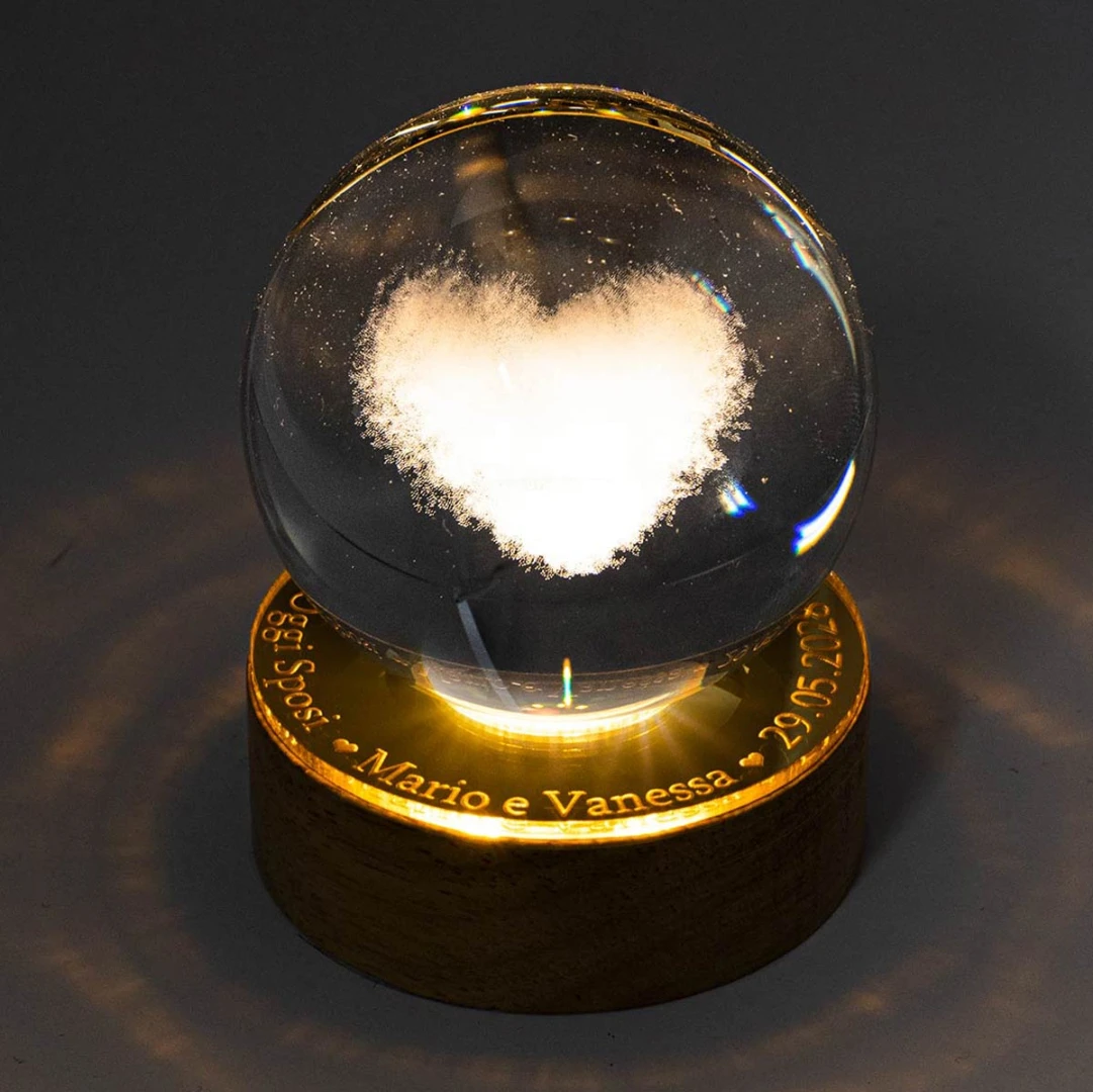 Bellissime Bomboniere Laurea 2026, Sfera in vetro con grafica in 3D, (si vede da tutti i lati) su base in legno a LED e con possibilità di personalizzarla su base in plexiglass a specchio. Prodotto Artigianale. Misura: Ø 6 cm | h 9 cm.