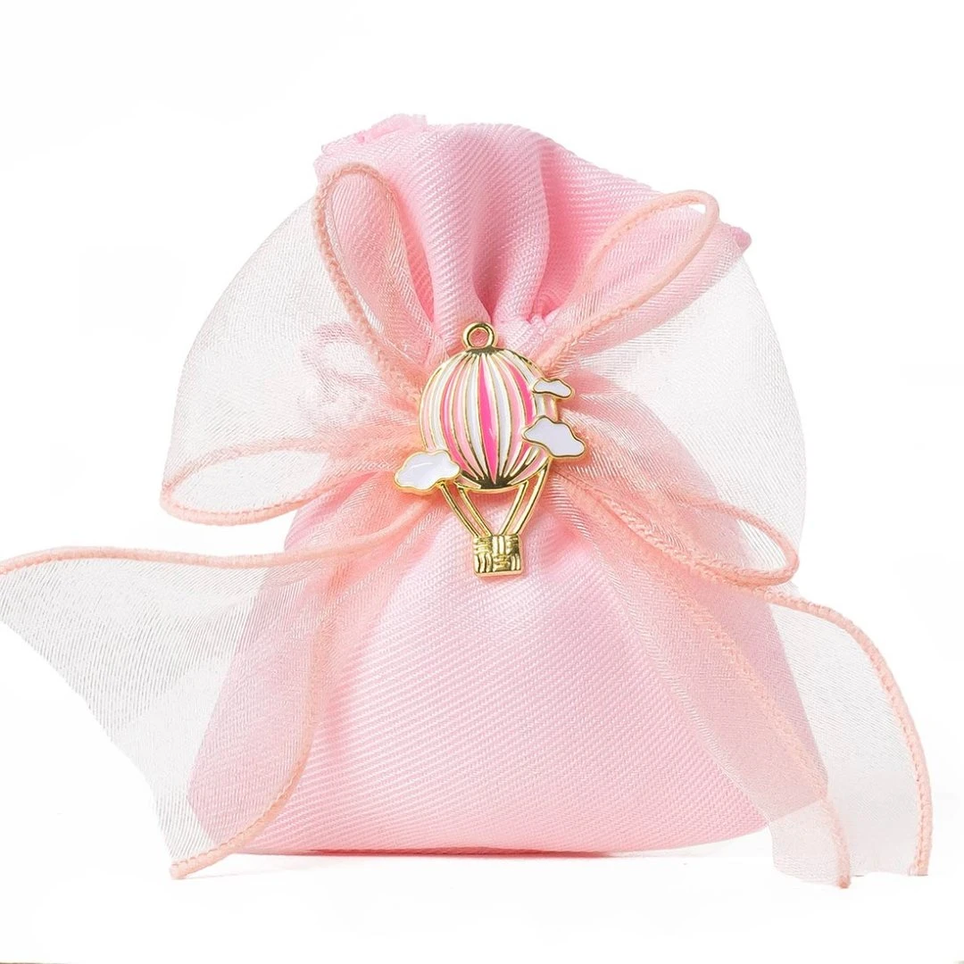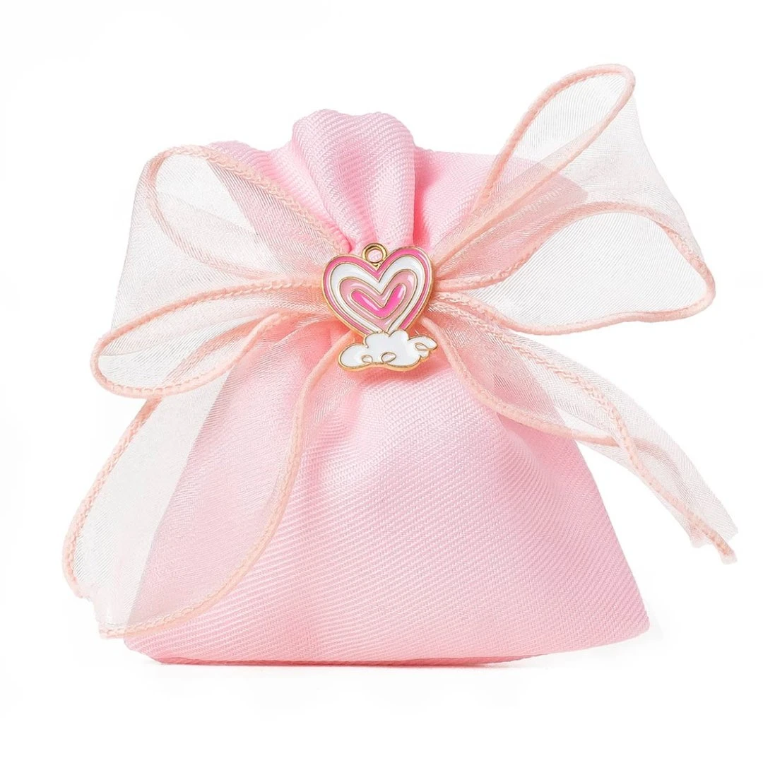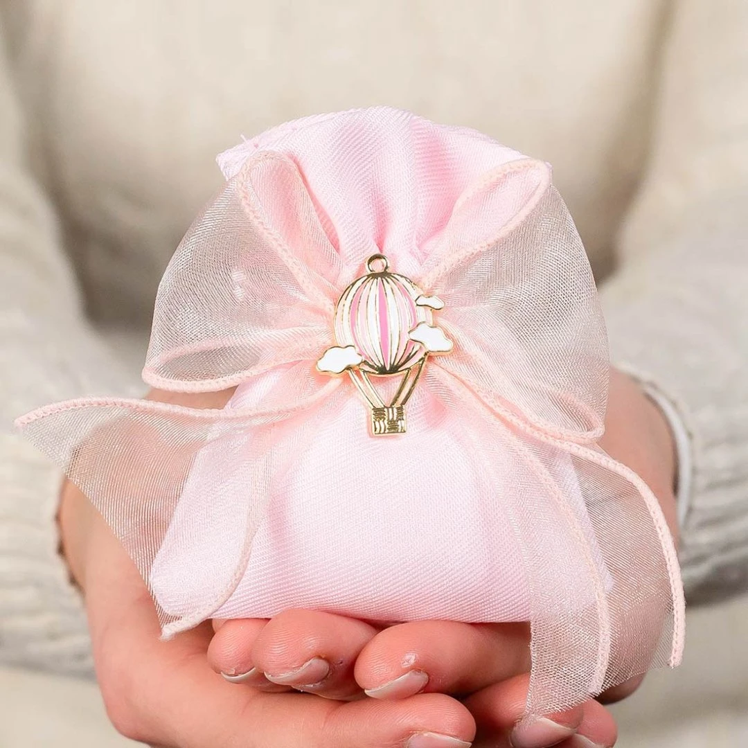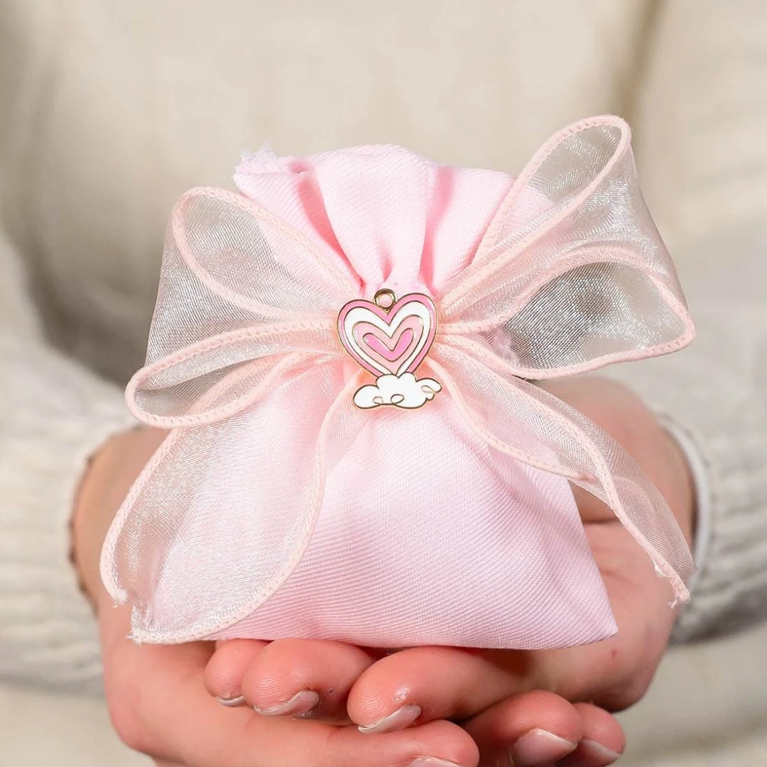 Delicato sacchettino portaconfetti della Linea Cielo, realizzato in tessuto rosa con elegante fiocco in organza e decorato con ciondolino smaltato a tema cielo. È possibile scegliere tra i due modelli disponibili: cuore oppure mongolfiera, per personalizzare la bomboniera secondo il proprio gusto. Ideale per battesimo, nascita o baby shower. Prodotto artigianale. Prezzo cadauno.